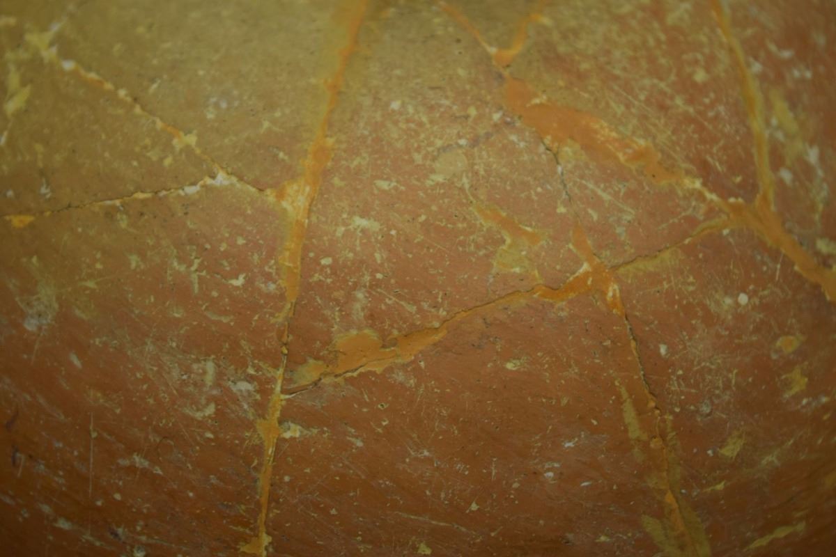 prehistoric busy black on red design has been broken and glued, 4'' x 7''