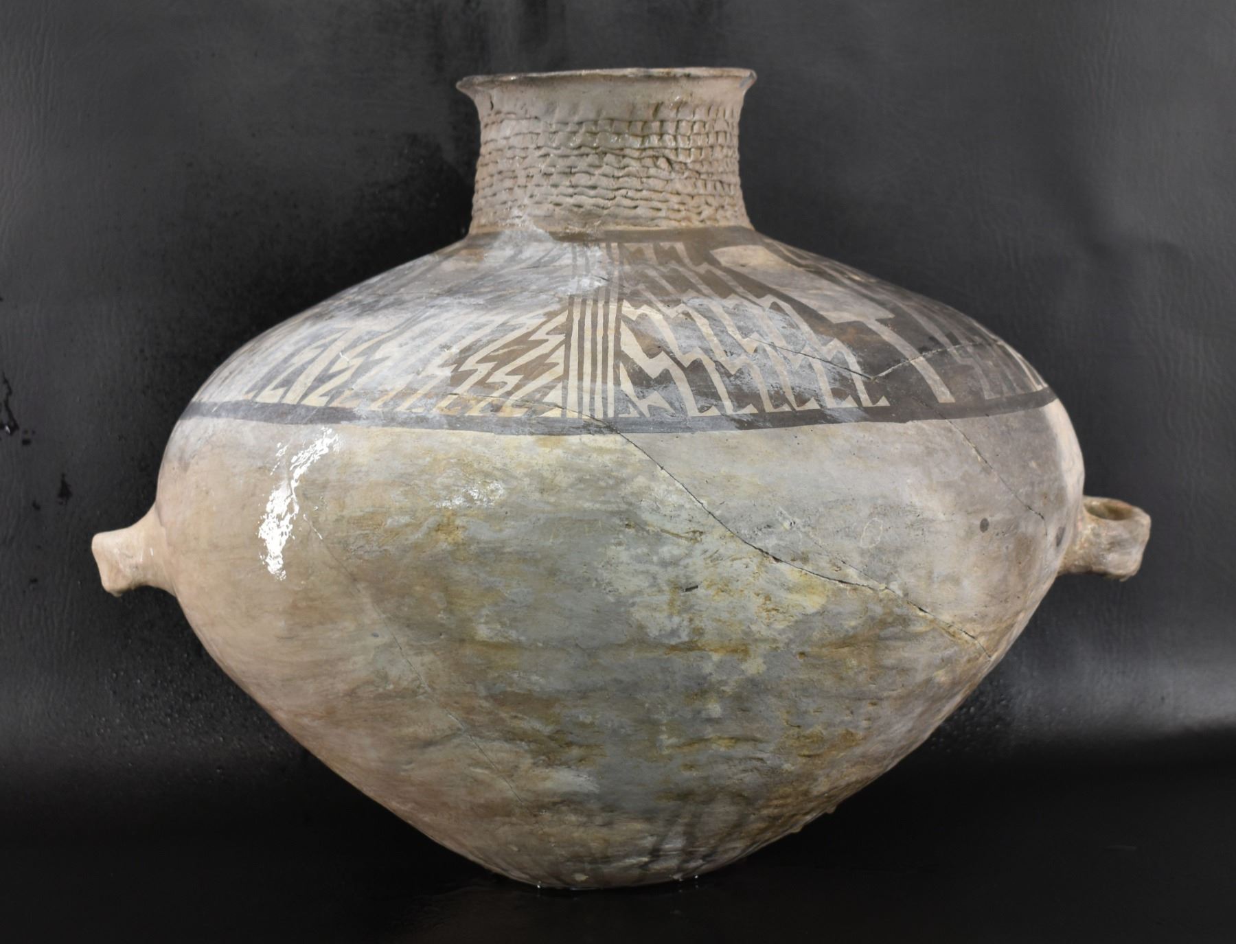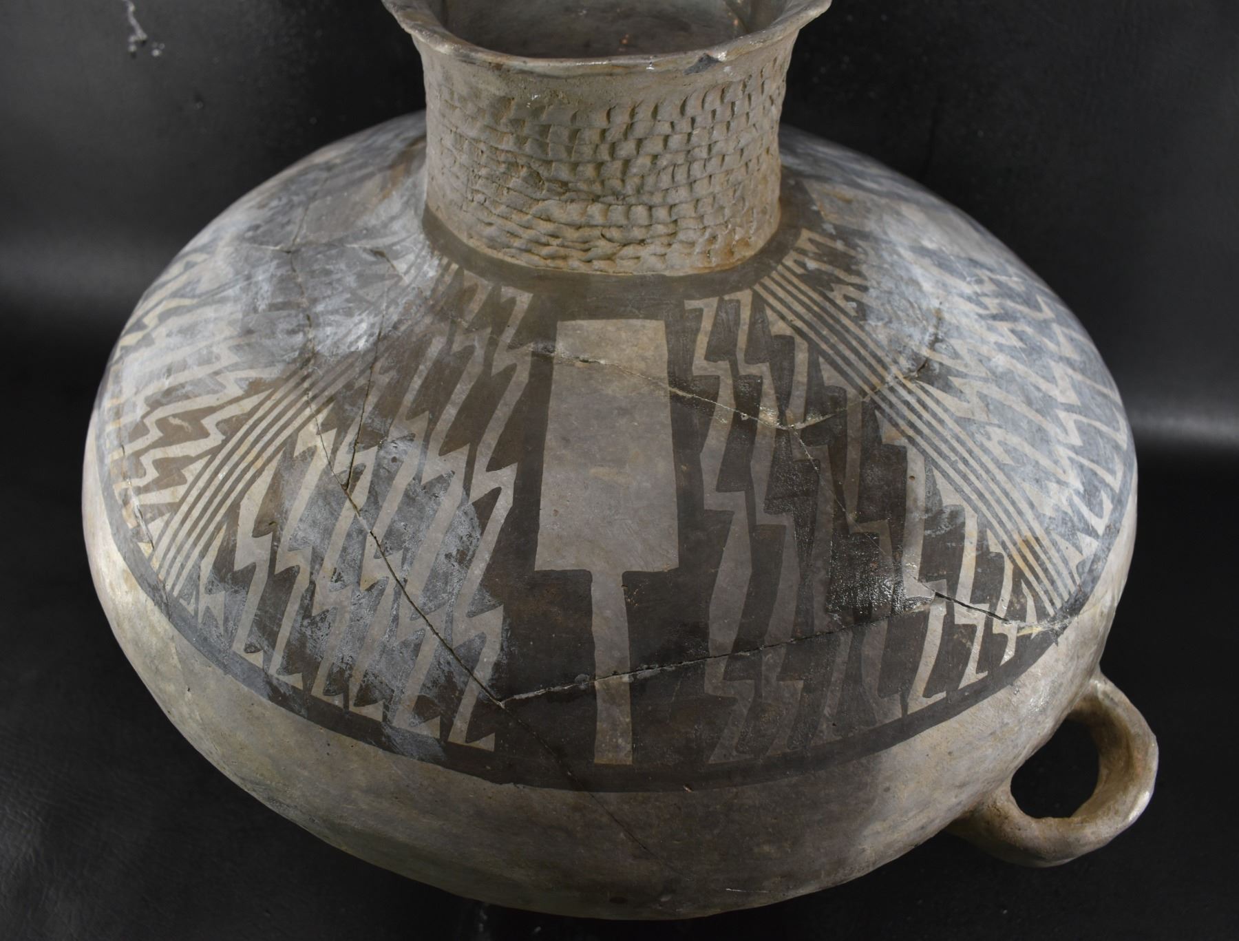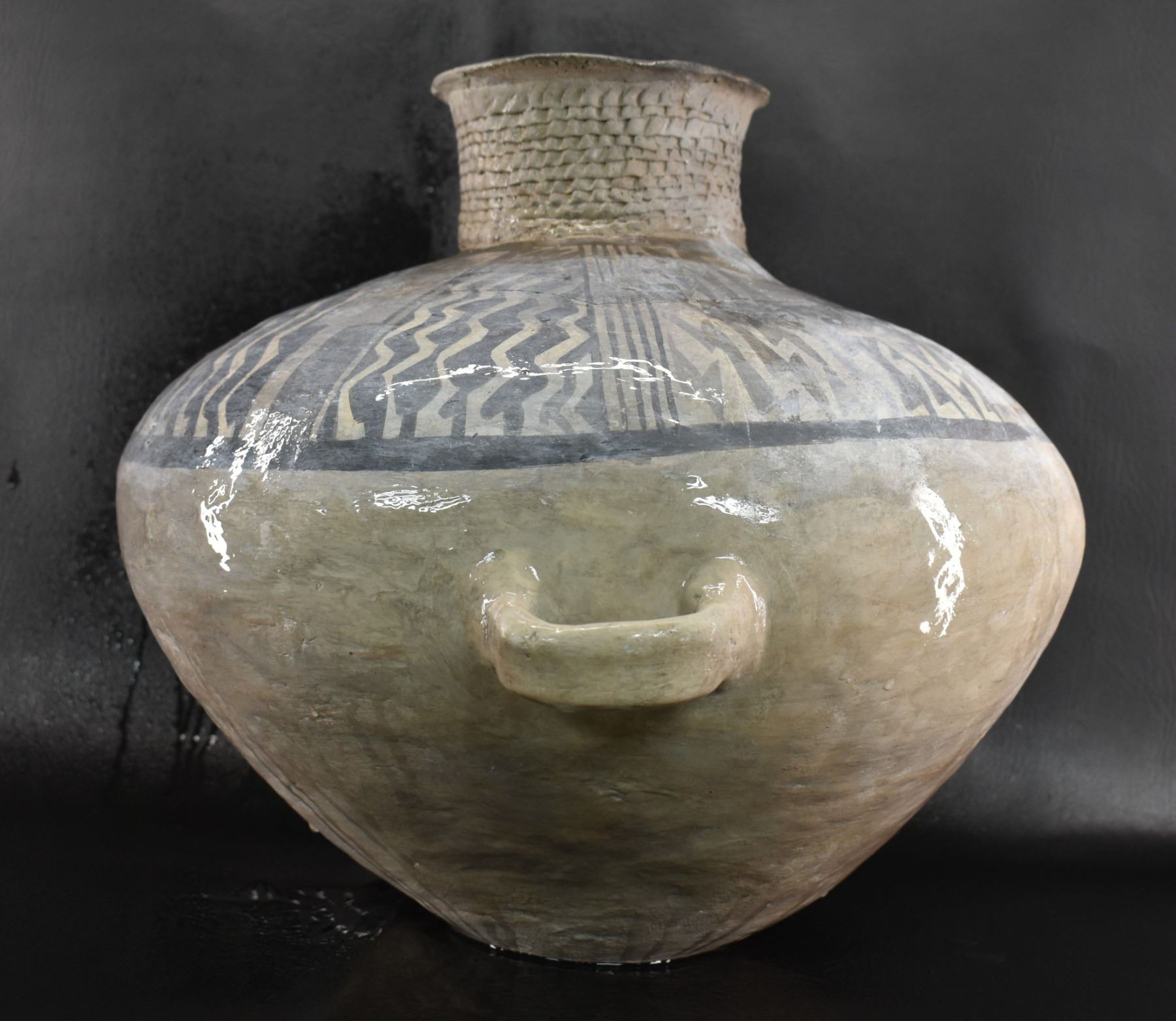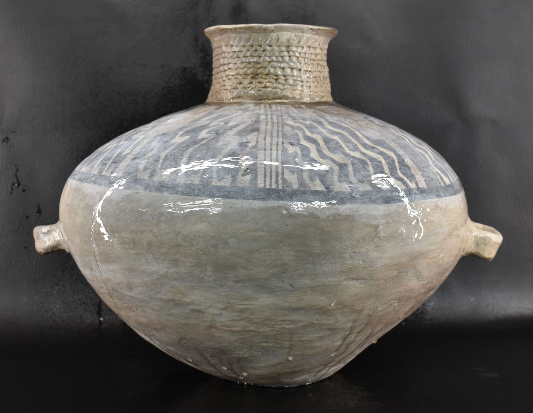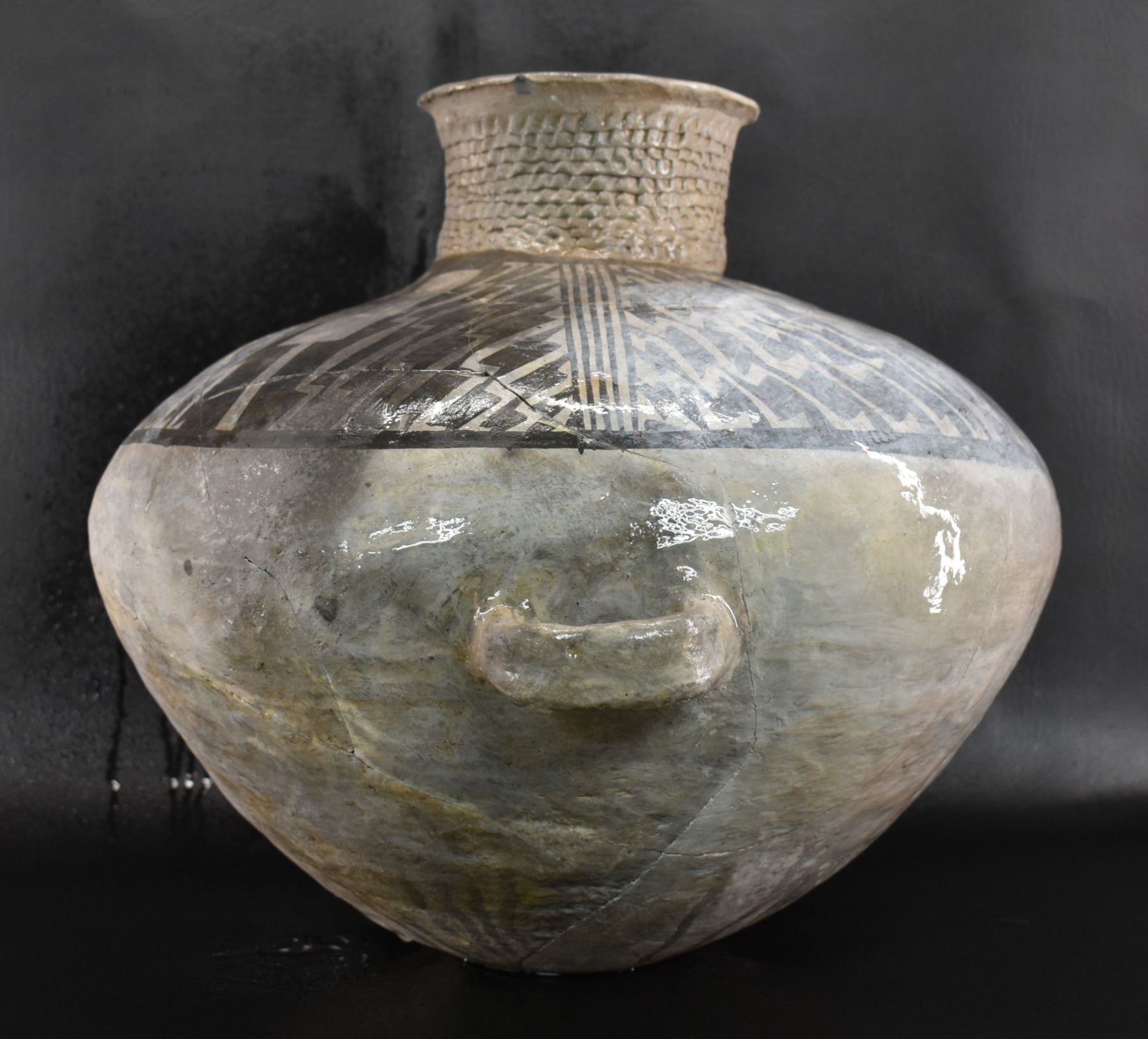 prehistoric Anasazi, hand made and painted black on white design with corrugated neck. 14" x 18" has restoration