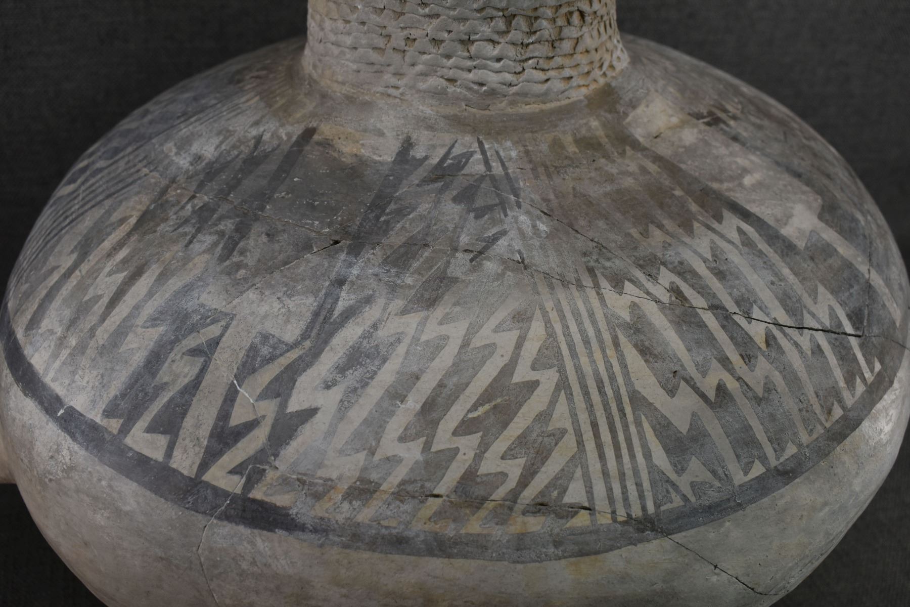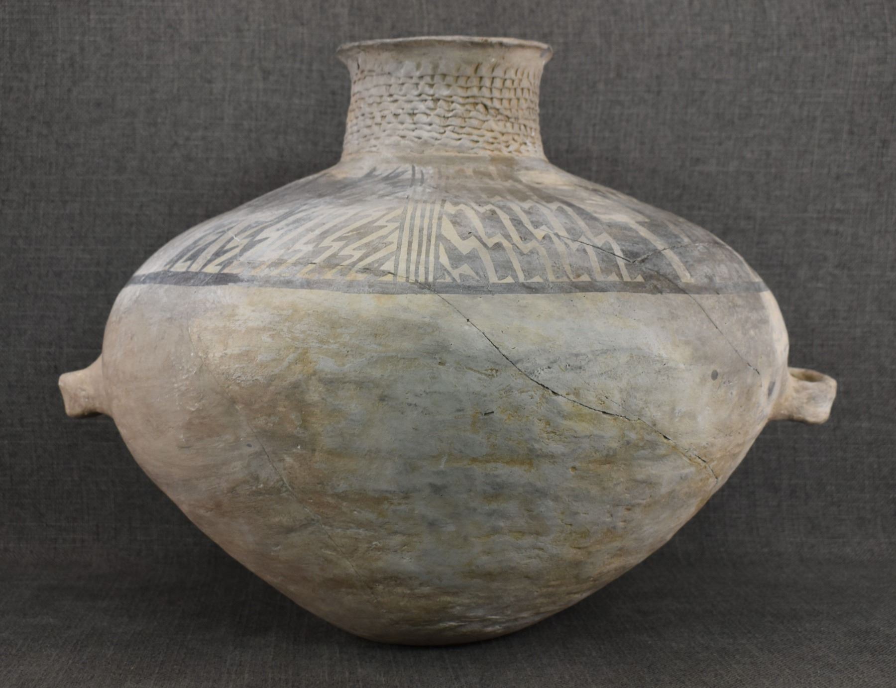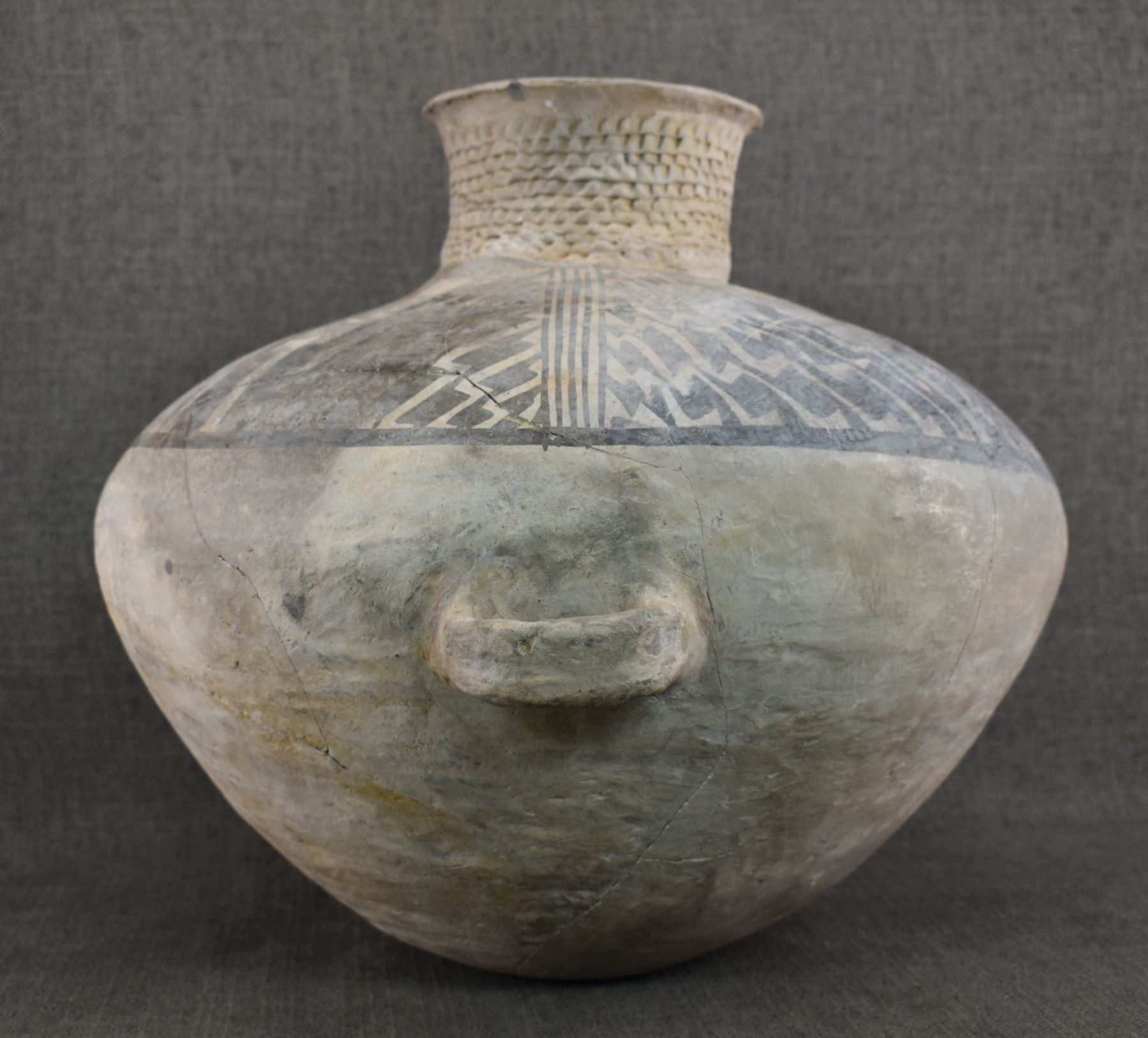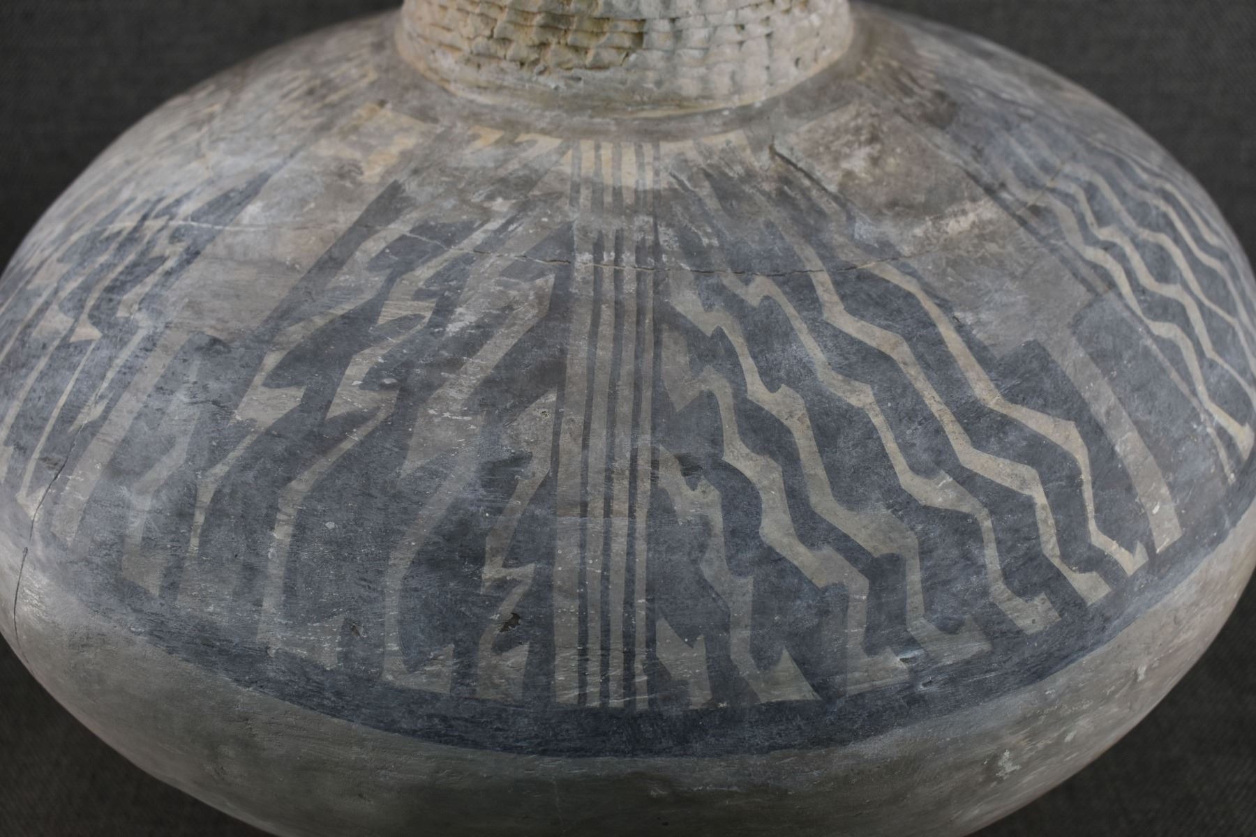 prehistoric Anasazi, hand made and painted black on white design with corrugated neck. 14" x 18" has restoration