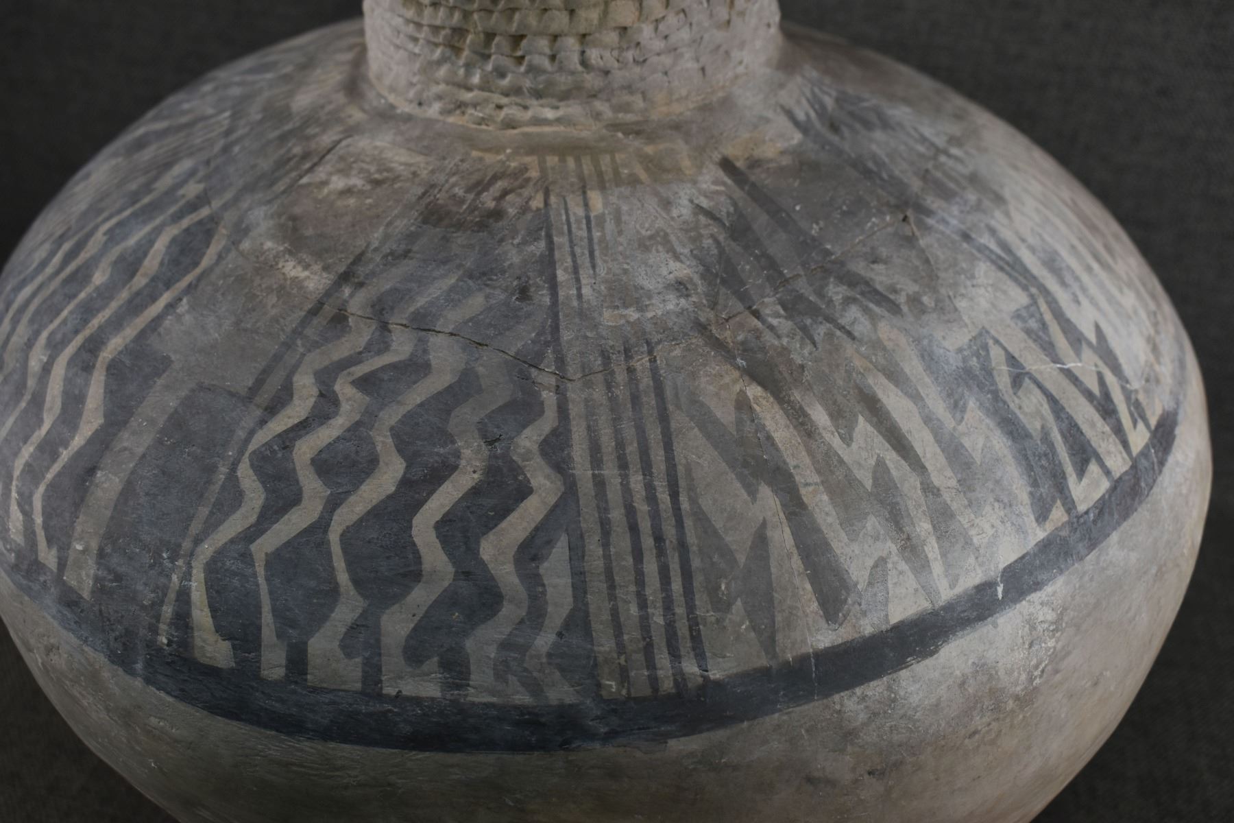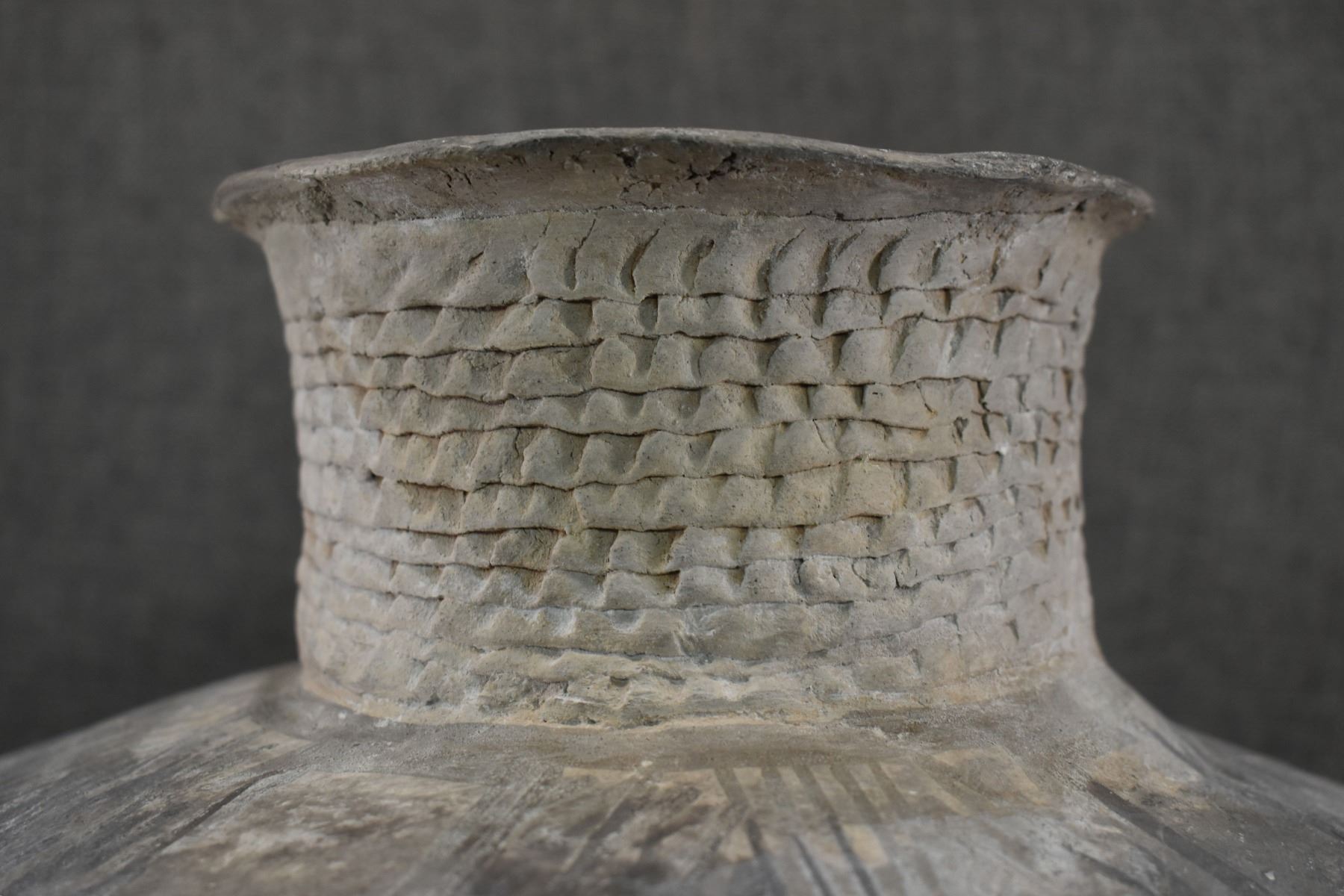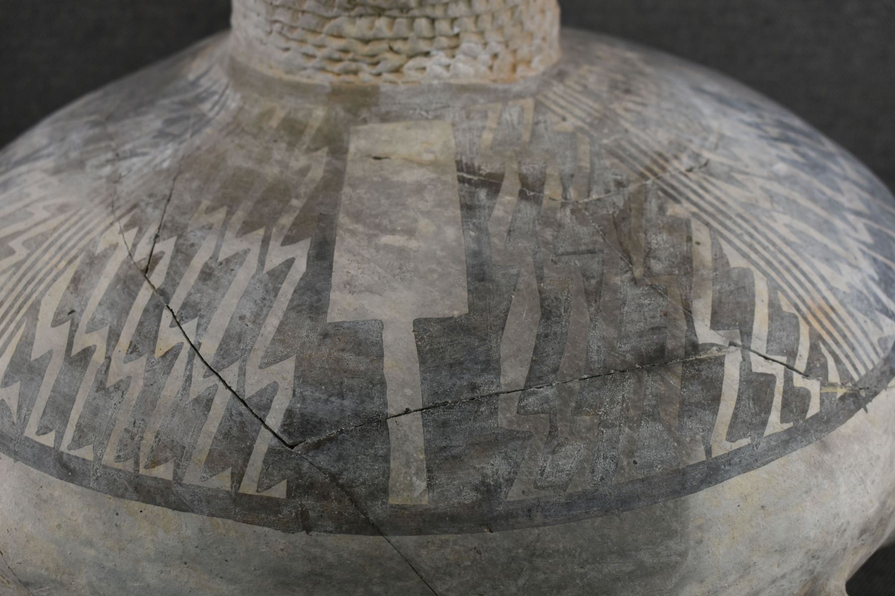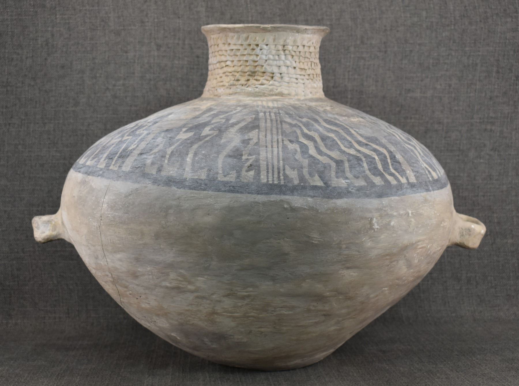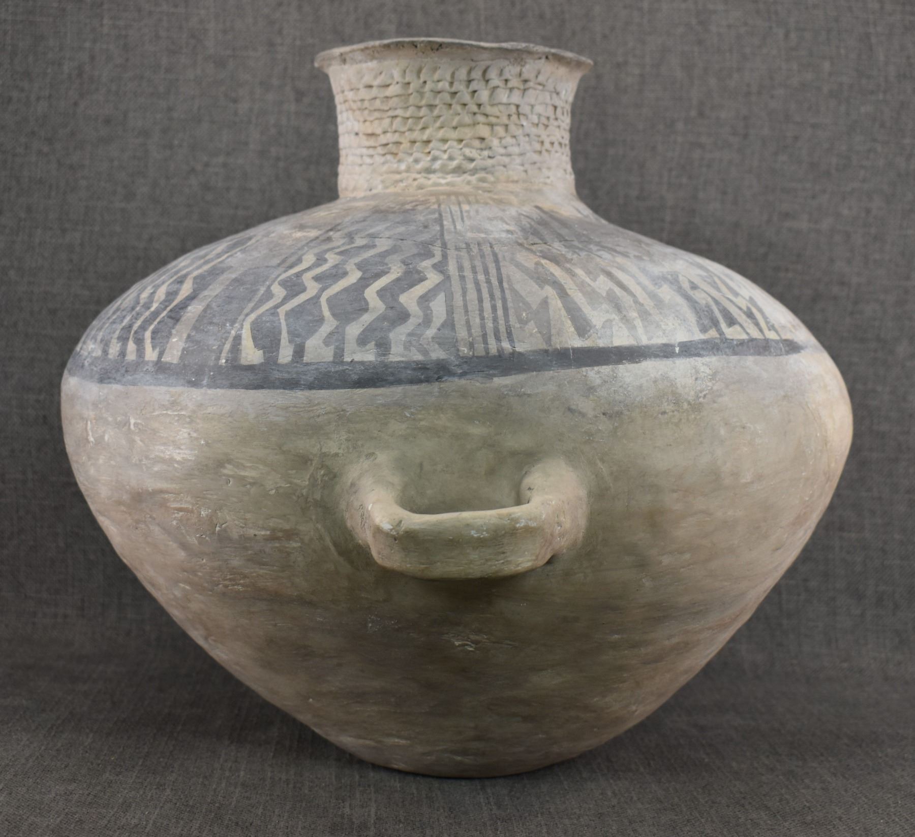prehistoric Anasazi, hand made and painted black on white design with corrugated neck. 14" x 18" has restoration