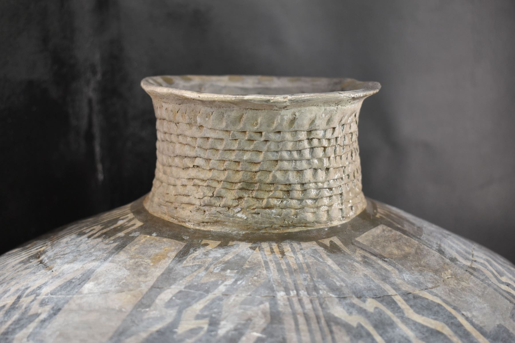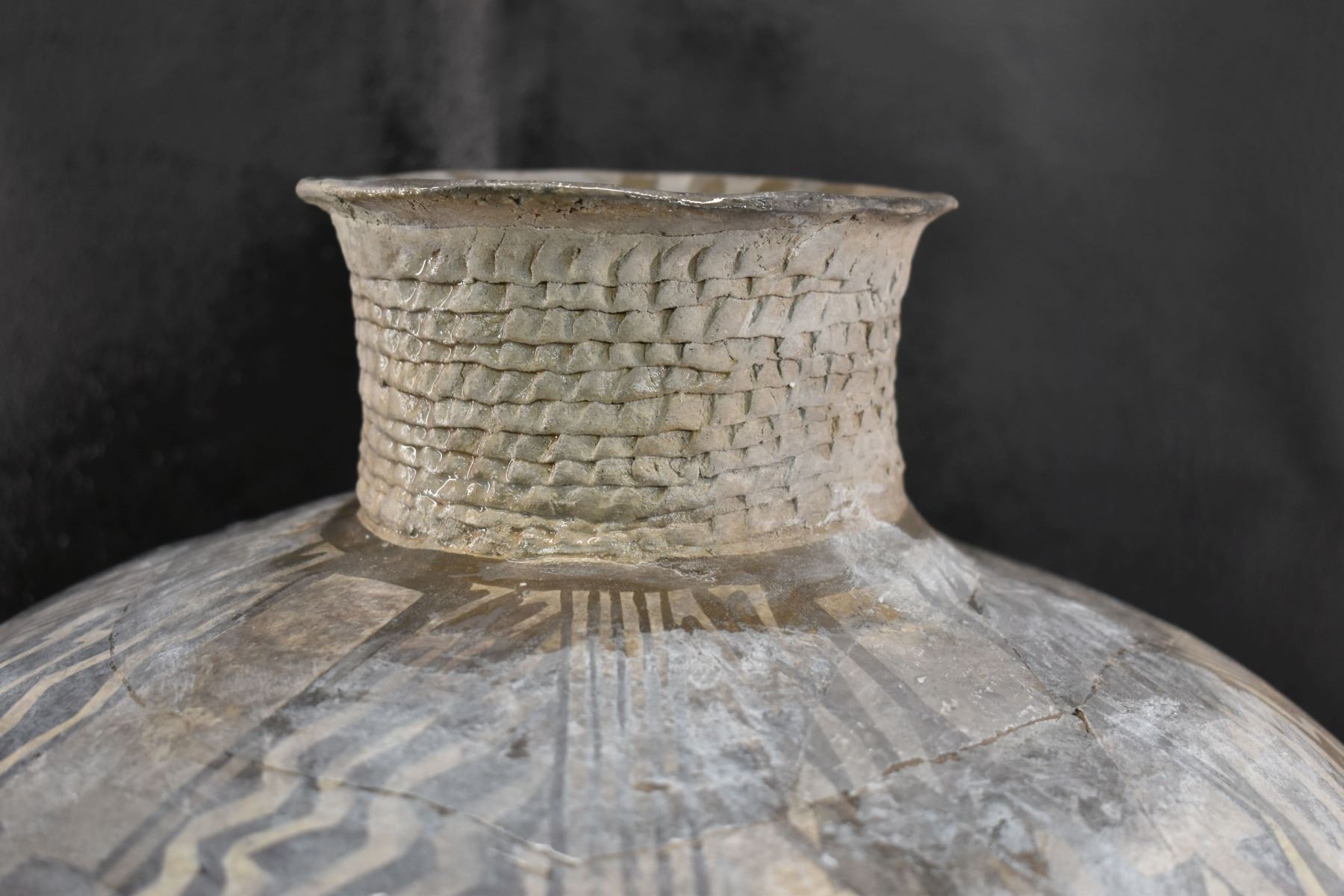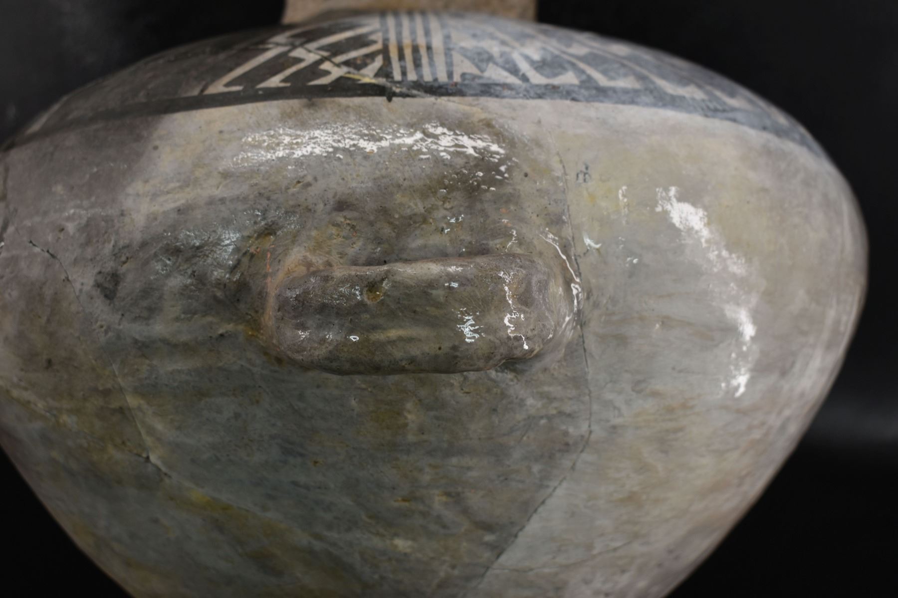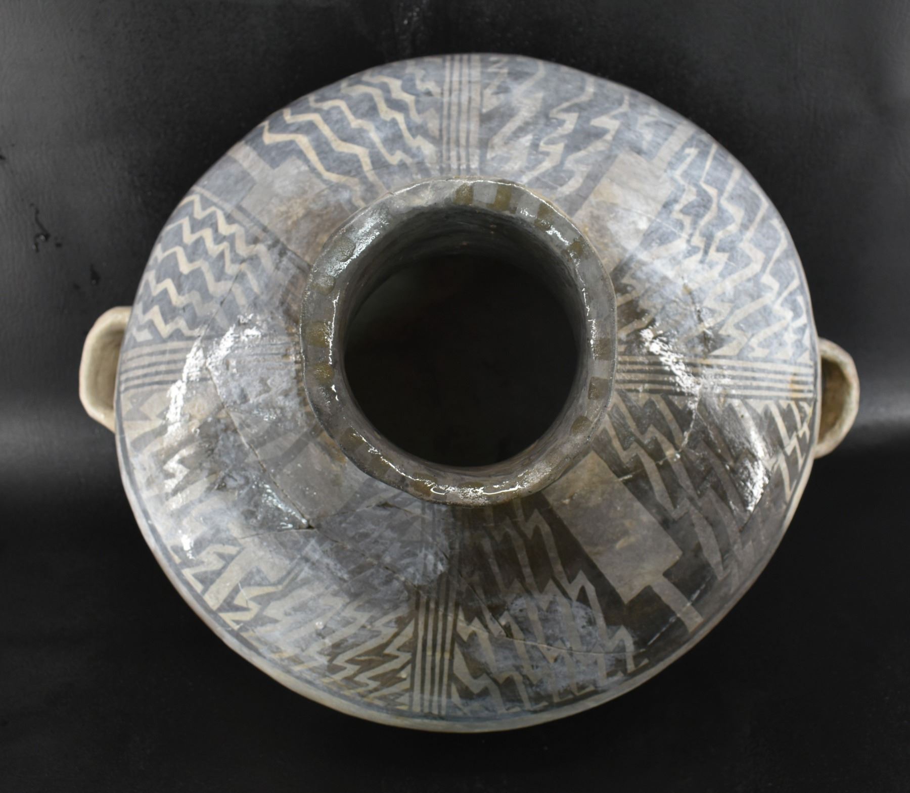 prehistoric Anasazi, hand made and painted black on white design with corrugated neck. 14" x 18" has restoration