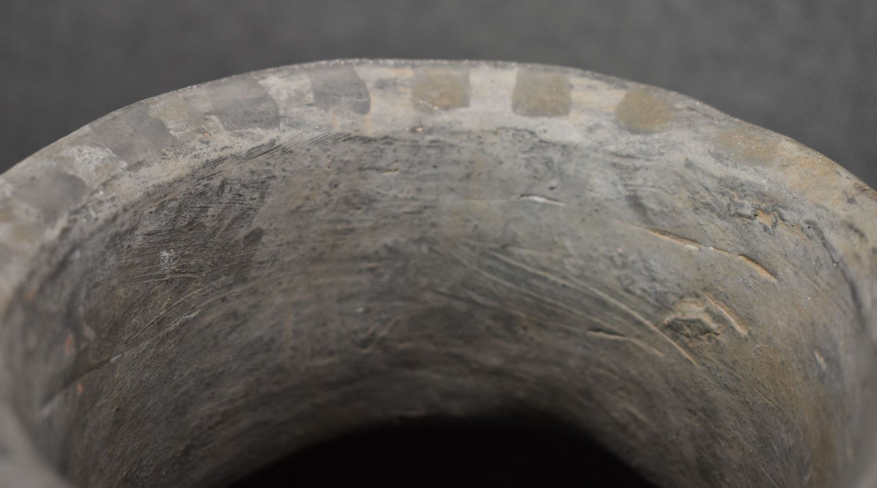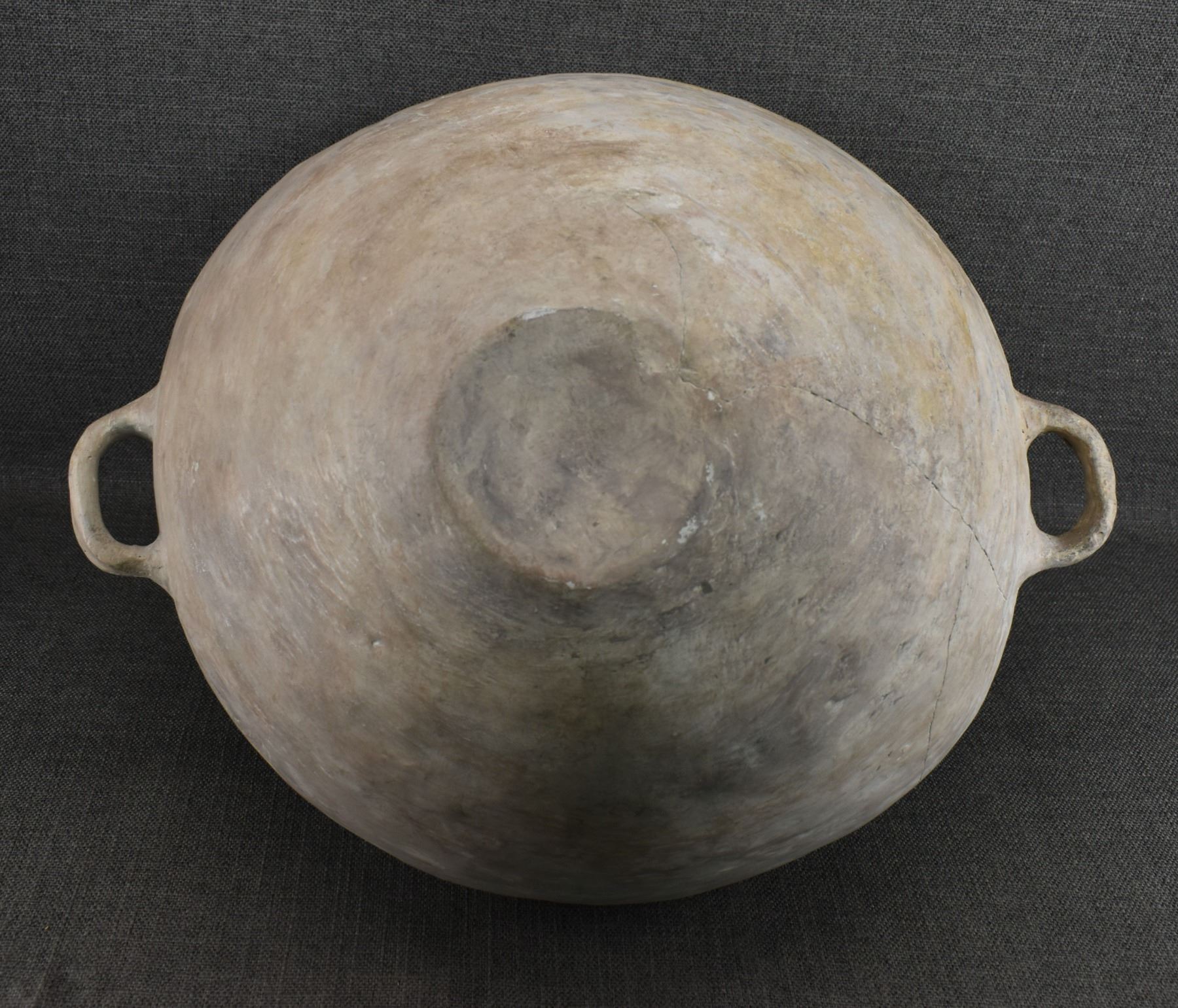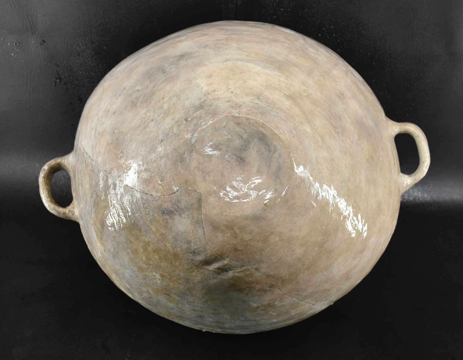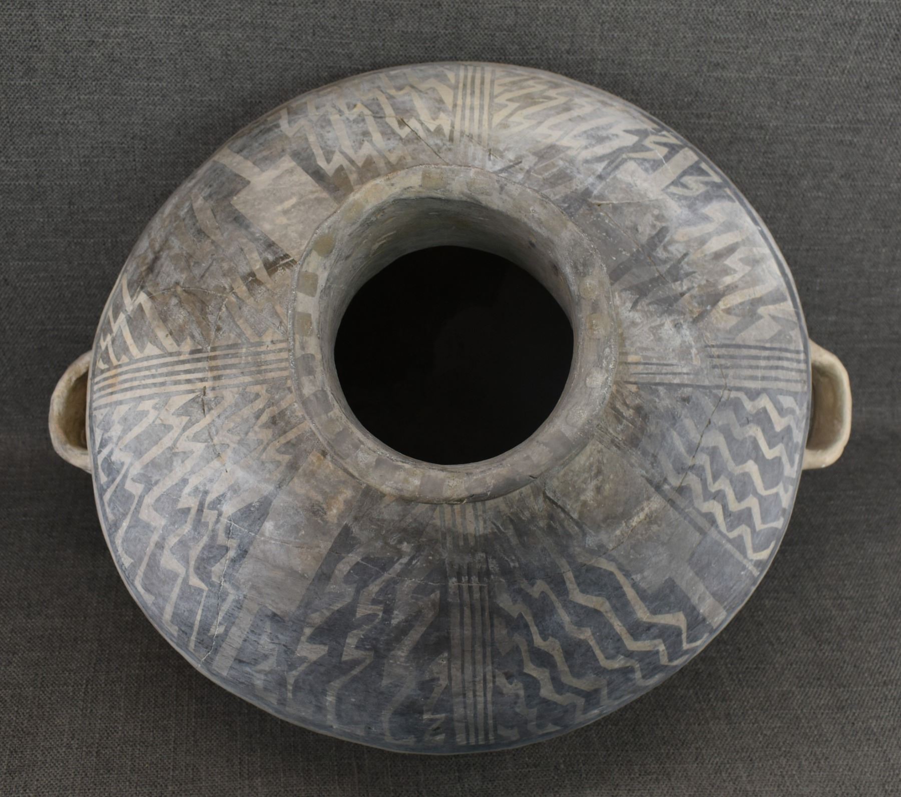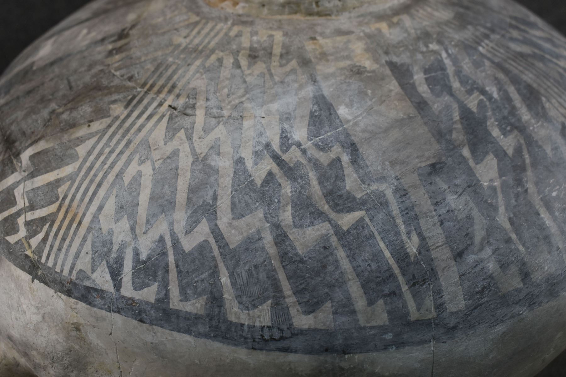 prehistoric Anasazi, hand made and painted black on white design with corrugated neck. 14" x 18" has restoration