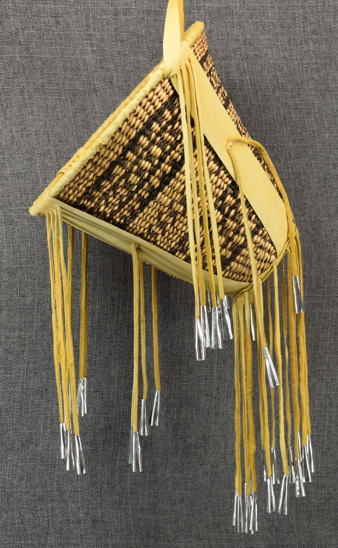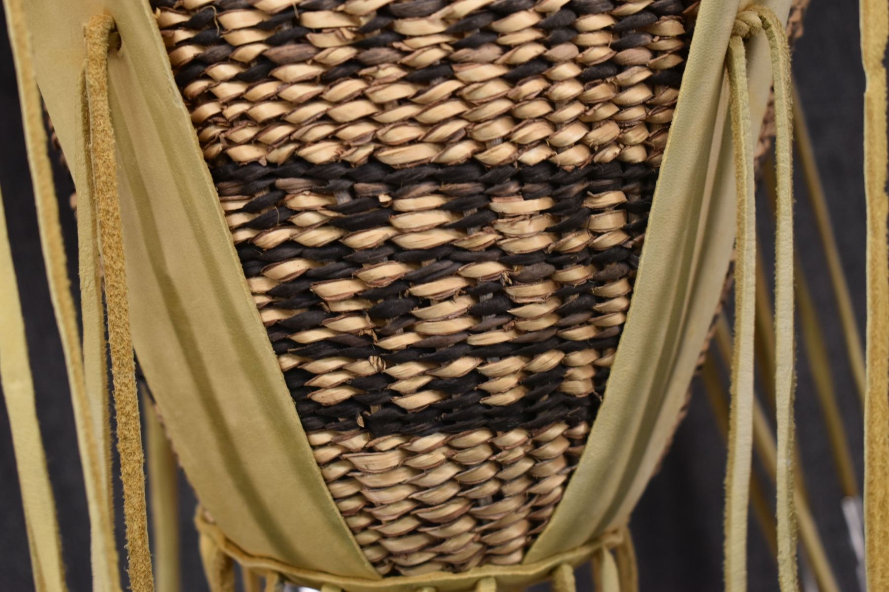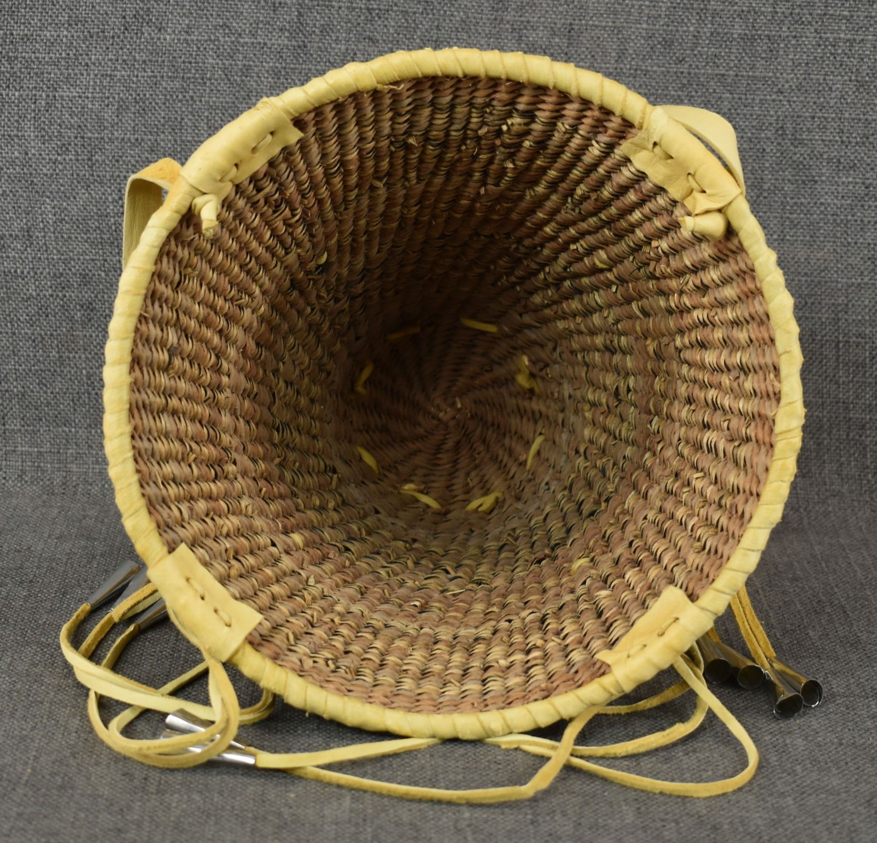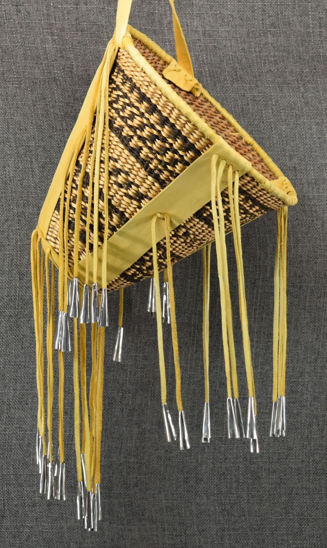 1970's Apache. Hand woven banded design burden basket. 18'' x 9''