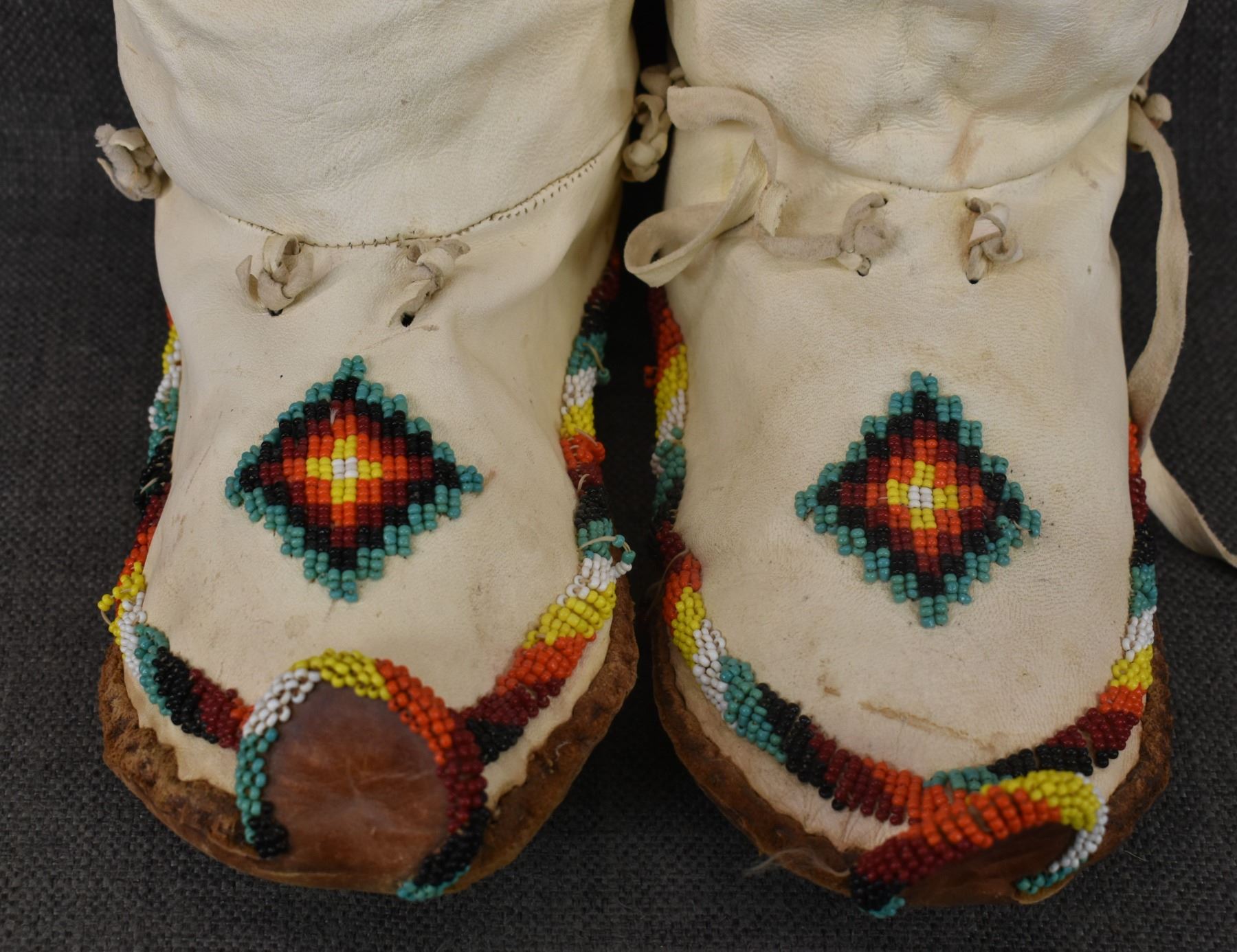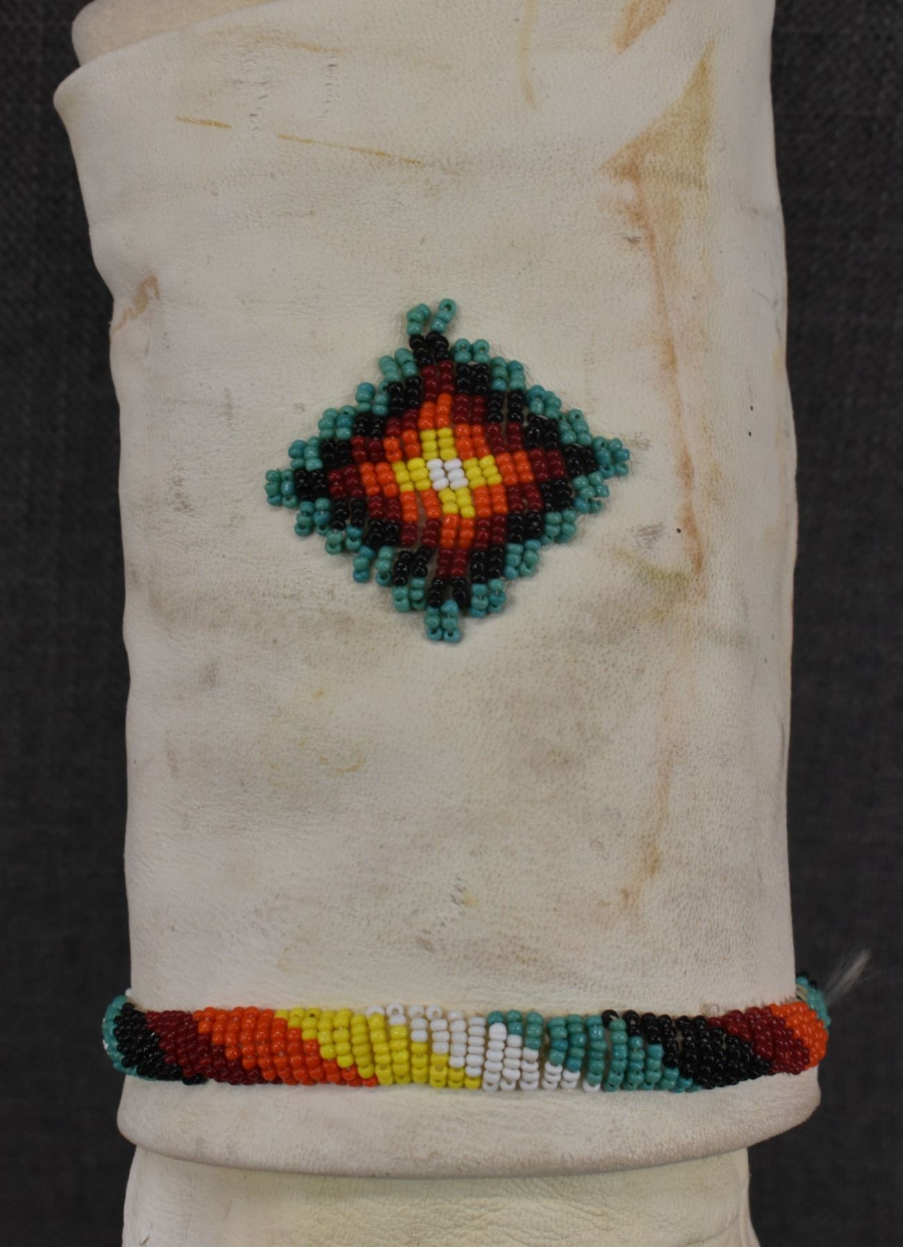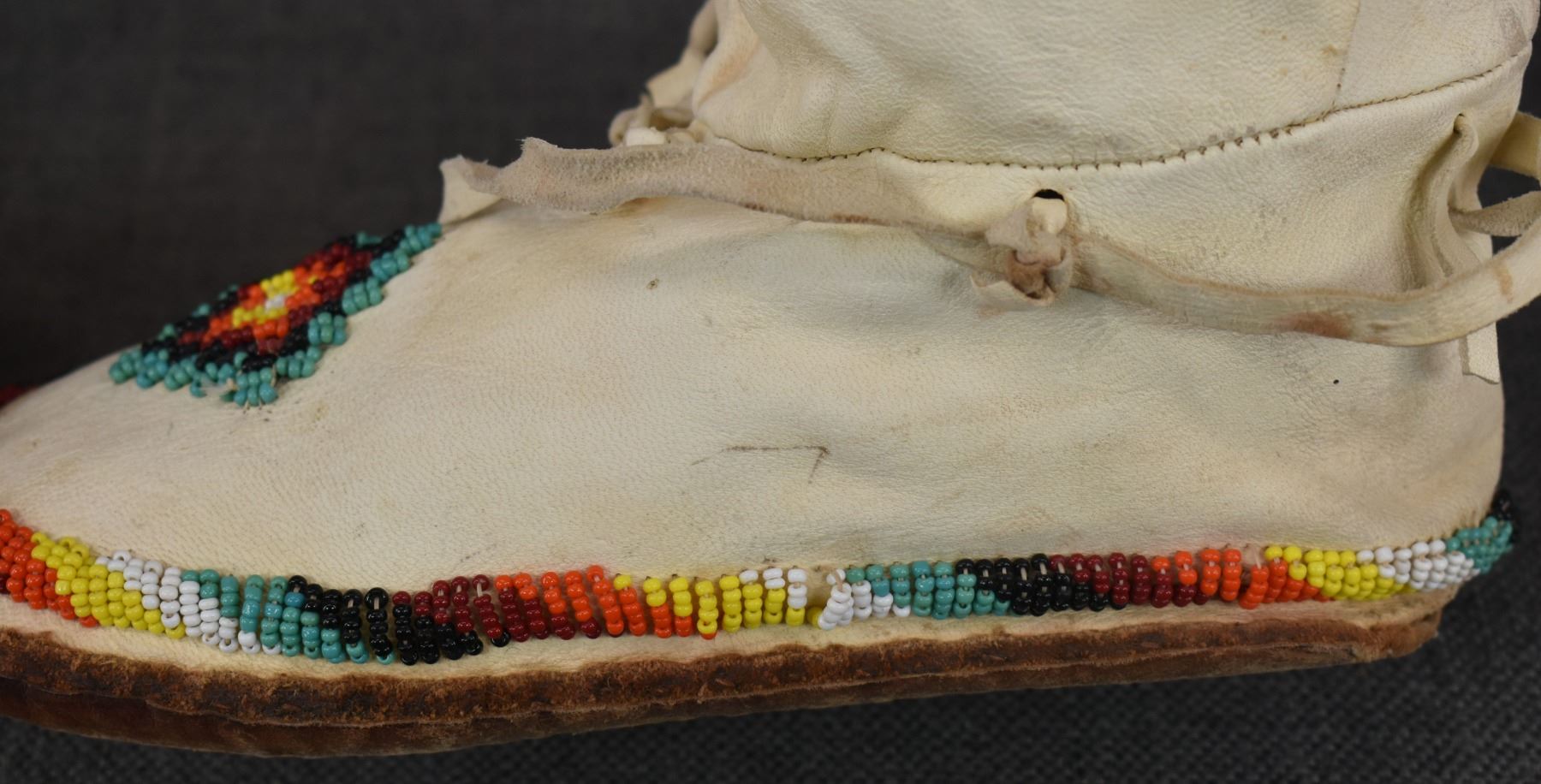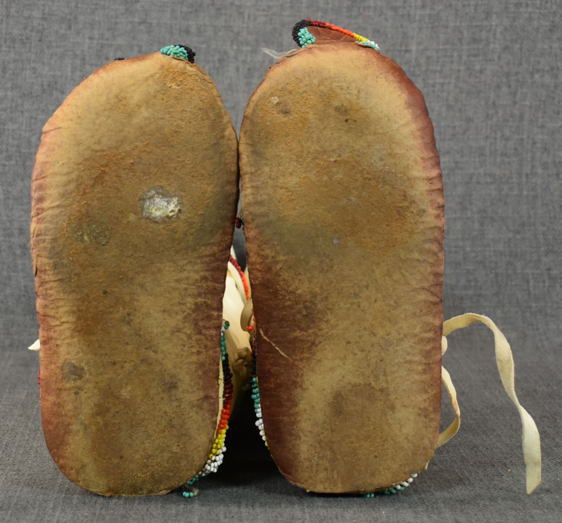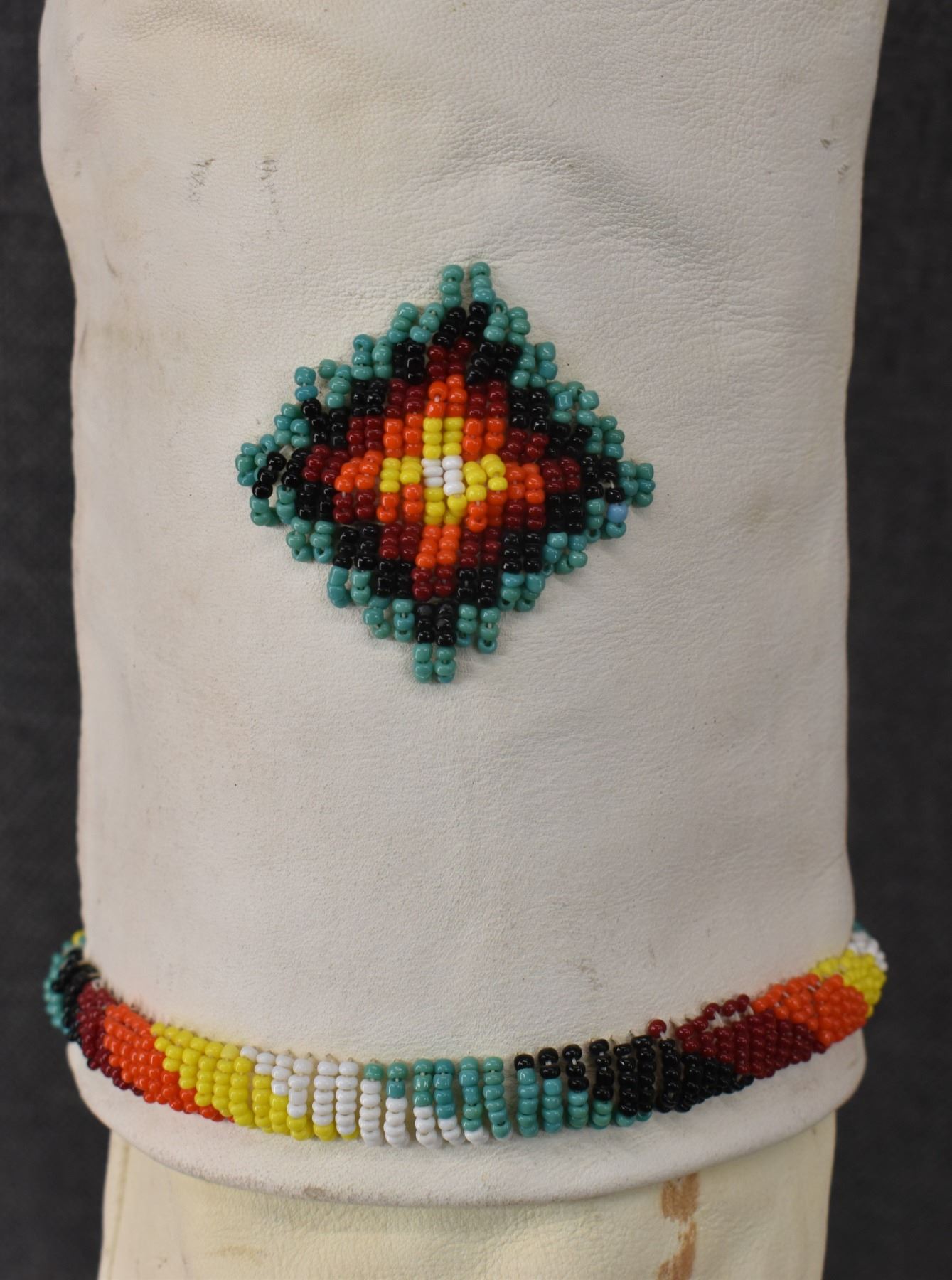 20th century Apache, hand made from commercial tanned leather with sinew sown beaded design, 14" x 9" x 4".