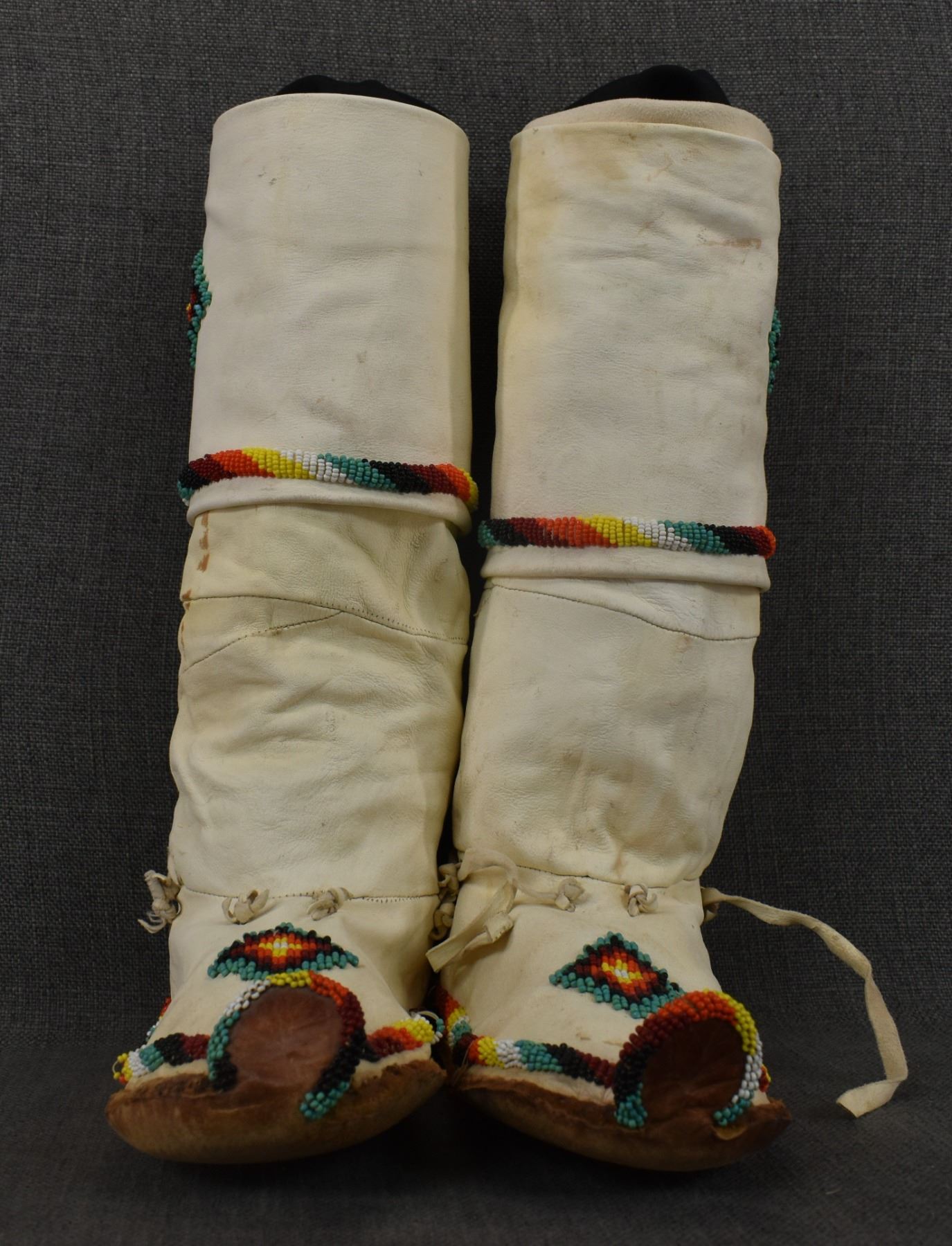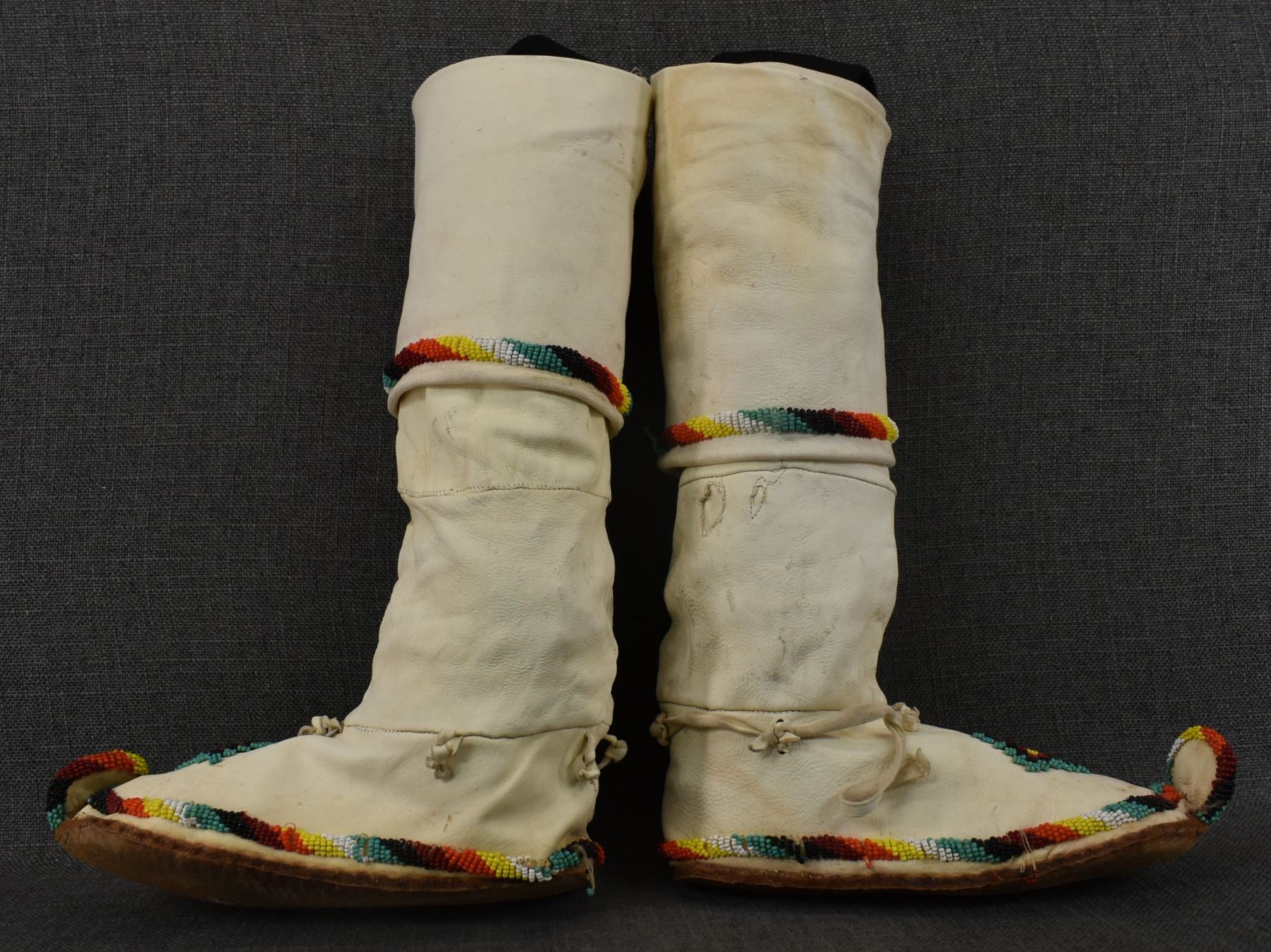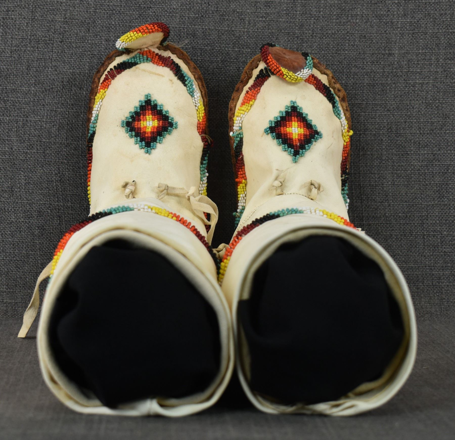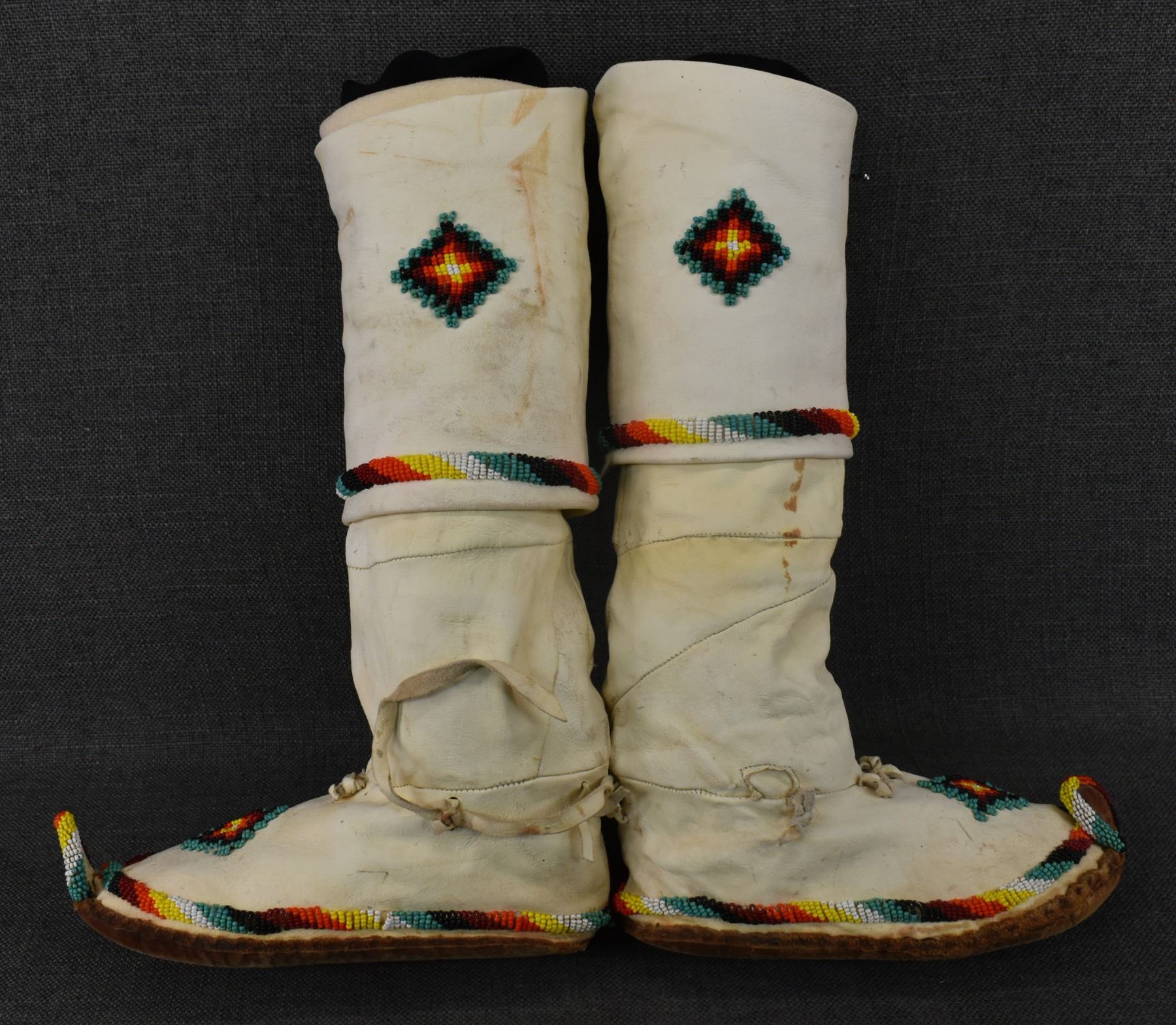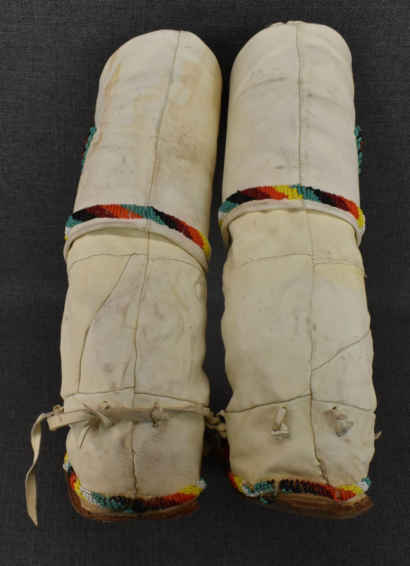 20th century Apache, hand made from commercial tanned leather with sinew sown beaded design, 14" x 9" x 4".