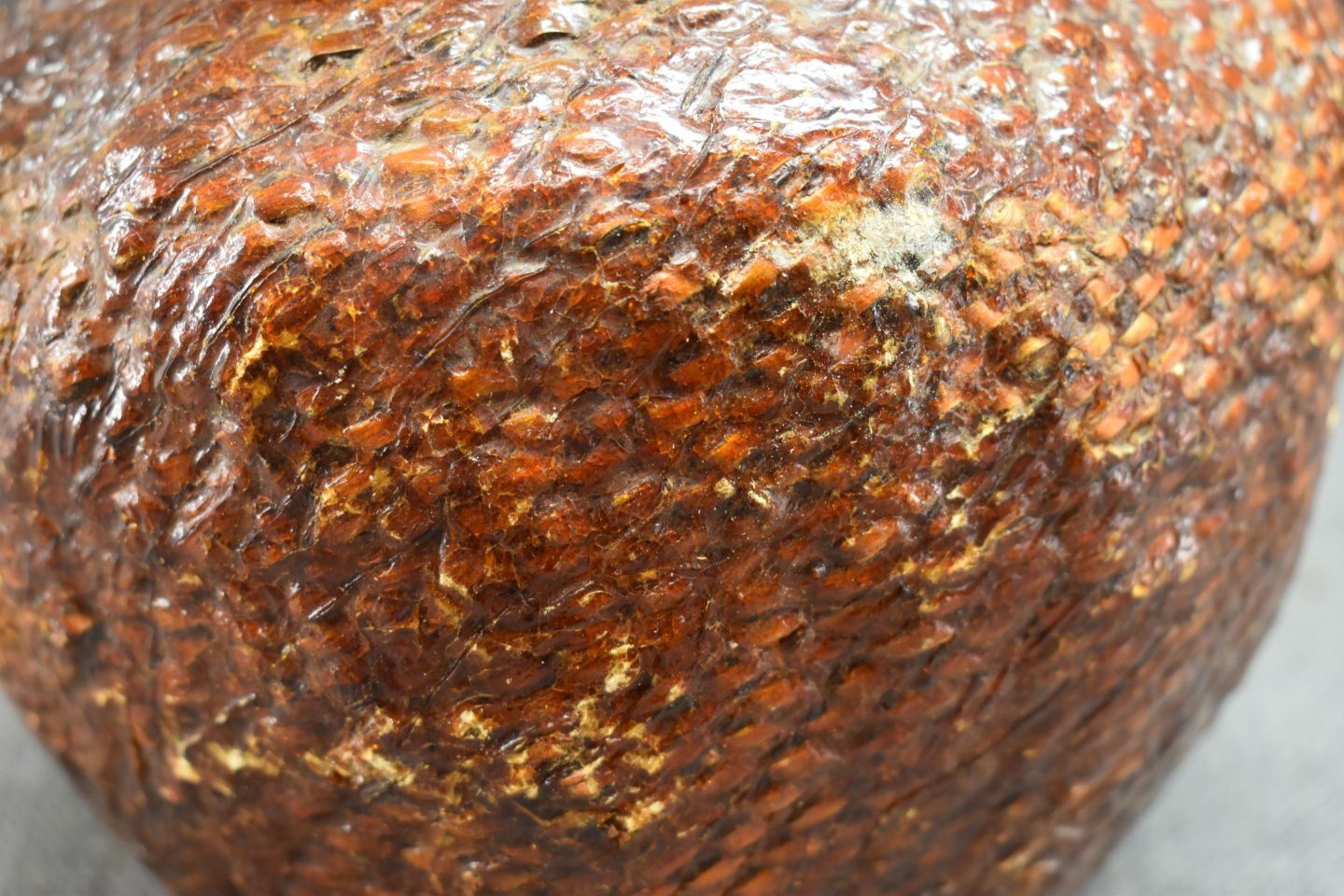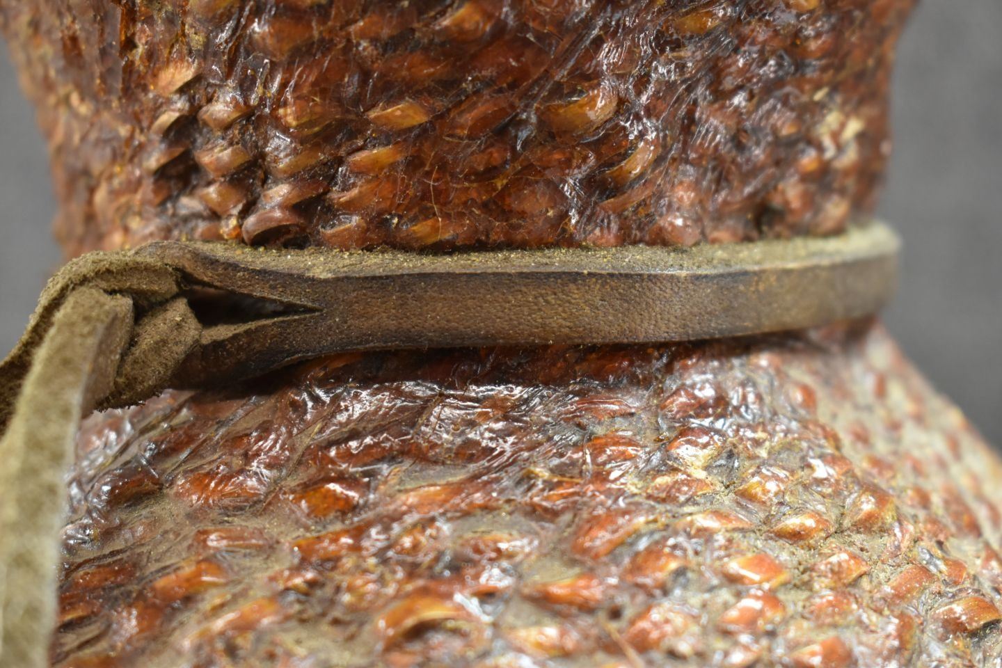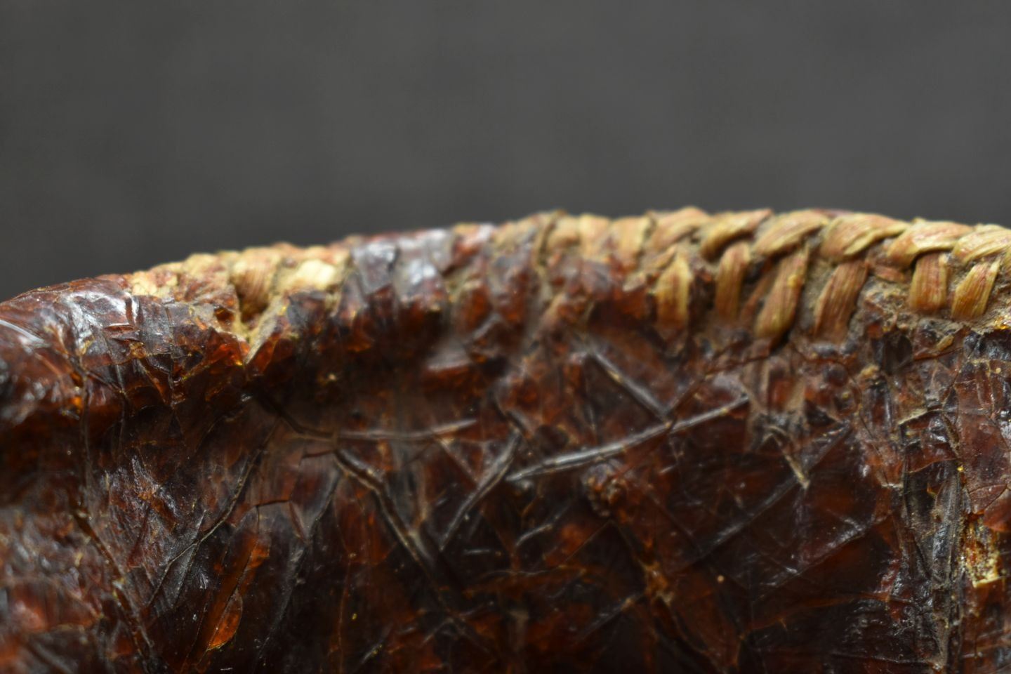 1970's Apache. Hand woven double lobe pitch covered basket. 14'' x 7''