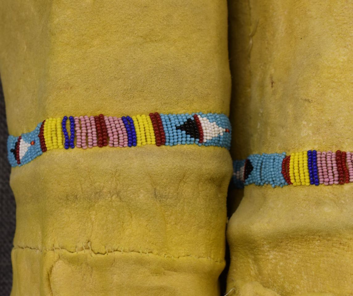 1960's Apache thread sewn beaded design on native tanned leather high-top moccasins. 28'' x 10'' x 4''