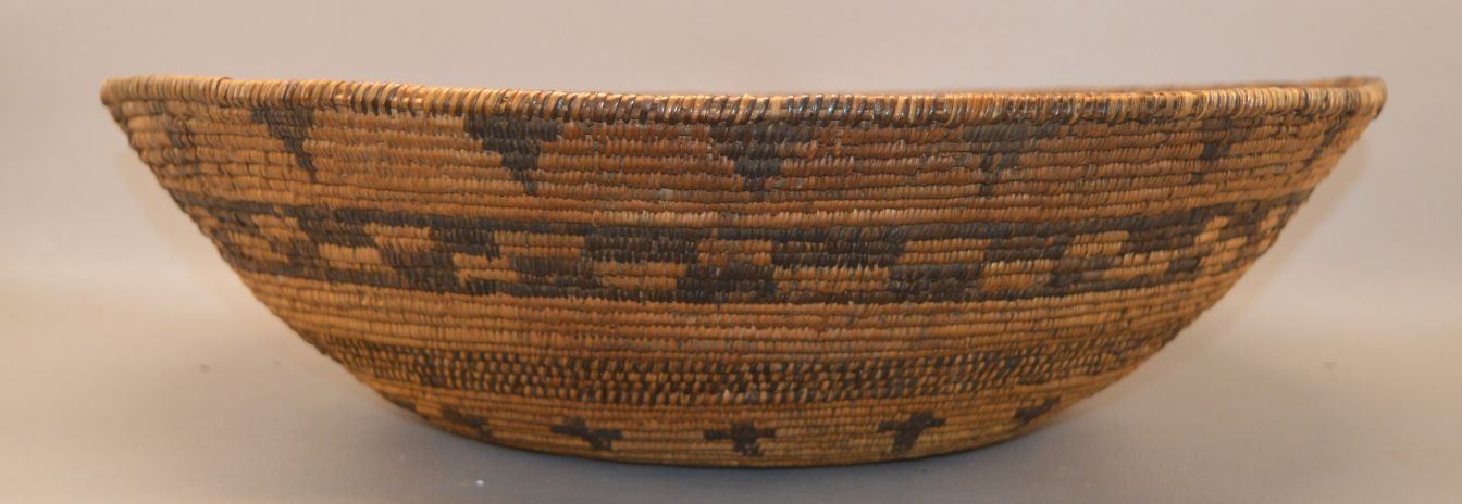 1920's Apache Indian, hand woven geometric an banded design basketry bowl. 5'' x 20'' has minor stitch loss