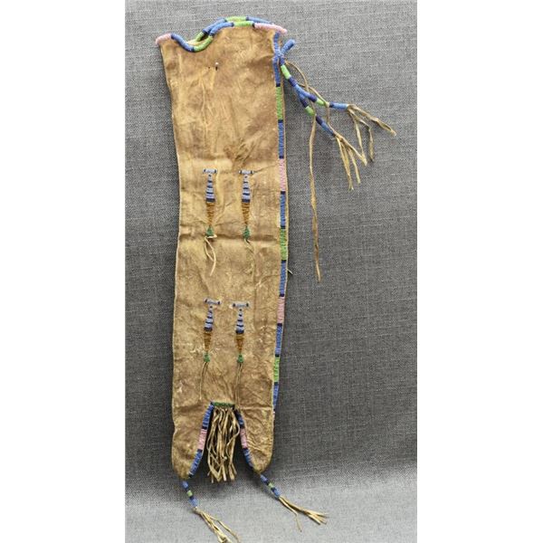 1900's Crow Indian. Sinew sewn beaded design on native tanned hide Tobacco Bag. 27'' x 5.5''