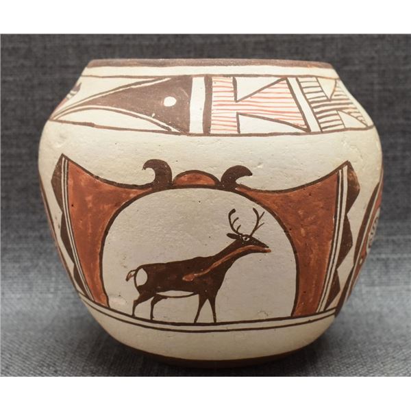 1970's Zuni Indian hand coiled and painted heartline deer and floral design, signed Effa Boone. 5'' x 6''