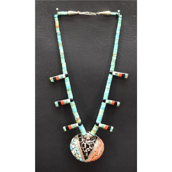 1980's Santo Domingo Indian. Turquoise necklace 20'' long. Sterling turquoise and sterling silver pendent 2.5'' x 3.25''...
