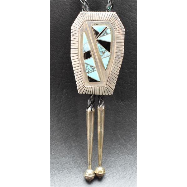 1980's Navajo Indian. Sterling silver turquoise and jet bolo 2.25'' x 1.5'' signed with unknown hallmark. Total weight 56 grams