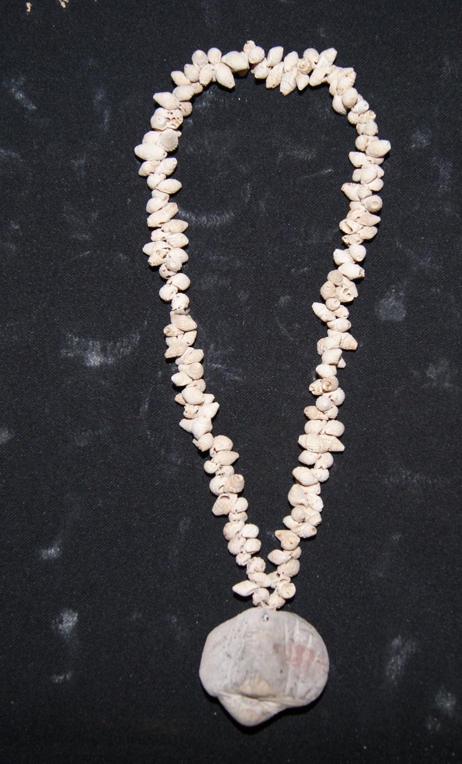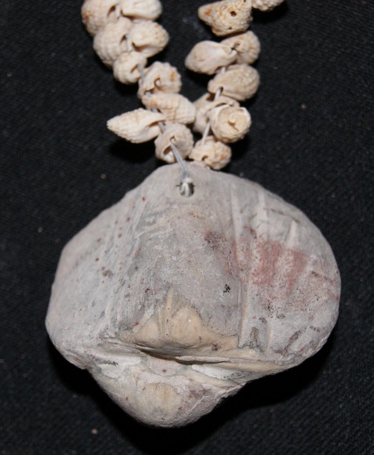 prehistoric with pump drilled pendant necklace, 16" long, pendant 1.5" x 1.5"
