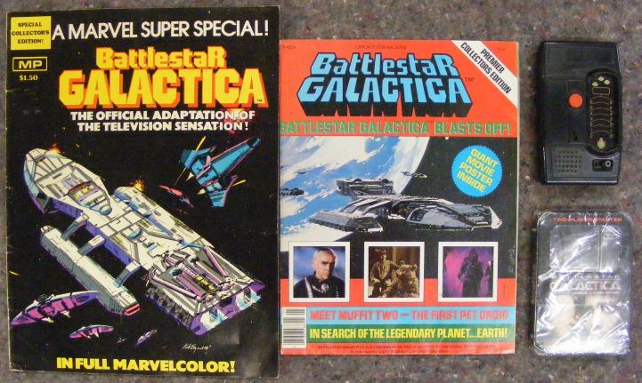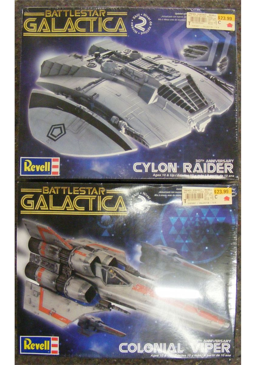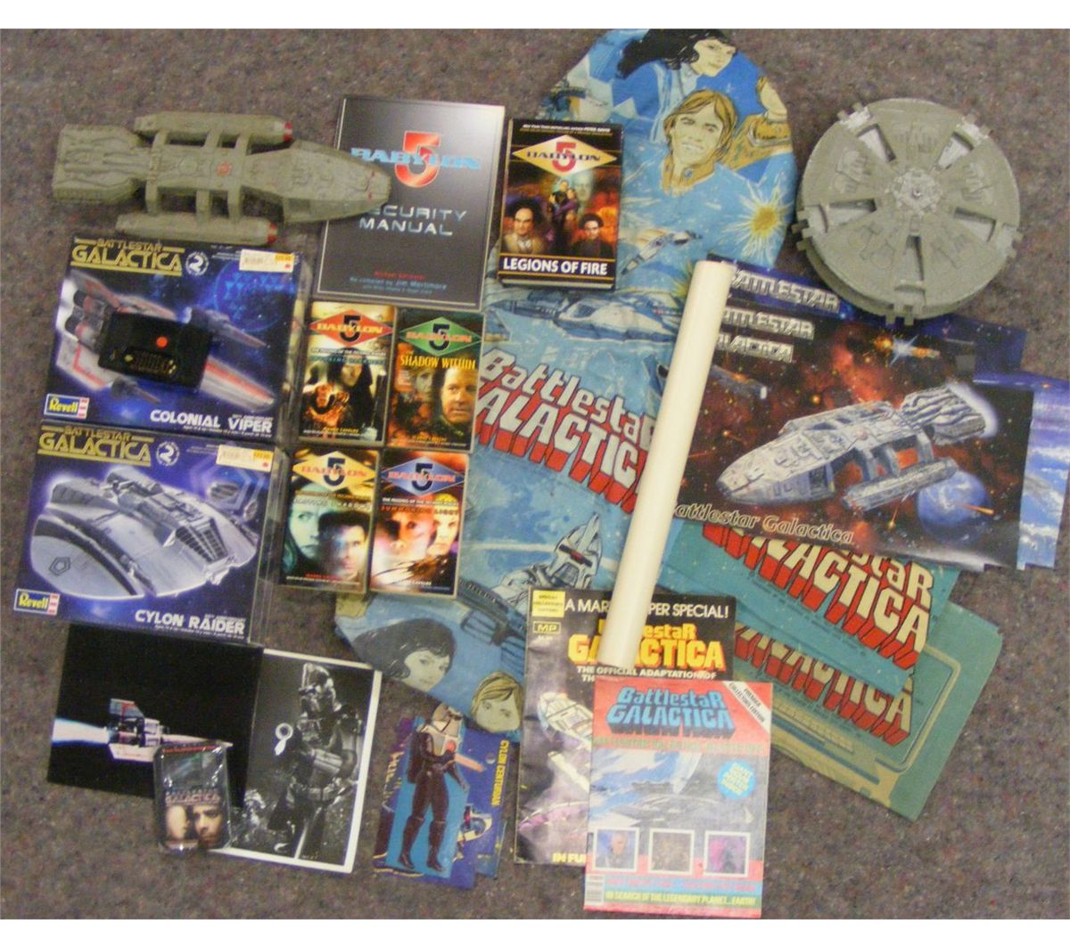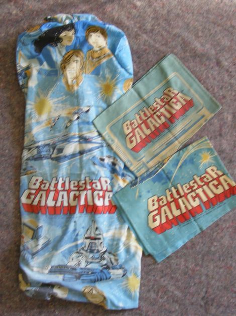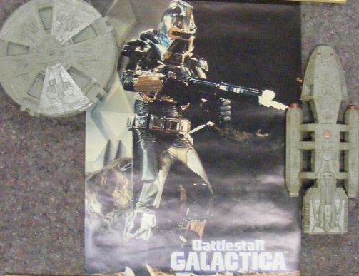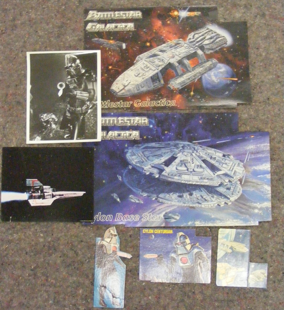 1978-1997 22 total, 7 books, 1 Cyclon raider model ship, 1 colonial Viper model ship, both new in boxes, both 12'x10"x4" 2 battlestar galactica games, 1 twin size sheet 2 pillowcases and various cut out figures and posters
