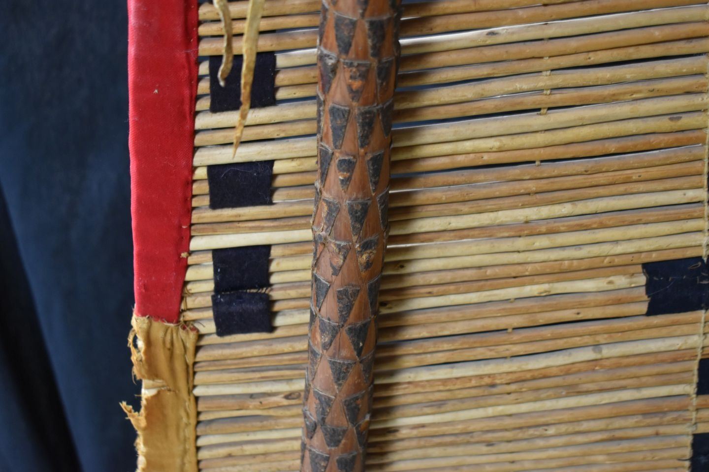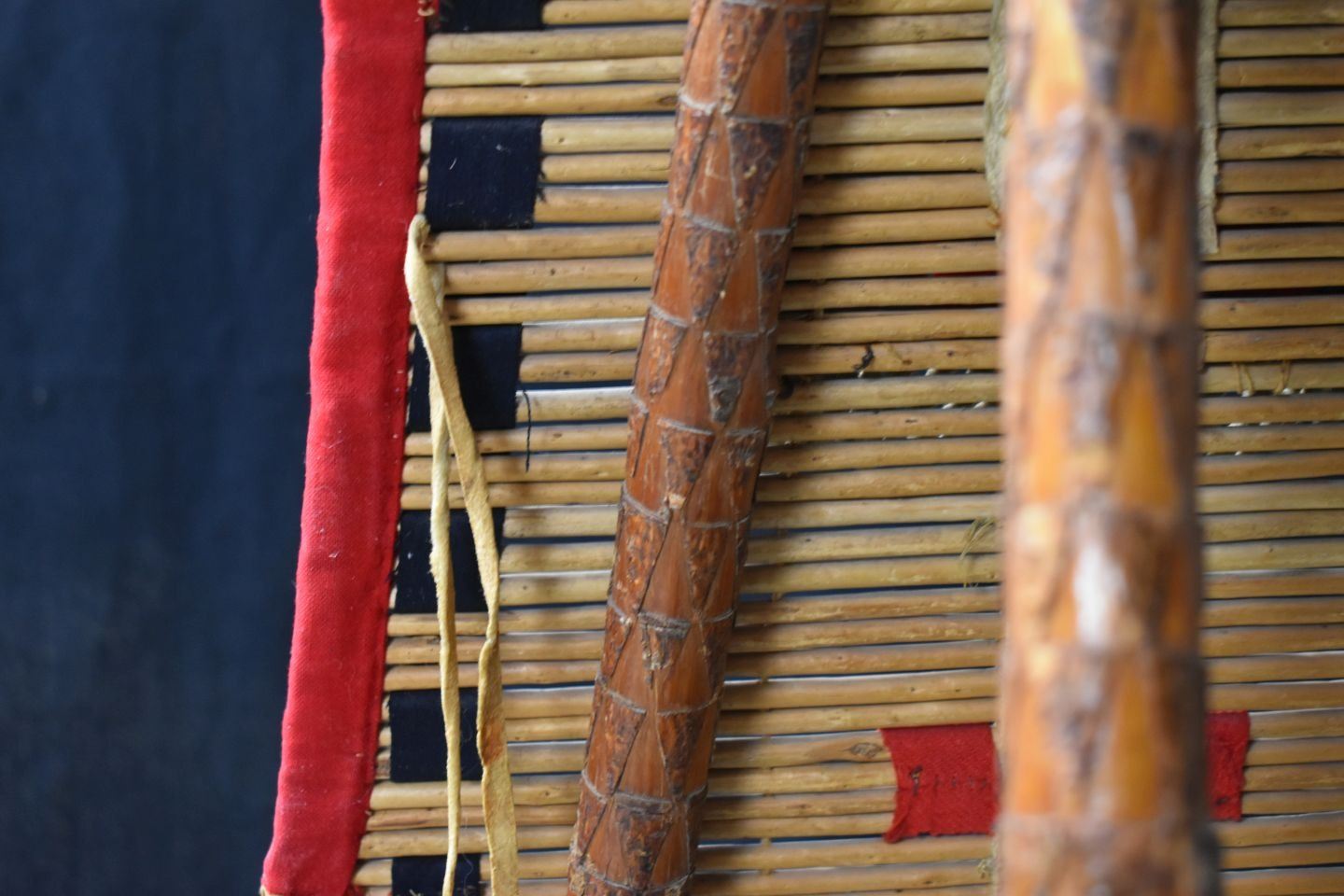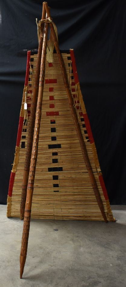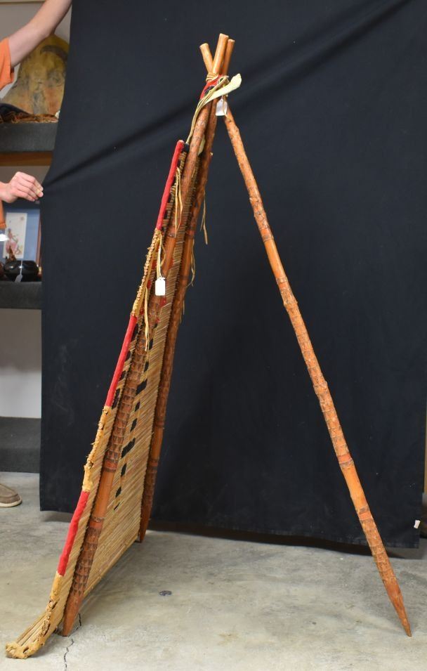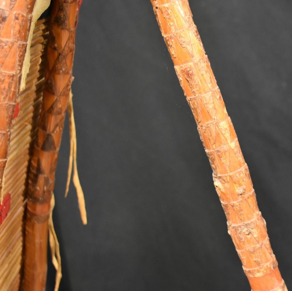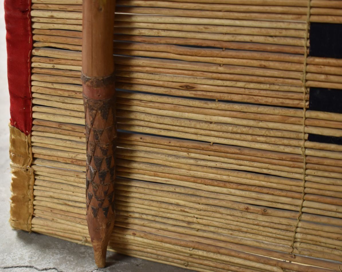 1900's Black foot. Willow and trade cloth tipi back rest. 53'' x 34'' and three carved poles.