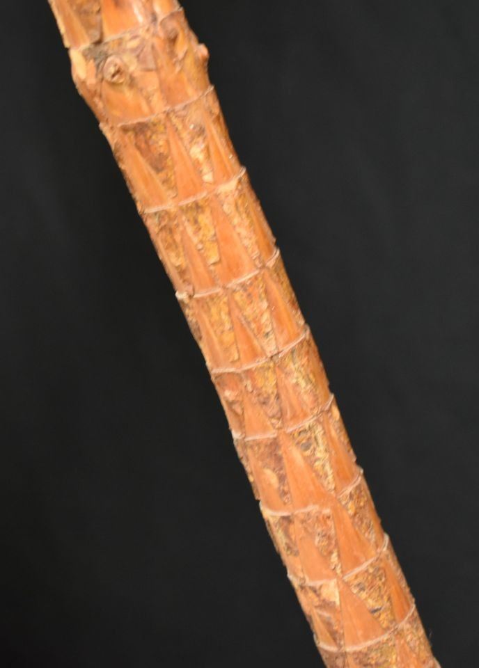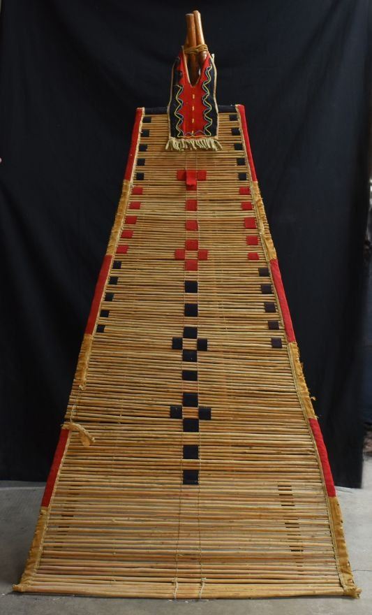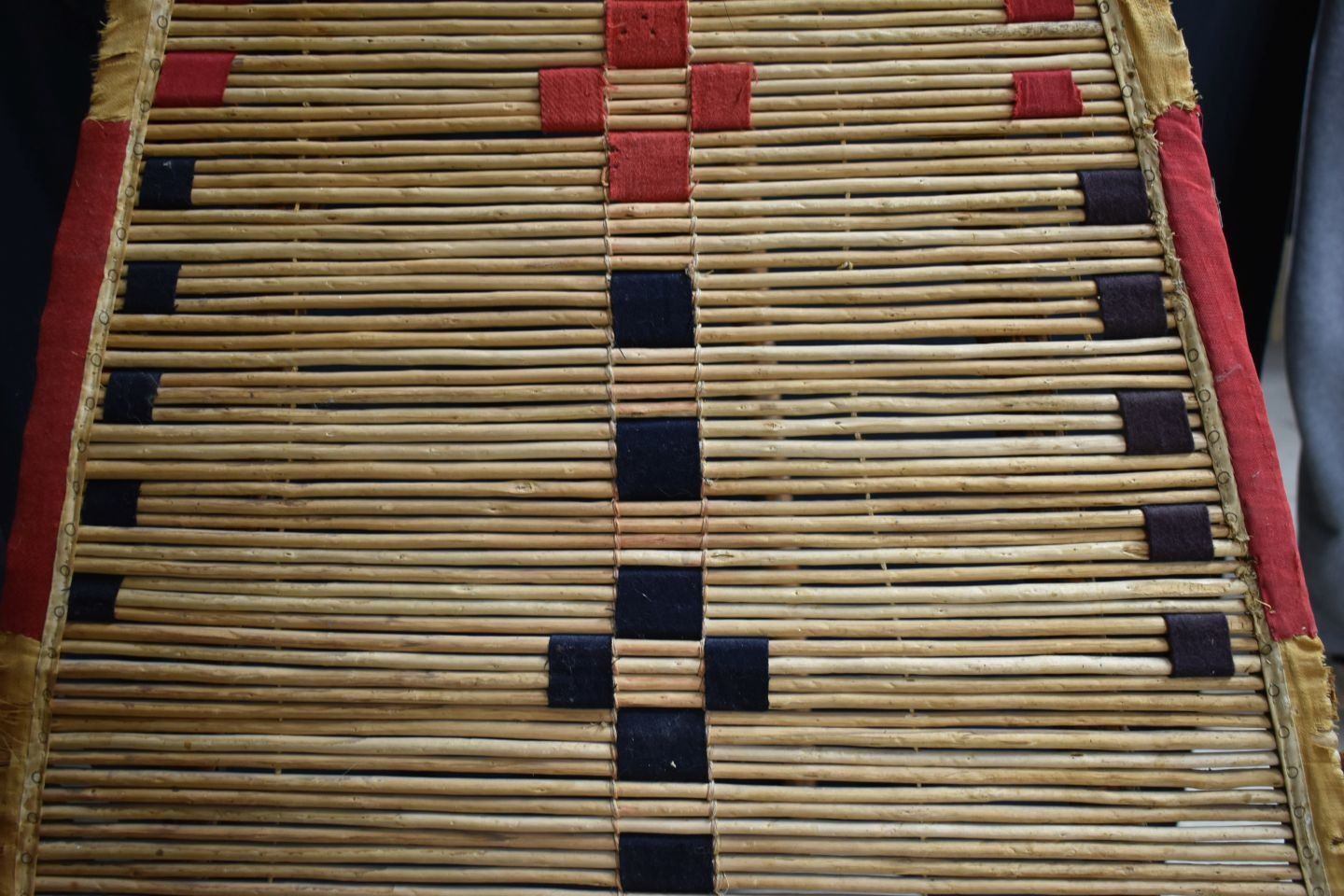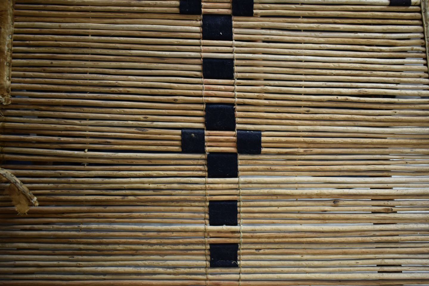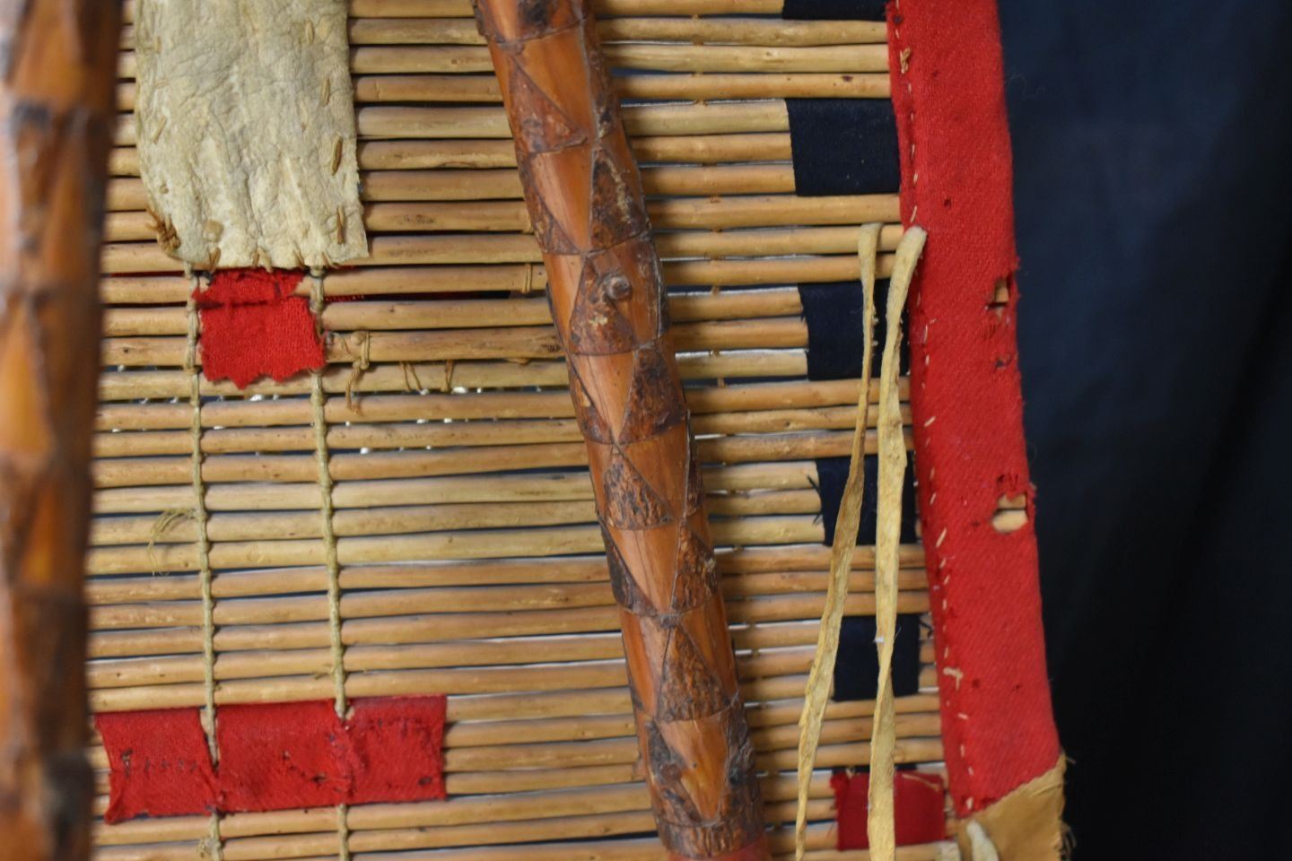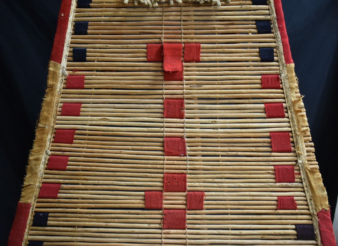 1900's Black foot. Willow and trade cloth tipi back rest. 53'' x 34'' and three carved poles.