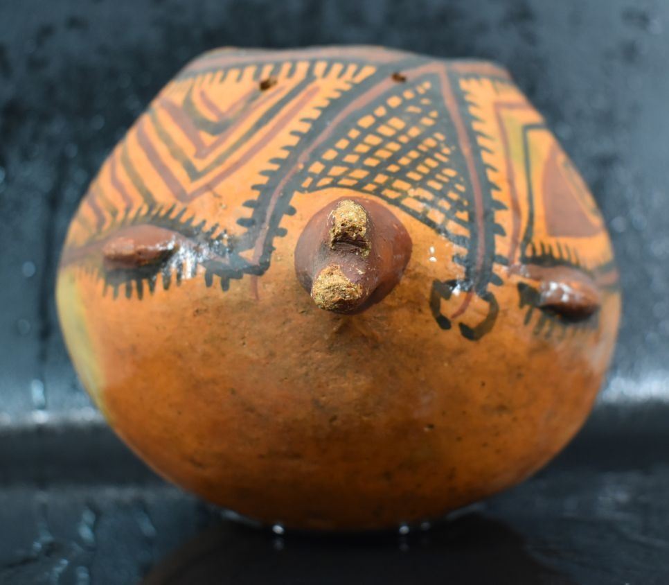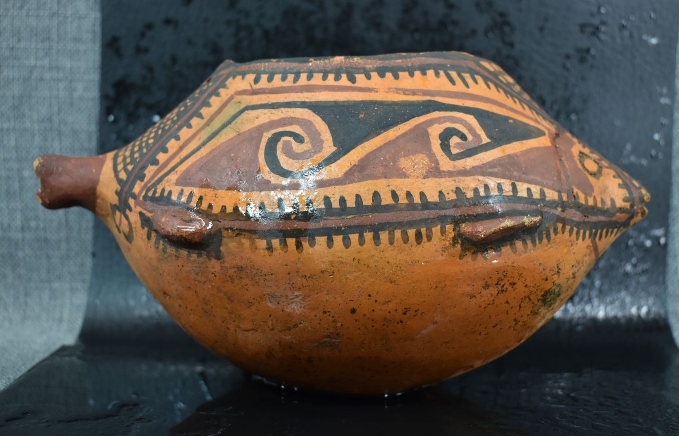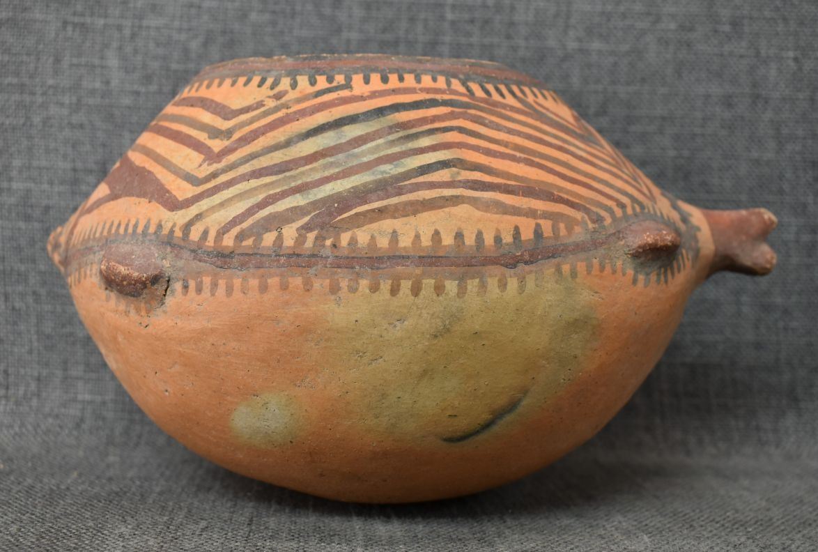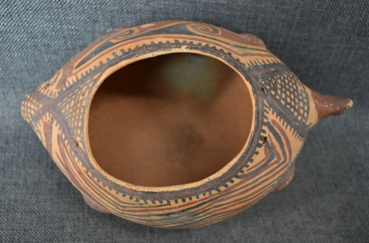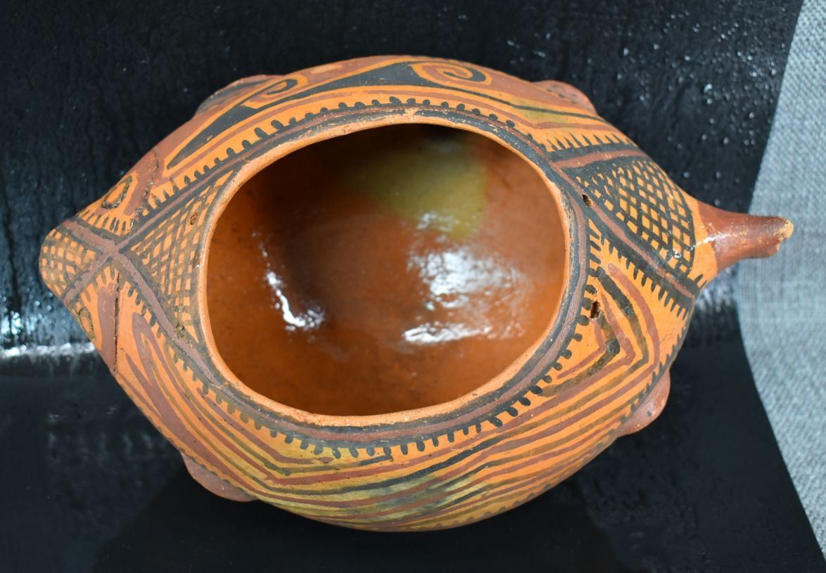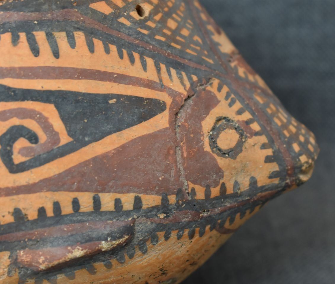 prehistoric Casa Grande, hand made fish effigy with polychrome painted design 5.5" x 10" x 6" as found condition