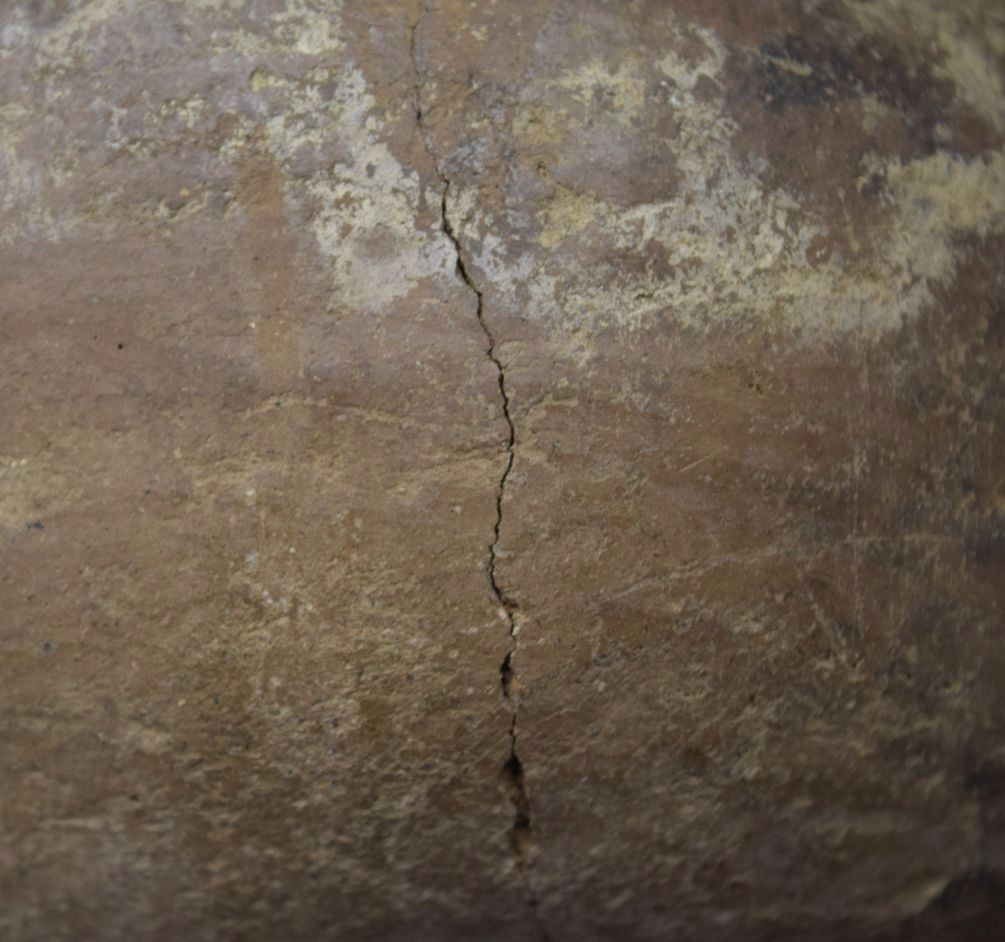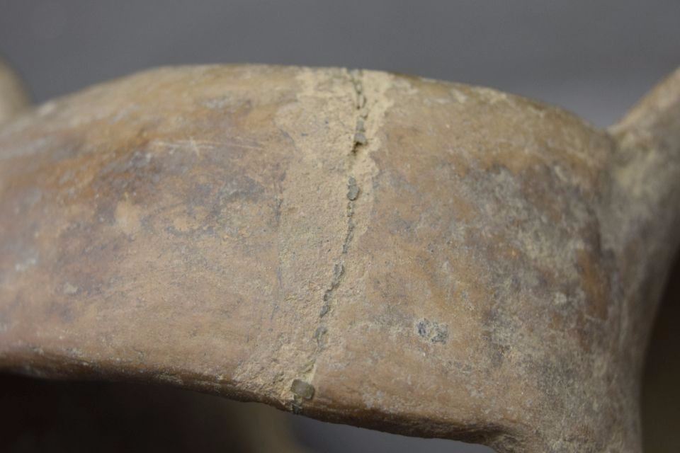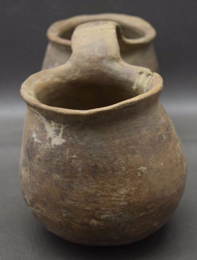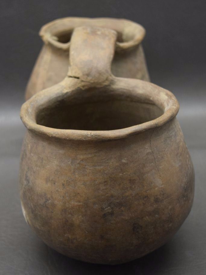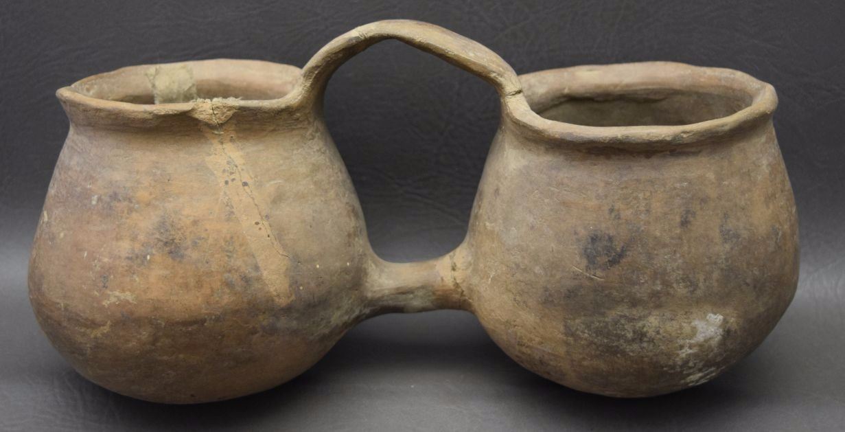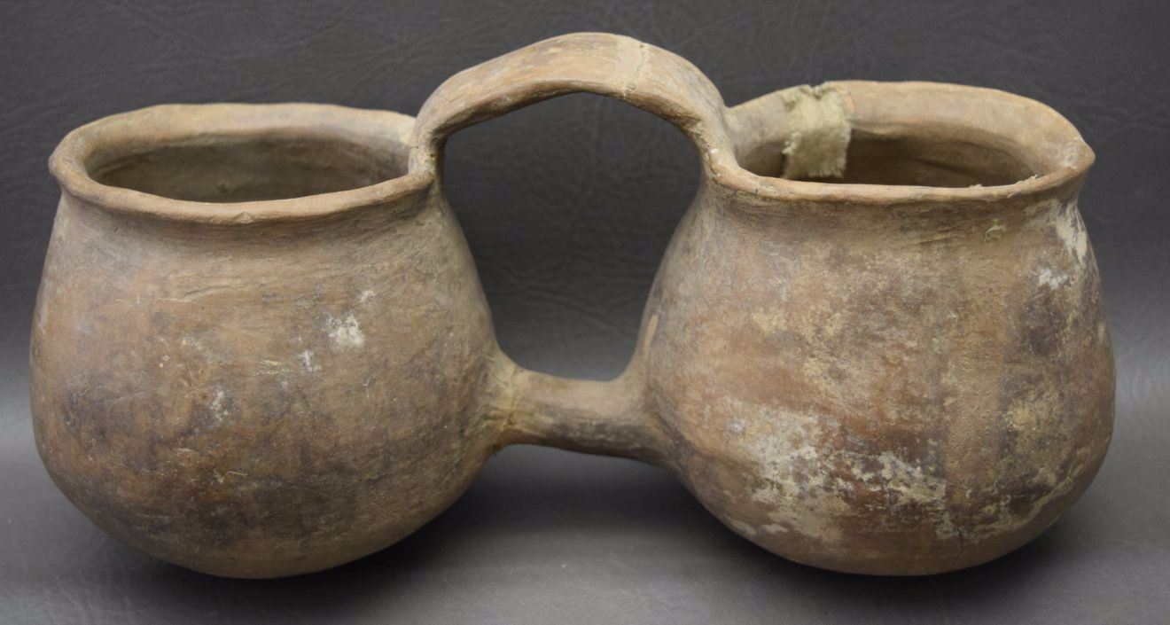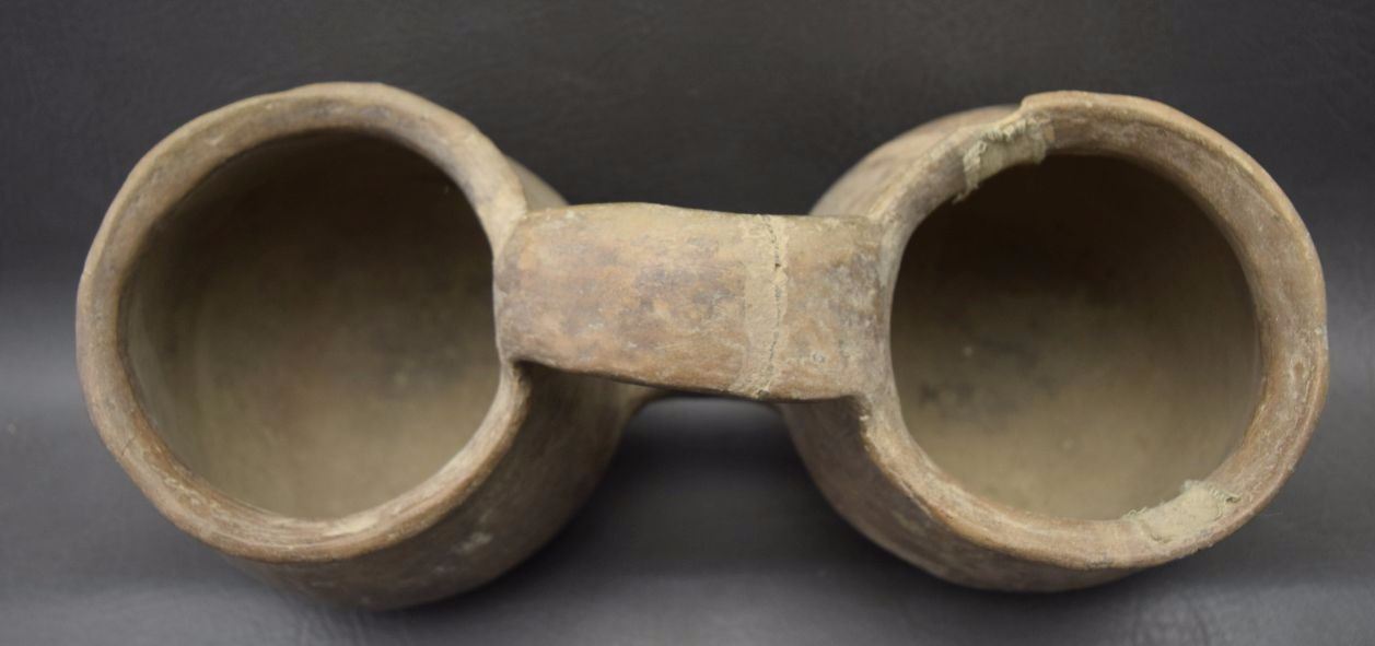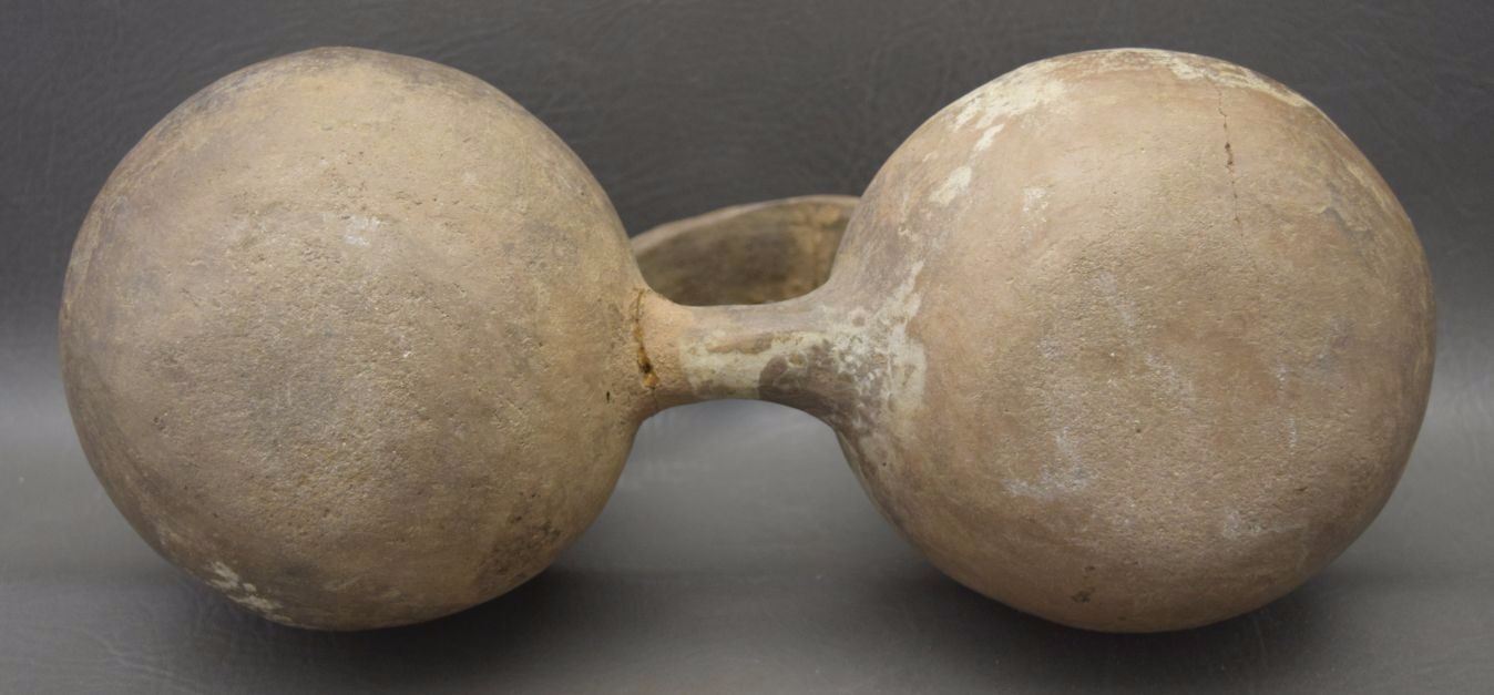 prehistoric unusual double lobe plain wear pottery vessel. Has been broken and glued 7'' x 14'' x 6''