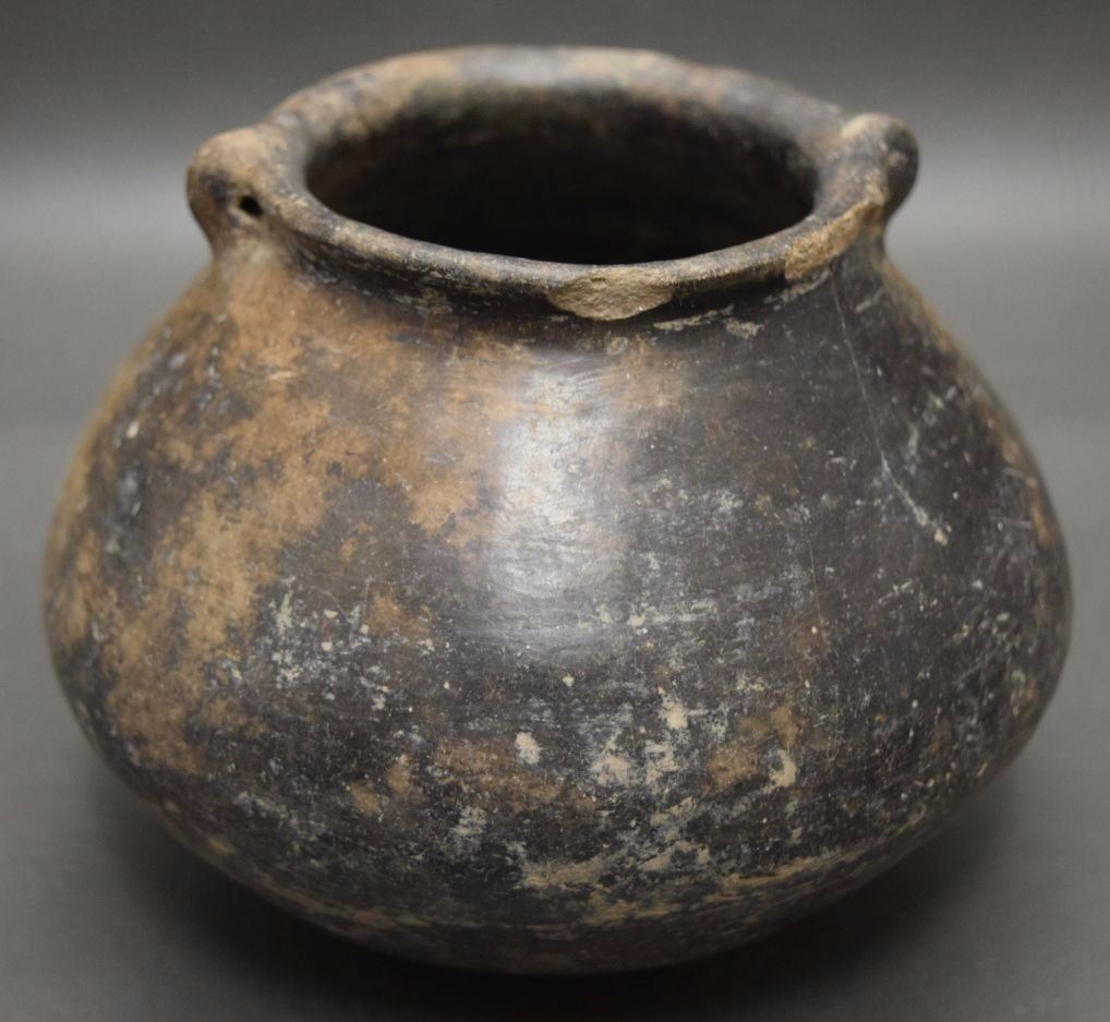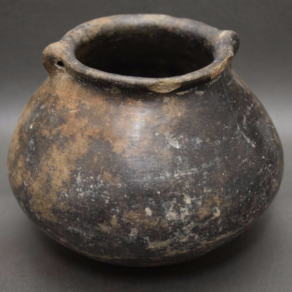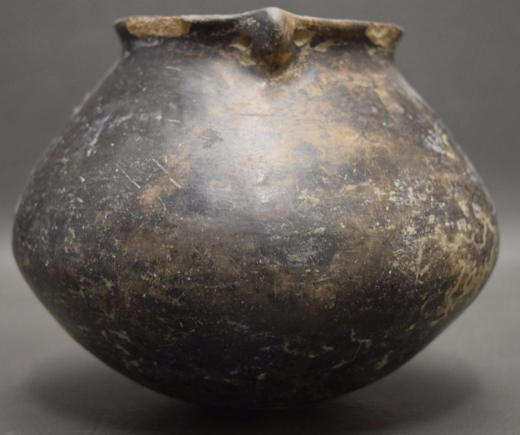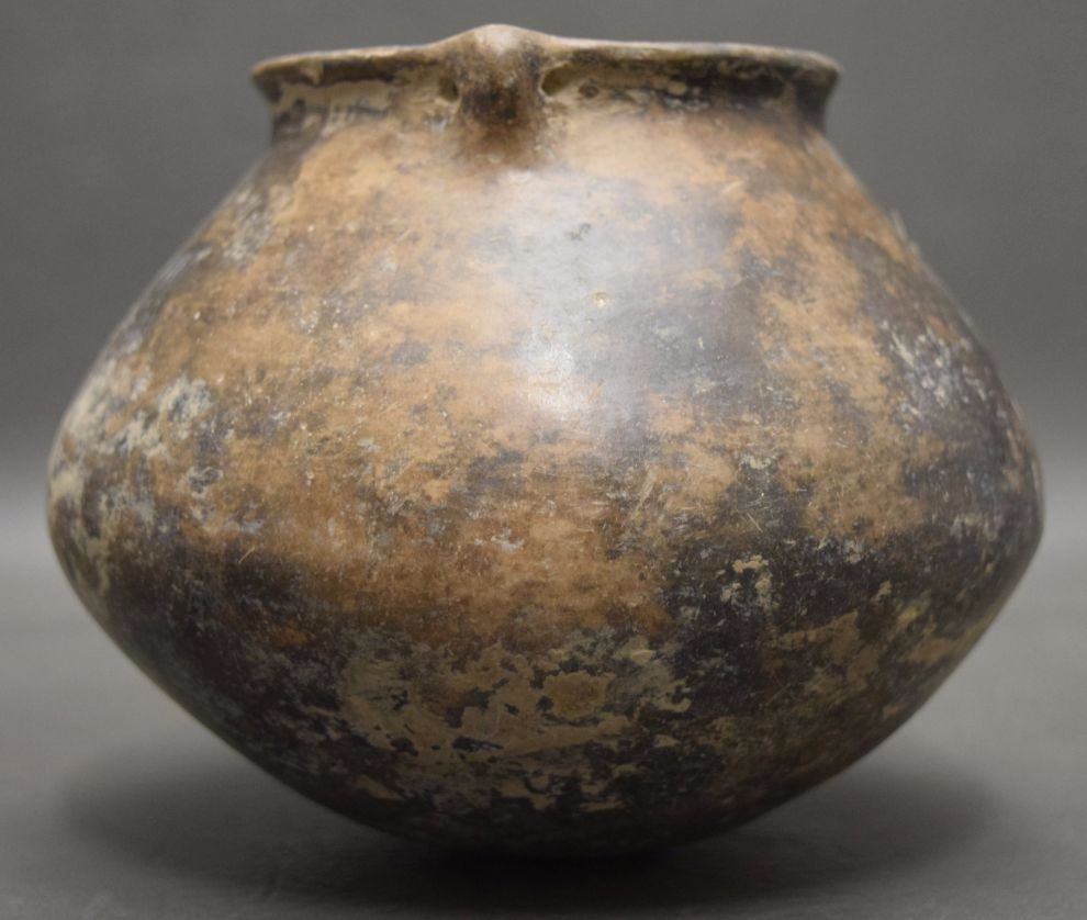 prehistoric plain ware pottery jar cracked and chipped, in as found condition. 5'' x 6''