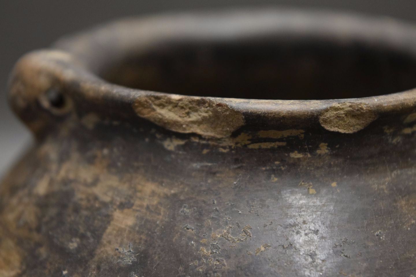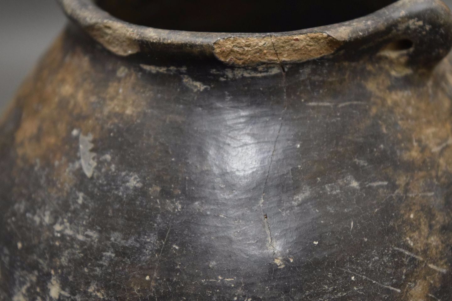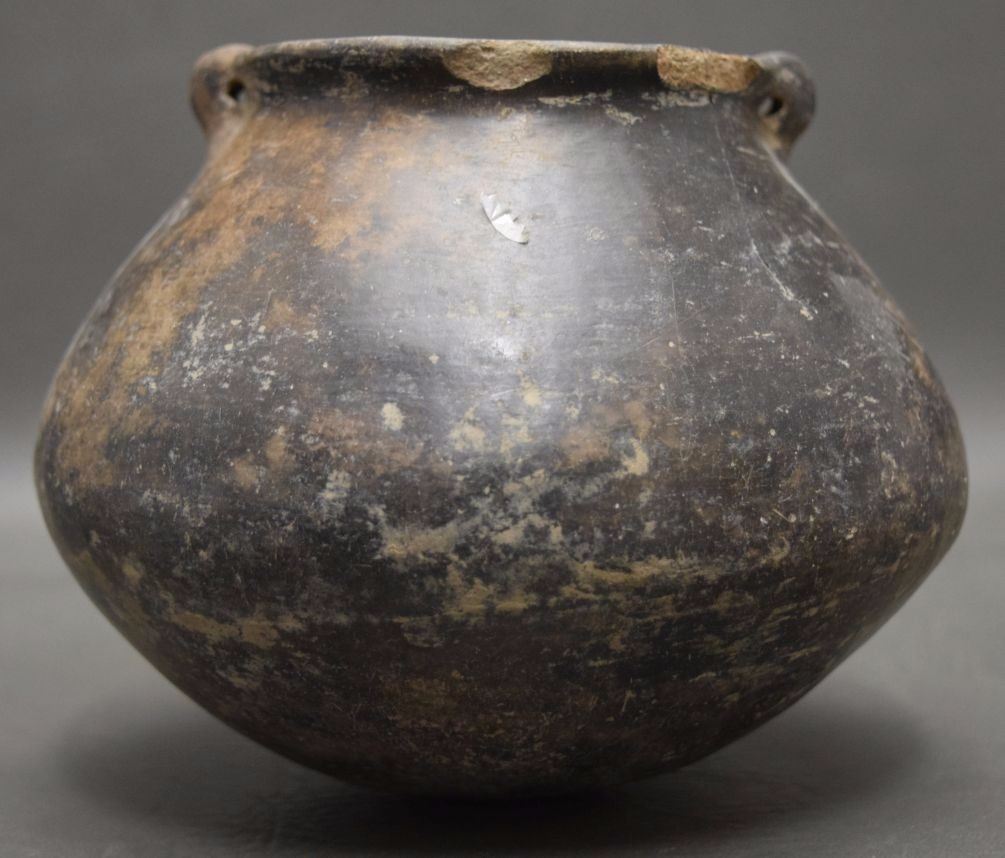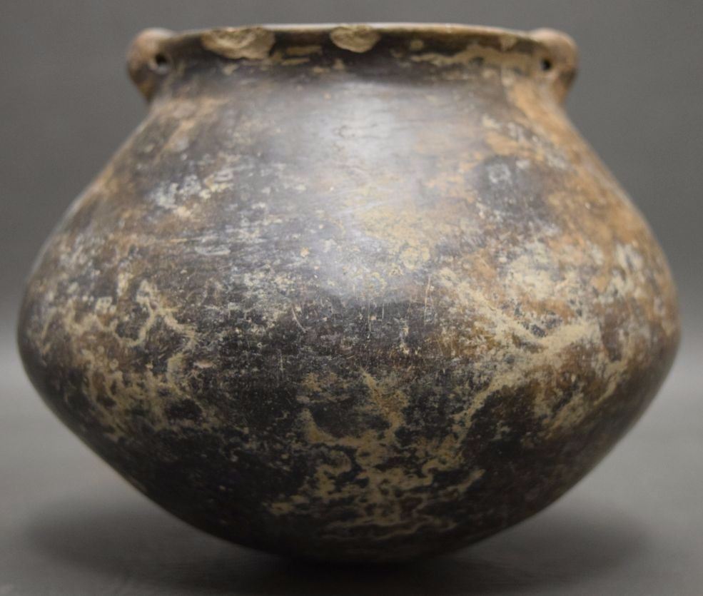 prehistoric plain ware pottery jar cracked and chipped, in as found condition. 5'' x 6''