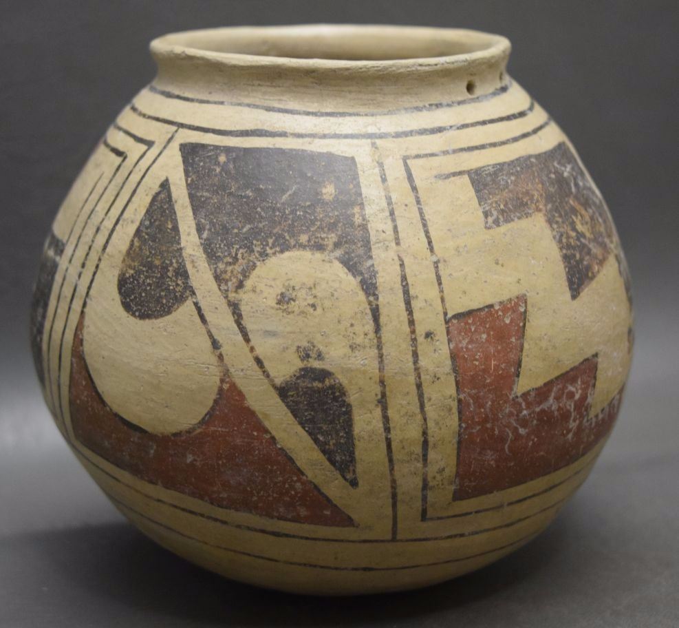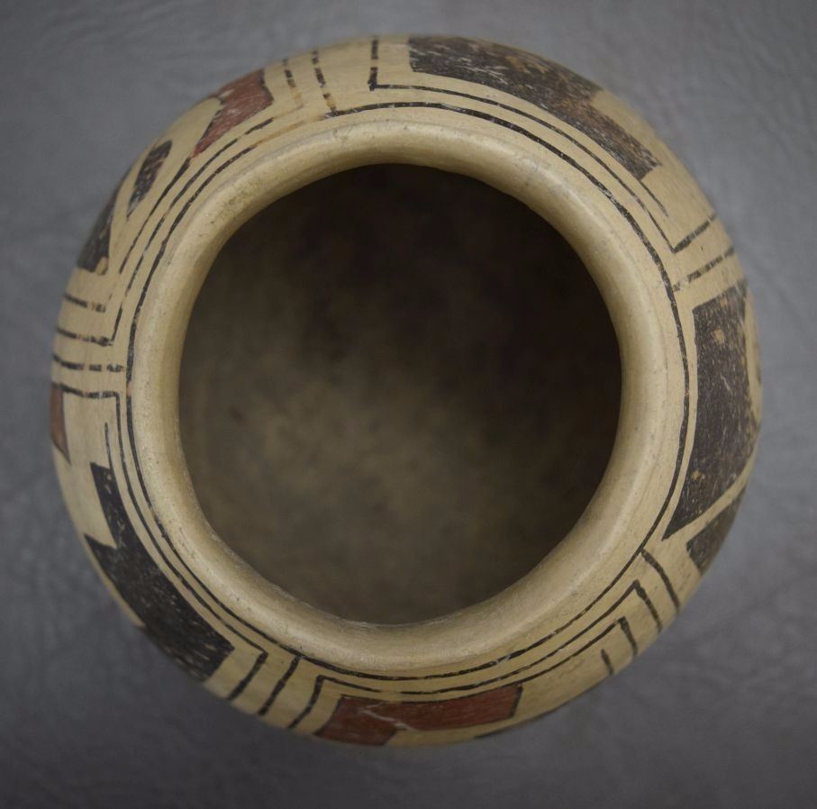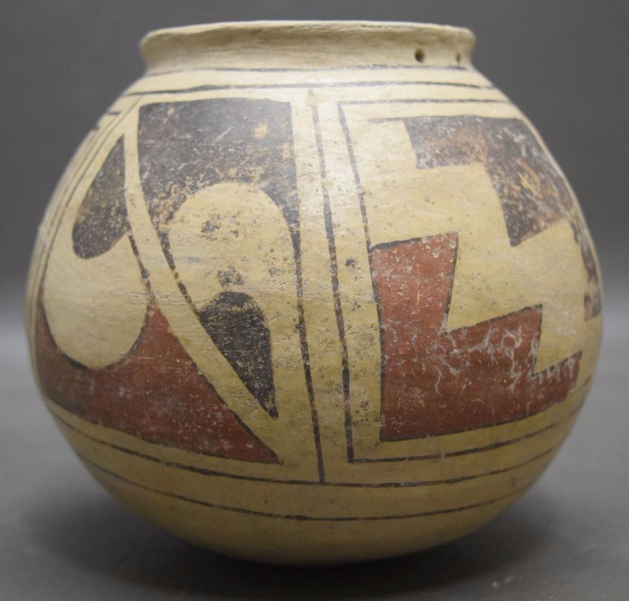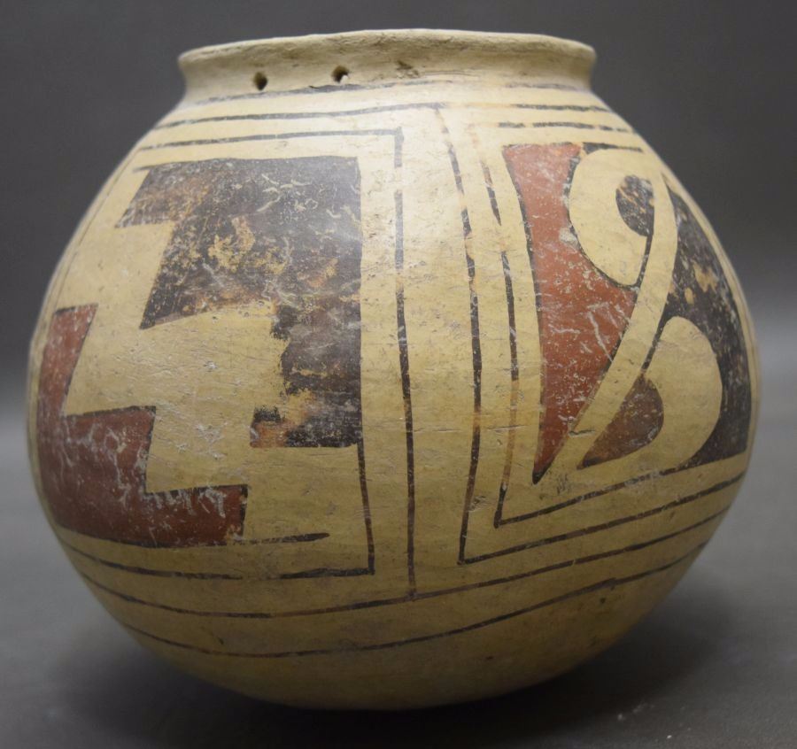 prehistoric hand painted polychrome design in as found condtion.5'' x 6''