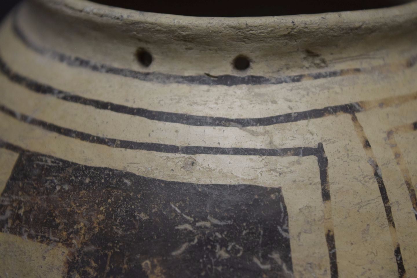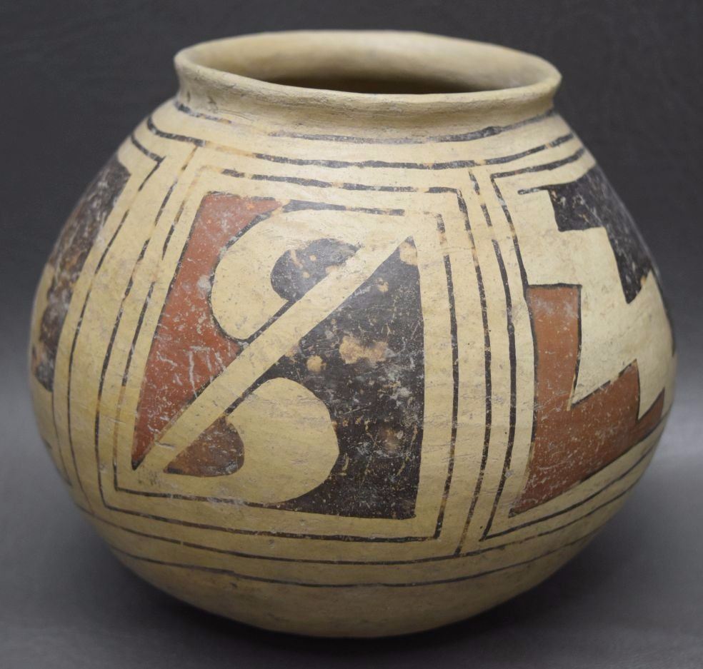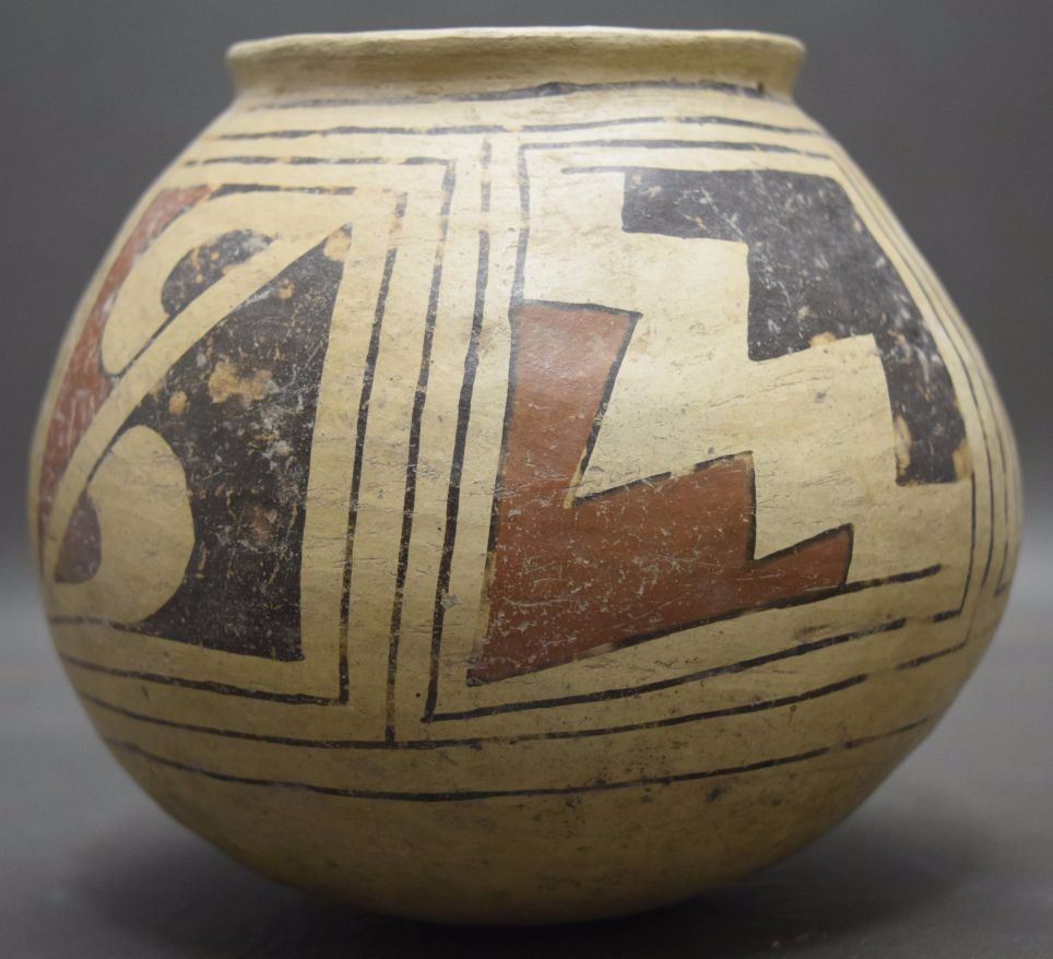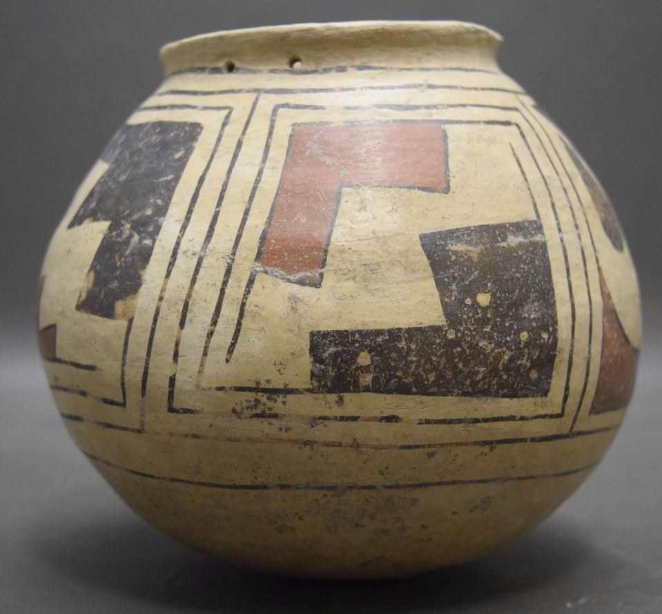 prehistoric hand painted polychrome design in as found condtion.5'' x 6''