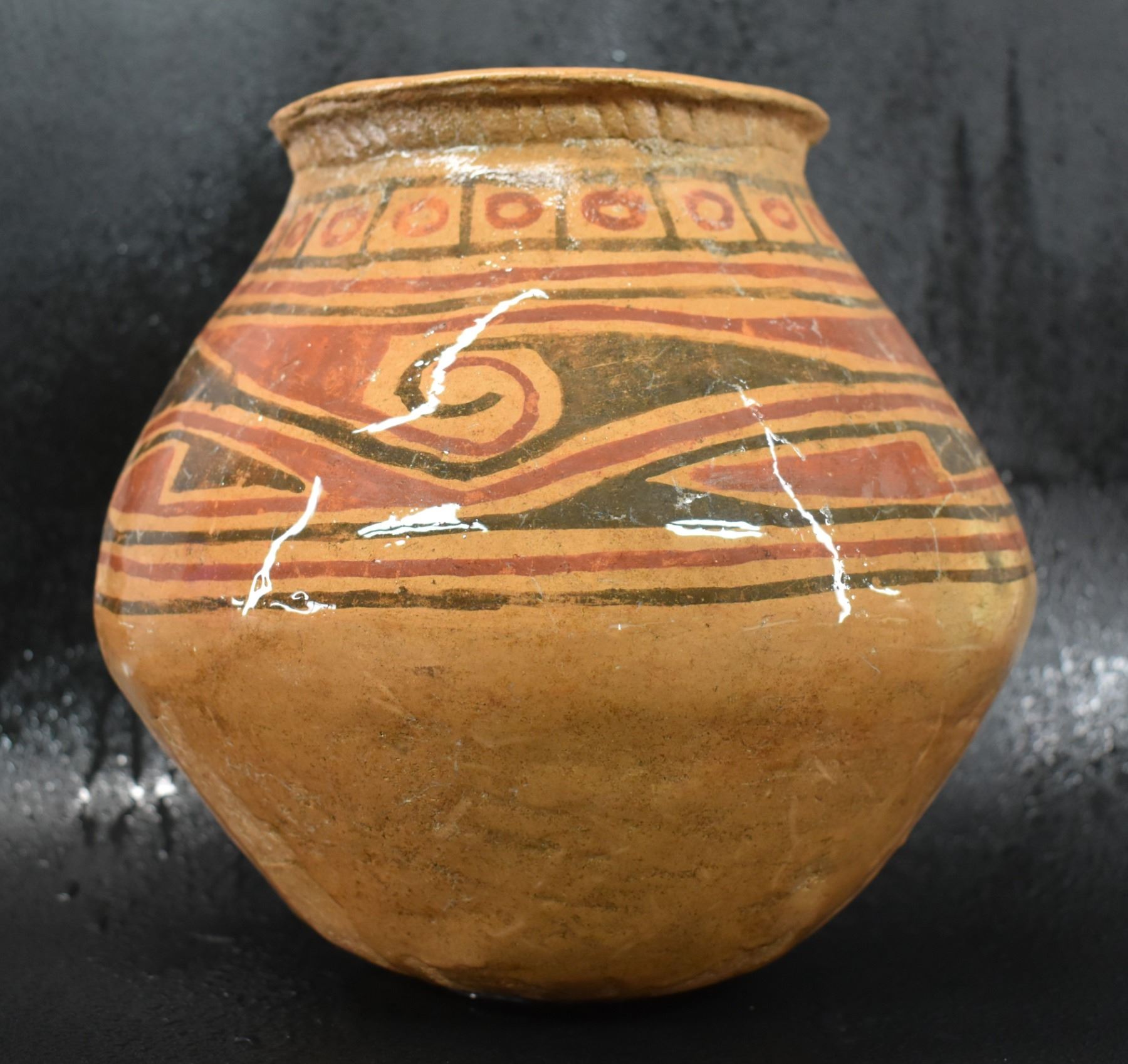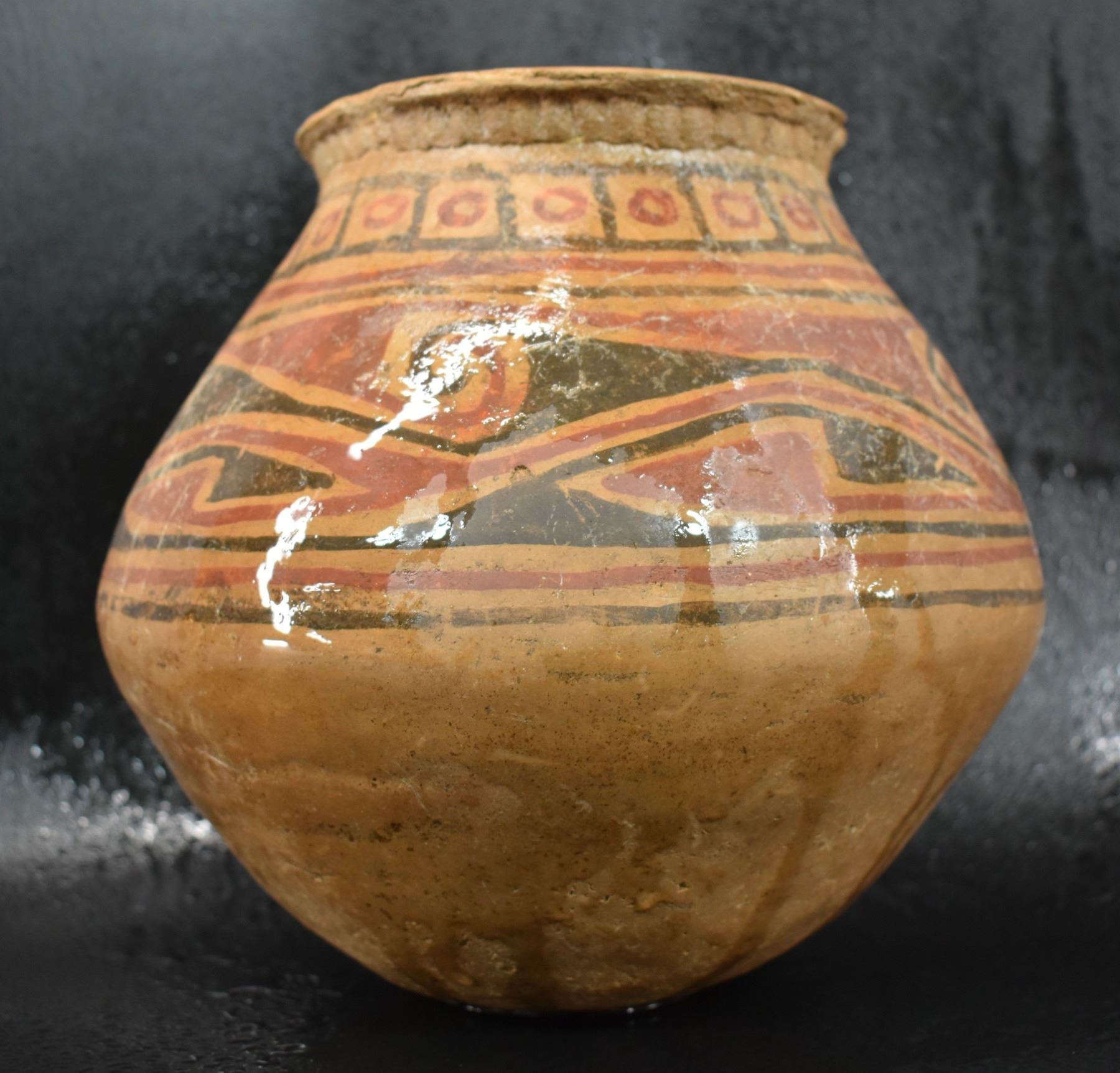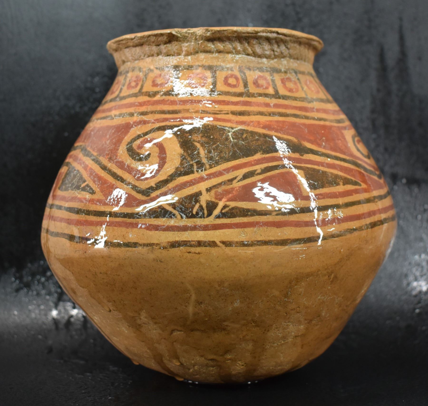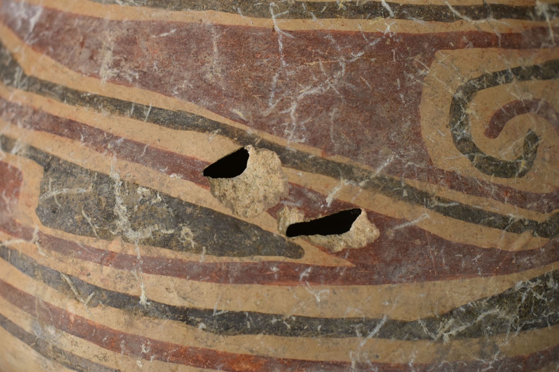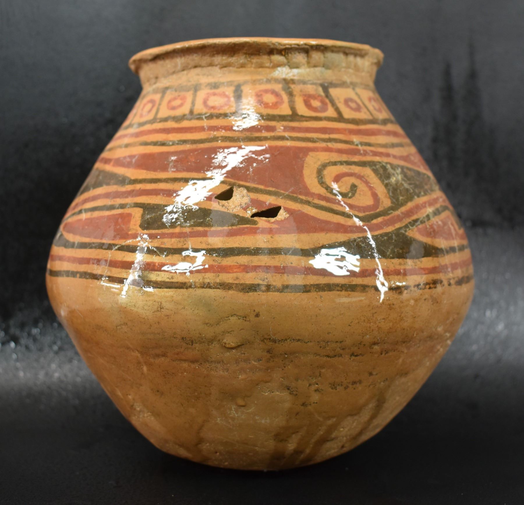 prehistoric Casas Grandes, hand coiled with polychrome painted design 7.75" x 8". As found condition has probe holes