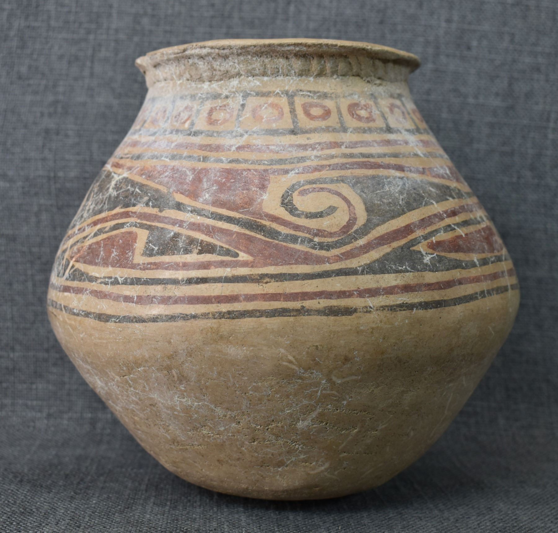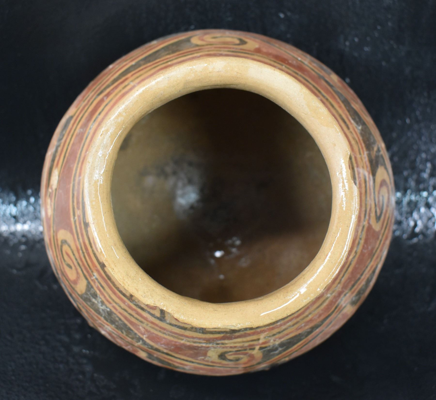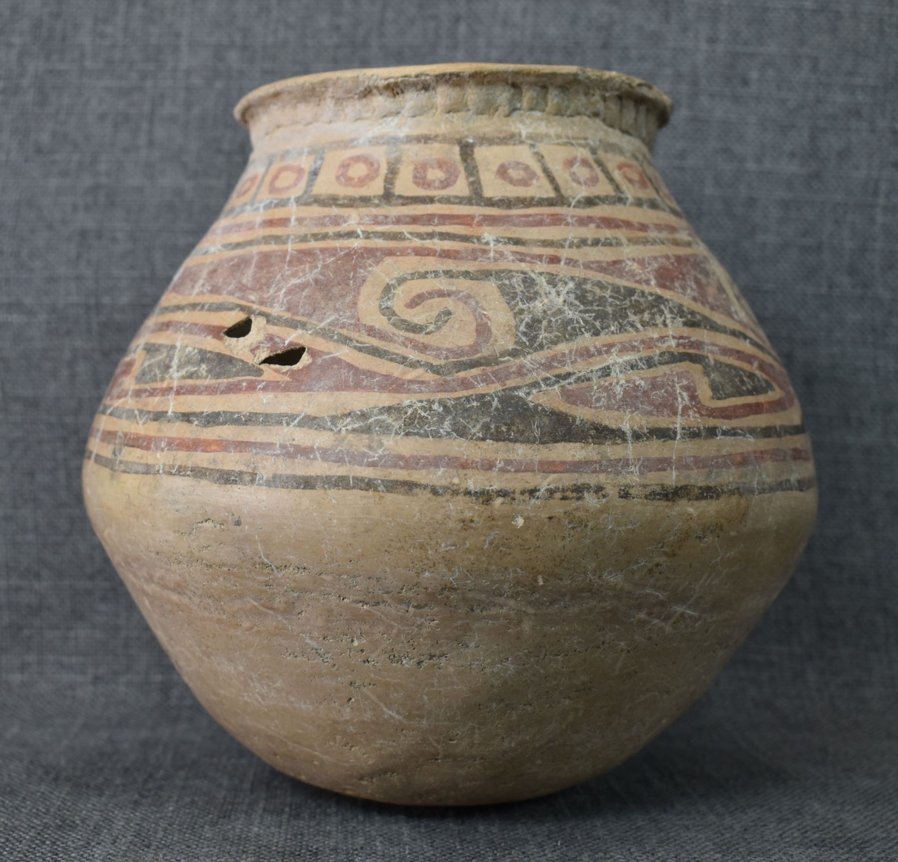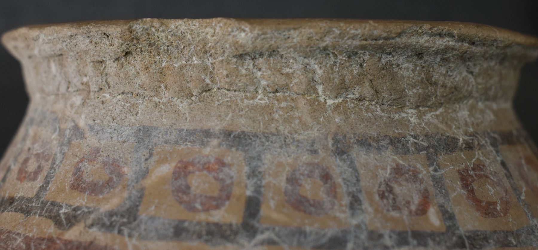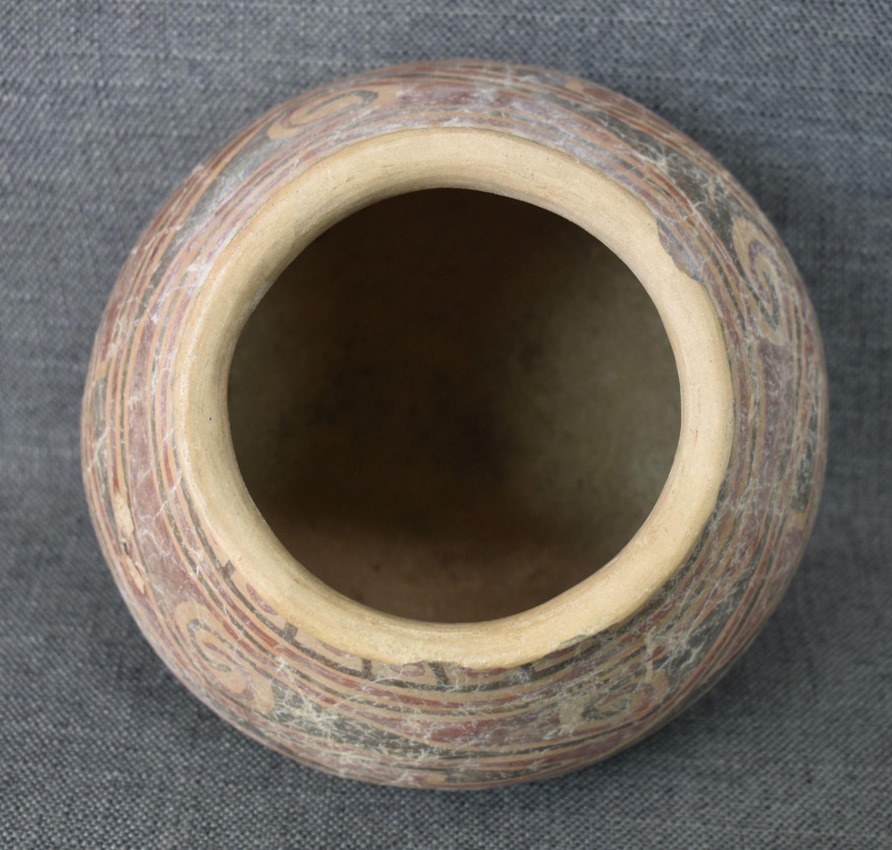 prehistoric Casas Grandes, hand coiled with polychrome painted design 7.75" x 8". As found condition has probe holes