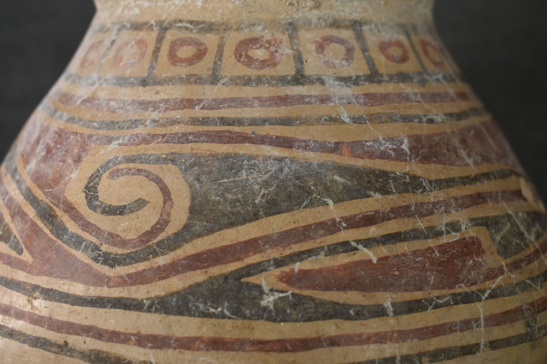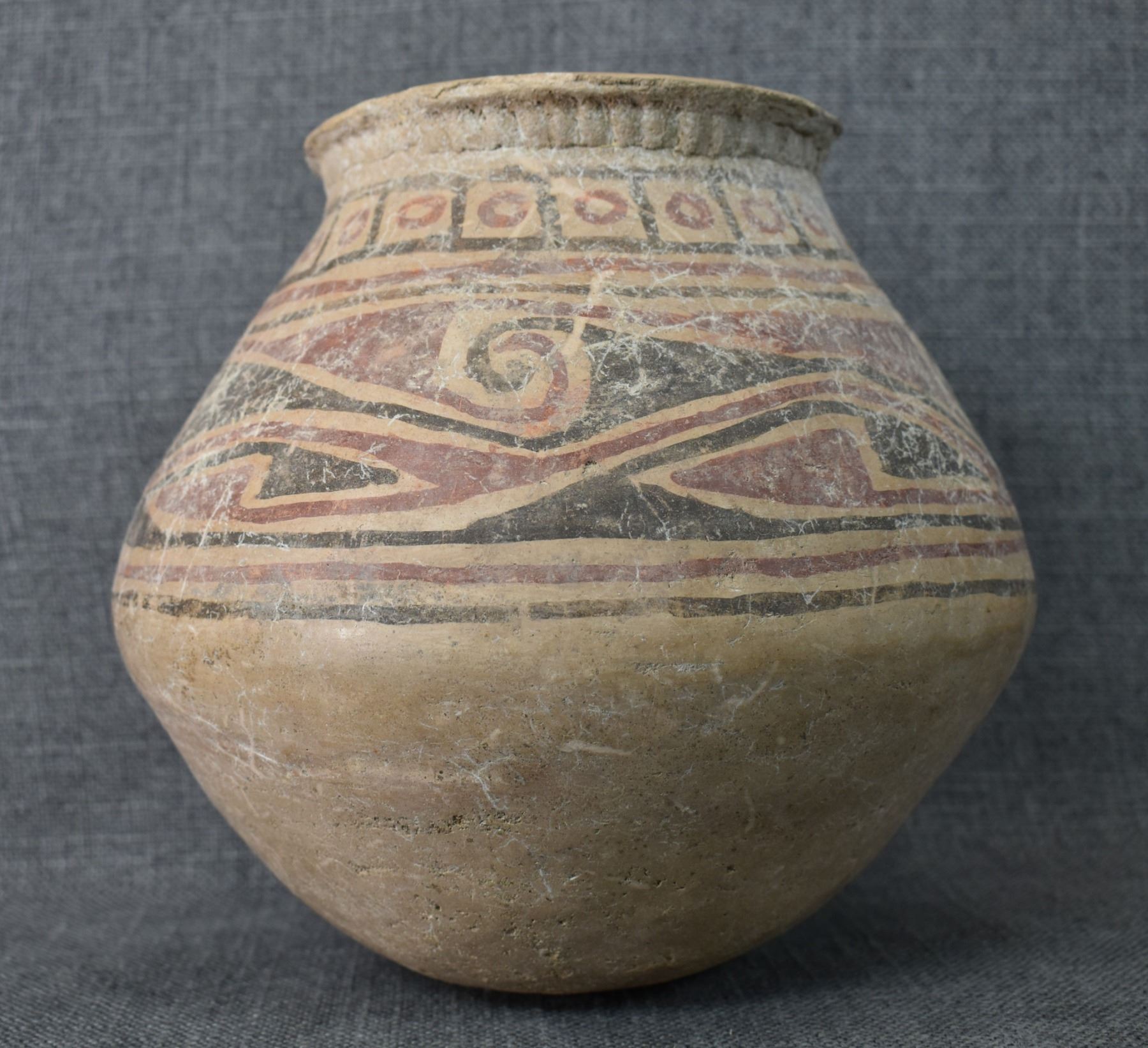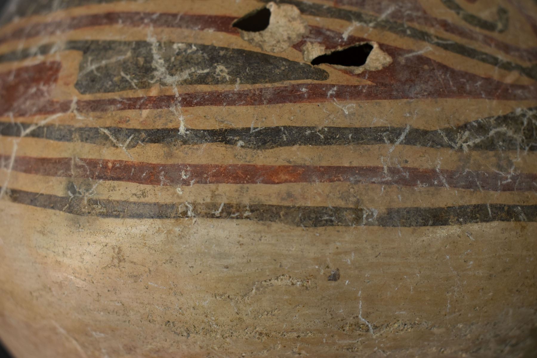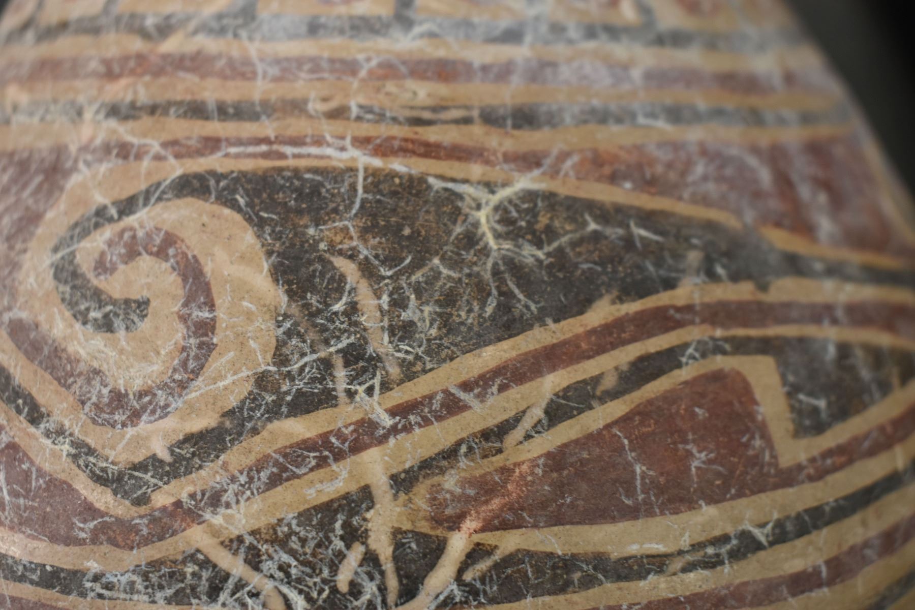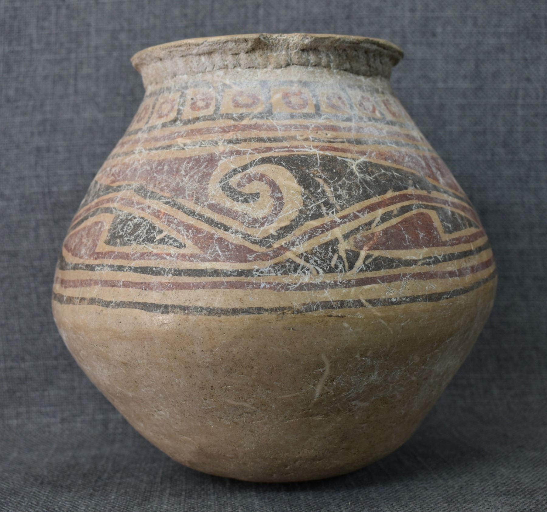 prehistoric Casas Grandes, hand coiled with polychrome painted design 7.75" x 8". As found condition has probe holes