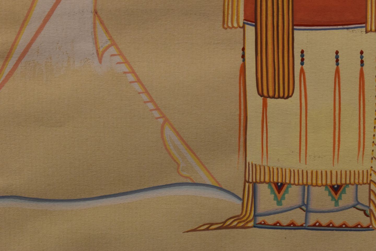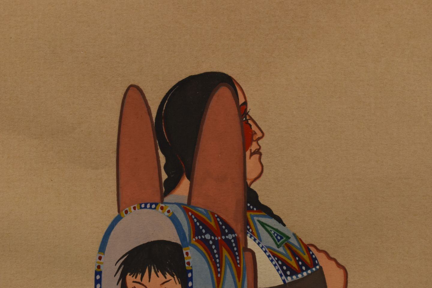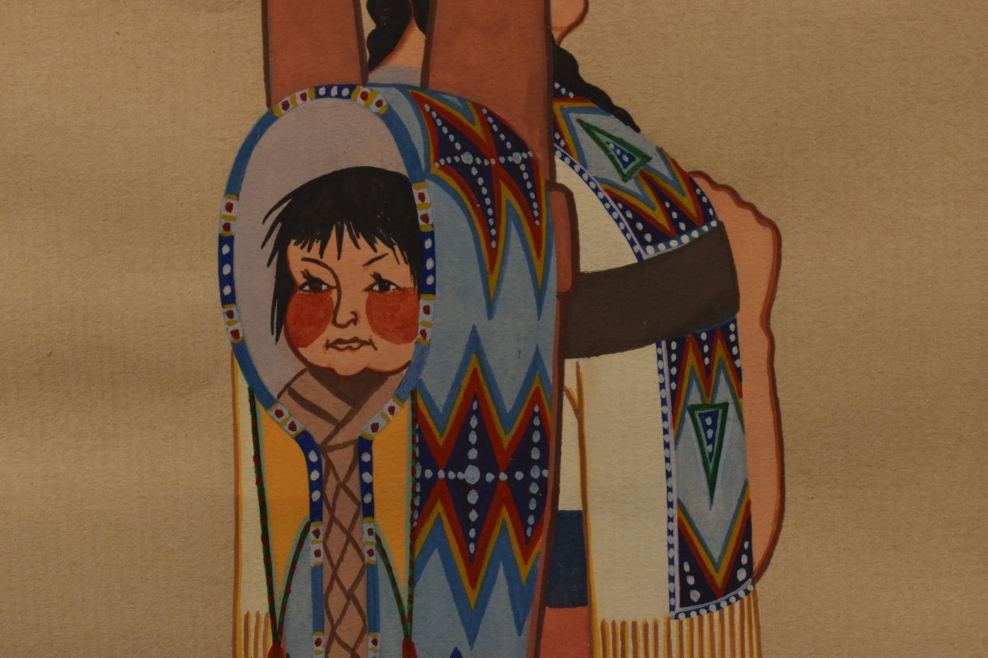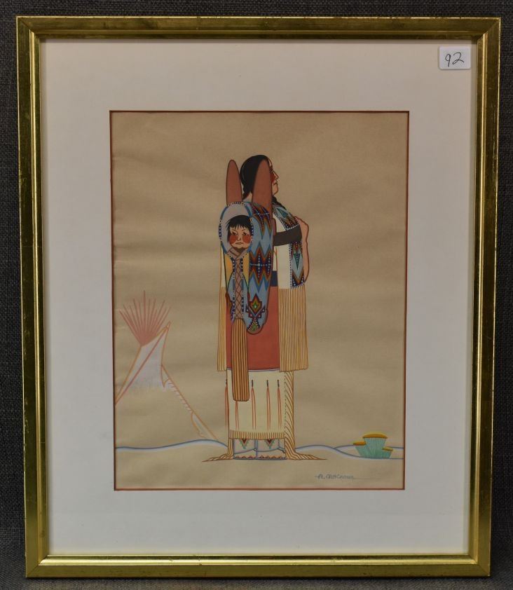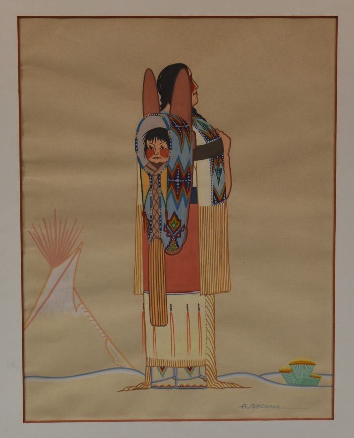 1970's Cheyenne, original hand painted on paper of woman holding child in cradle signed A Blackowl 10.75" x 8.25" matted and framed to 16" x 13.5"