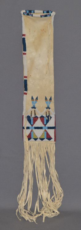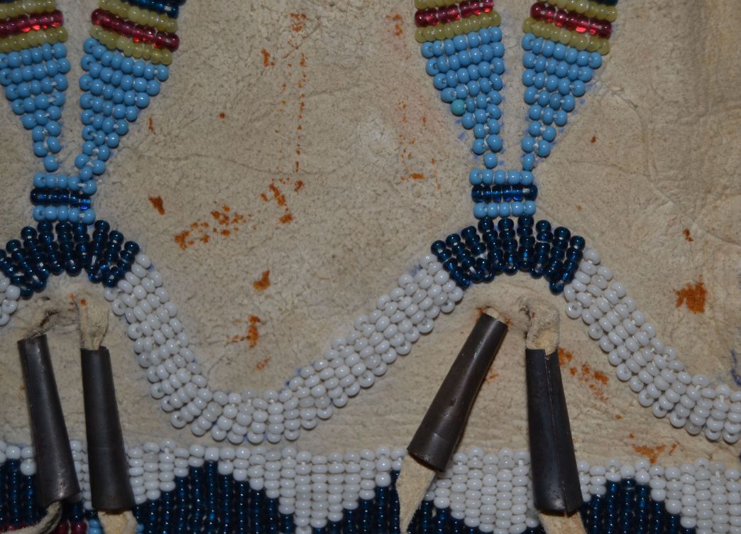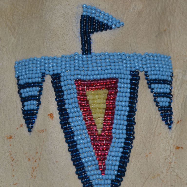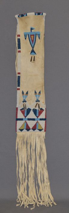 1950s 60s hand beaded geometric and thunderbird design on leather 20.5"x5.5" not including fringe 35" including fringe