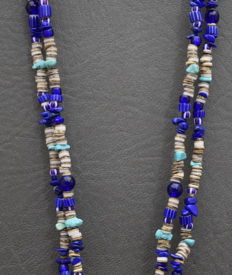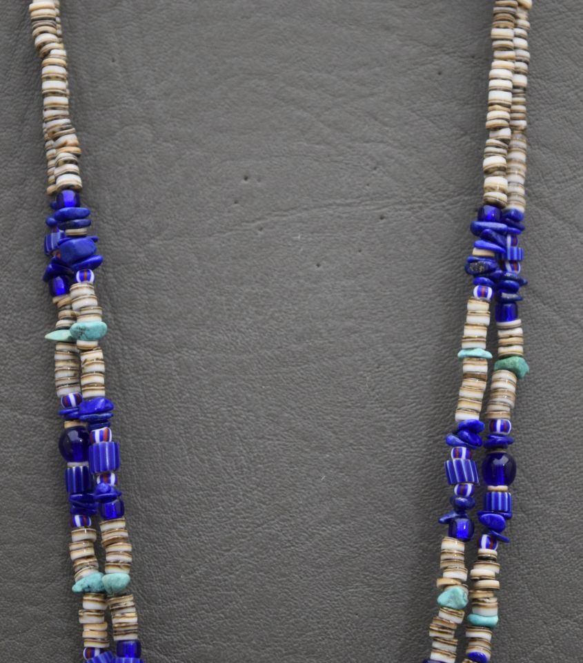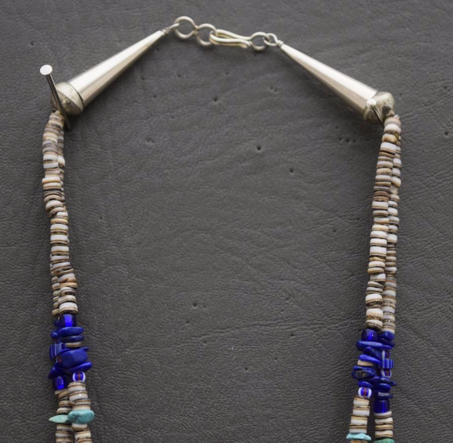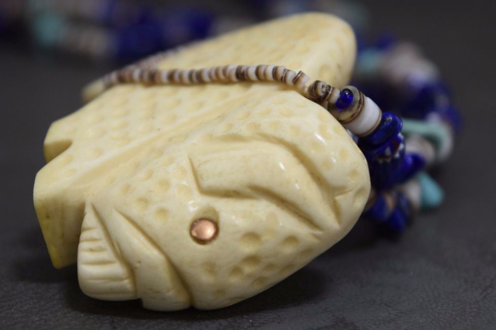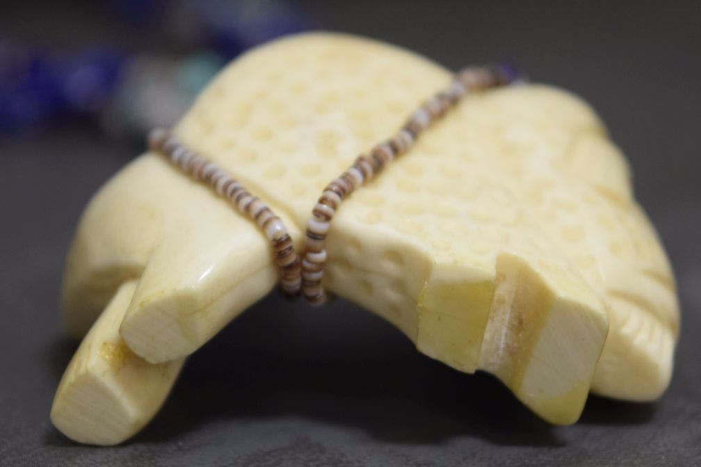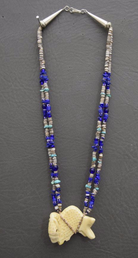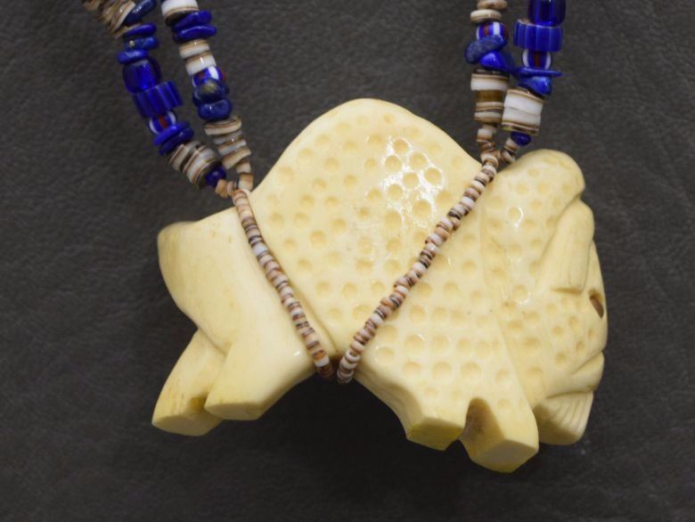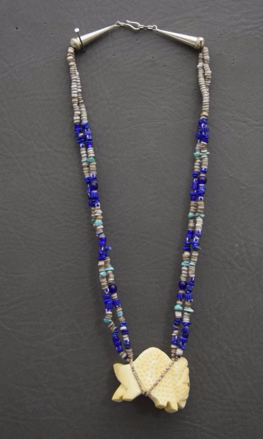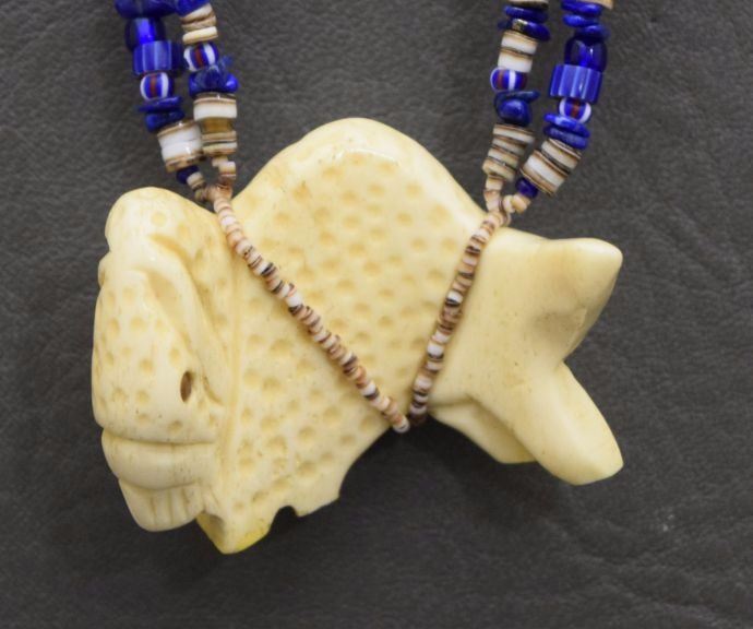 1980's two strands trade bead necklace18'' has with sterling ends and carved bone pendent depicting buffalo 1.5'' x 2''