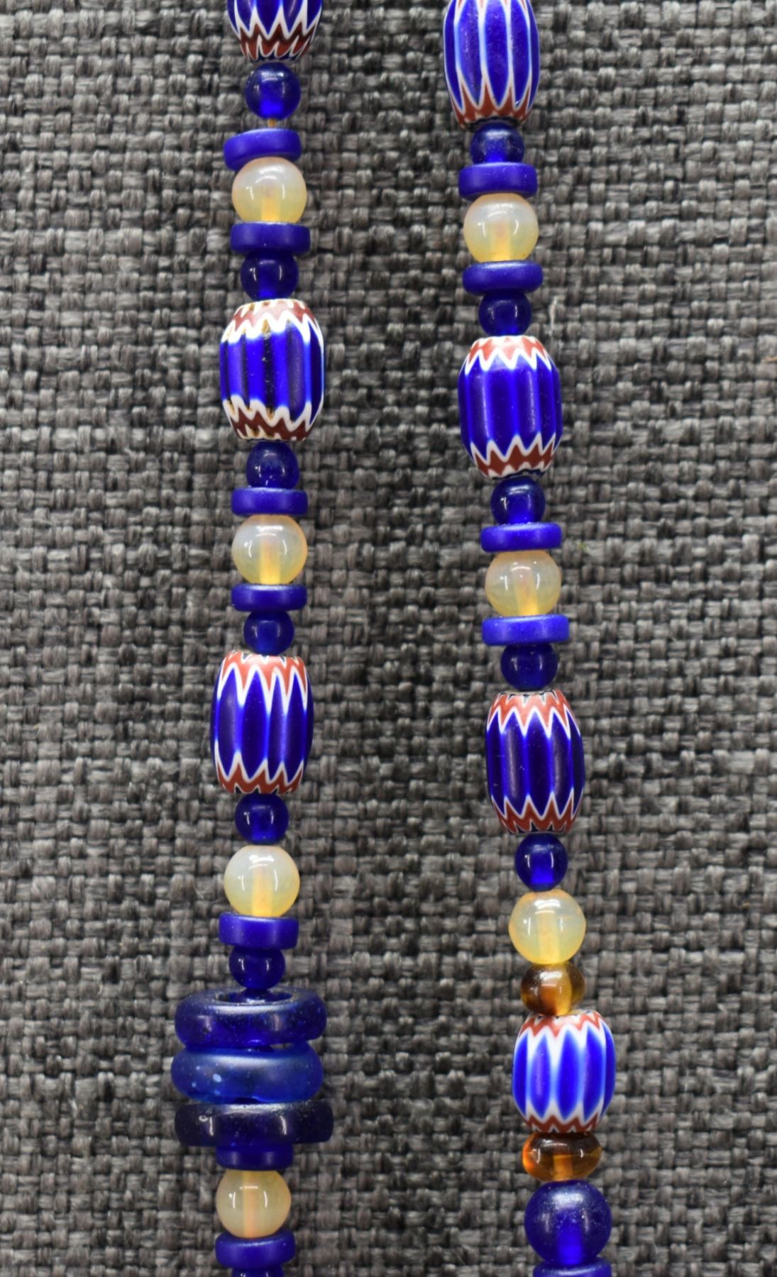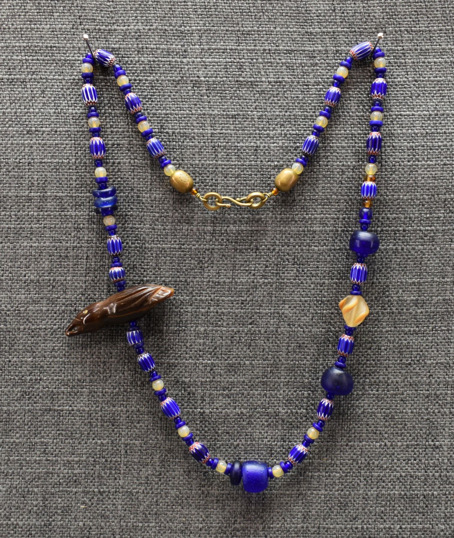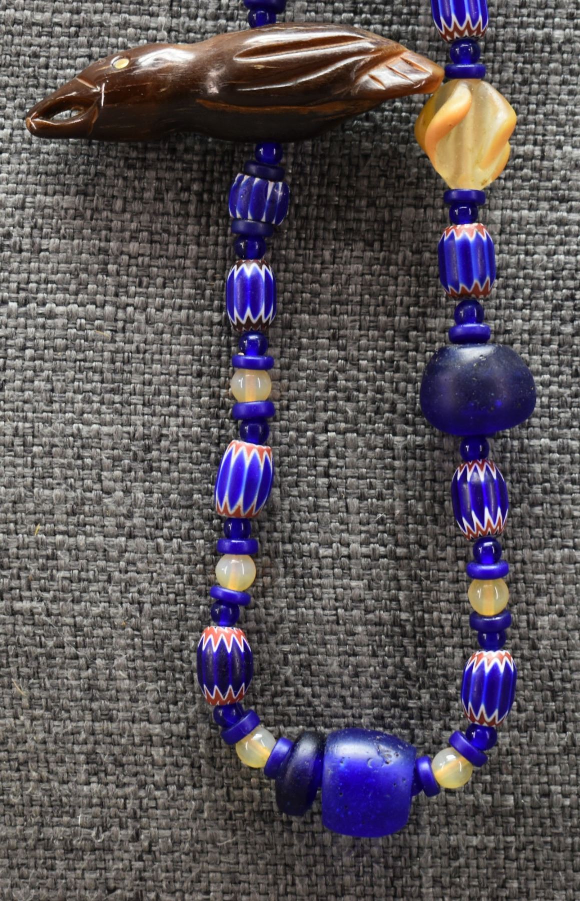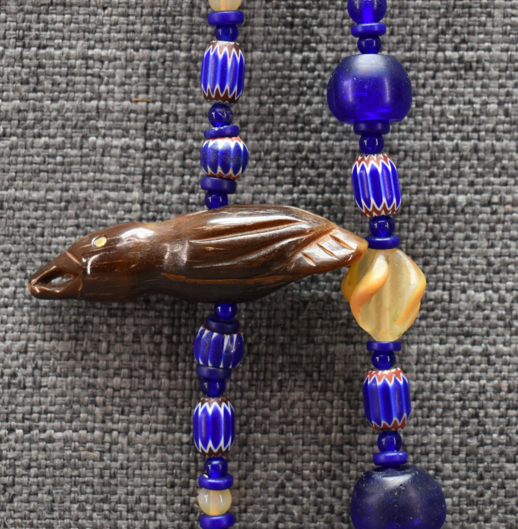 1980's Choctaw, single strand of various beads with carved fossilized ivory bird fetish .5" x 2.5" signed Kaniatobe total length 28" long