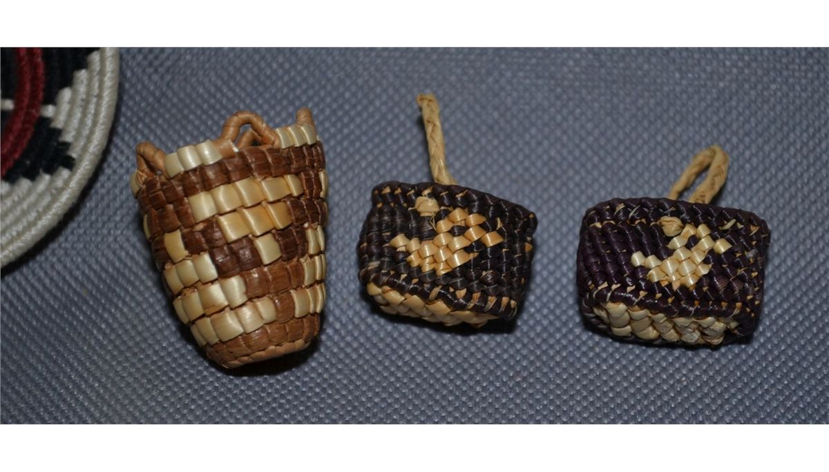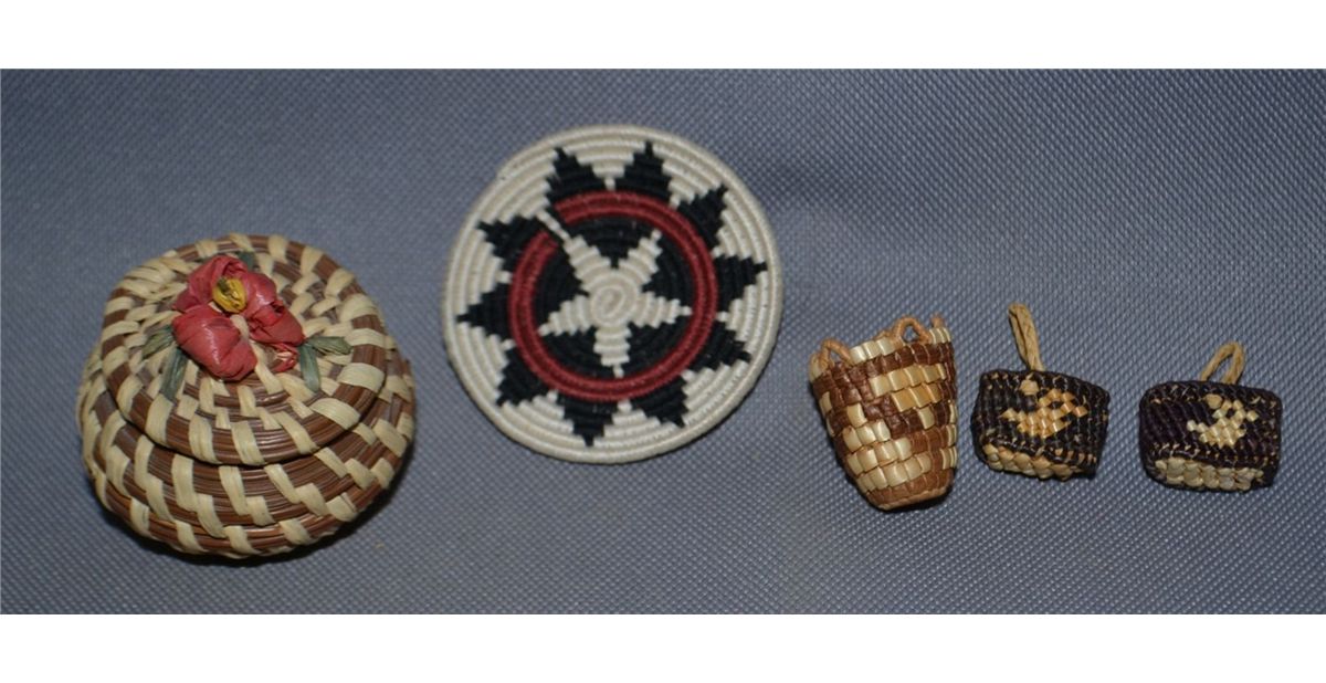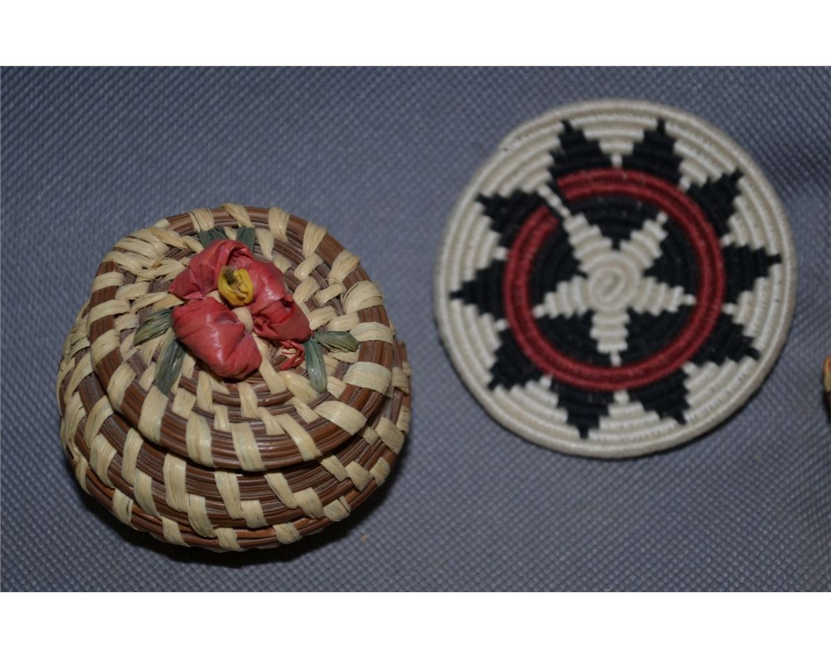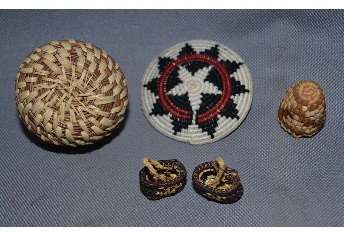 1970s 90s handwoven negative Makah 1" x 1" x .5" Navajo wedding pattern 2" diameter Klikitat 1" x .75" Pine needle baskets 2" x 2" five total
