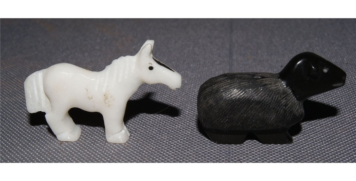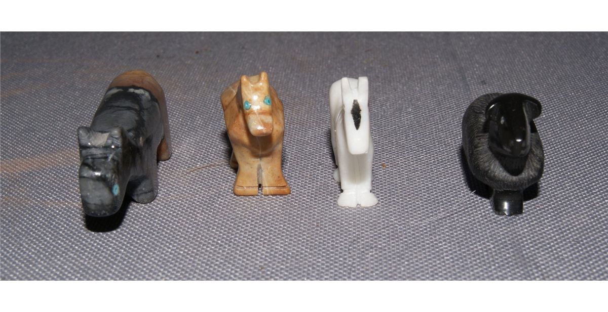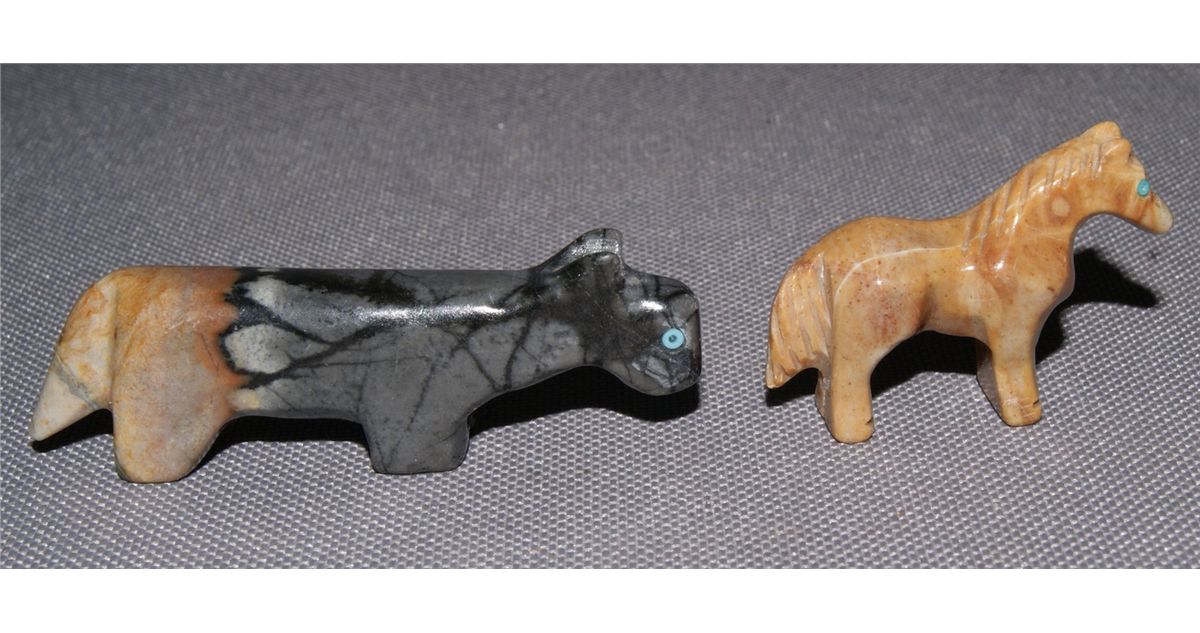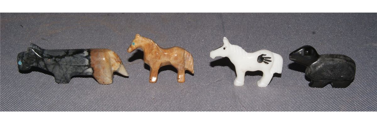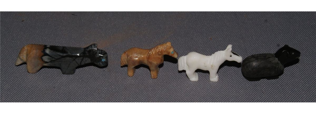 1980s 90s 2 horse fetishes 1.1" tall, 1 fetish with turquoise eyes .75" x 2.5", sheep signed R. U. 1" x 1.5"'