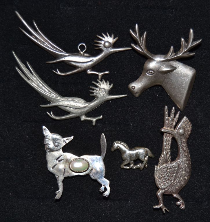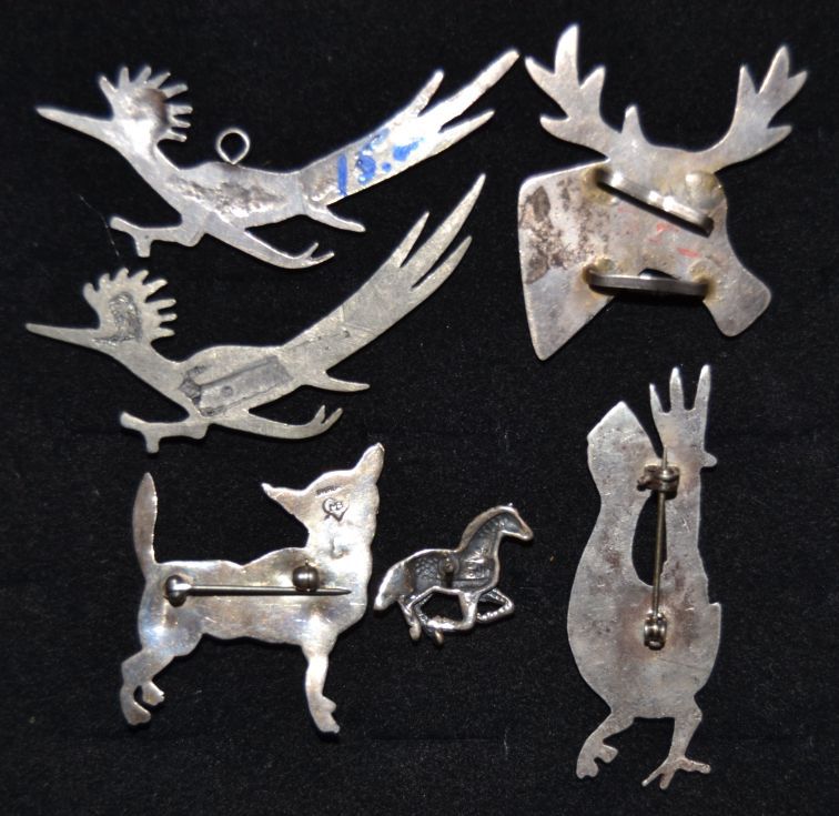 1960s 70s one roadrunner and chihuahua are pins deer head is a bolo one roadrunner is a pendant horse tie tack one roadrunner has no back largest 2"x.75"v
