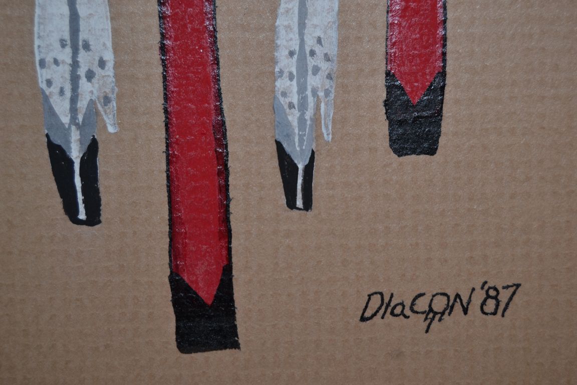 1987 watercolor on hardboard in style of plains signed Diacon 13.25"x8"