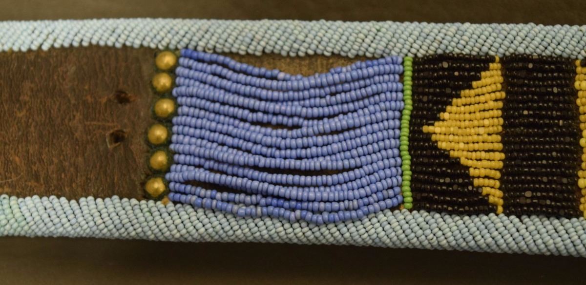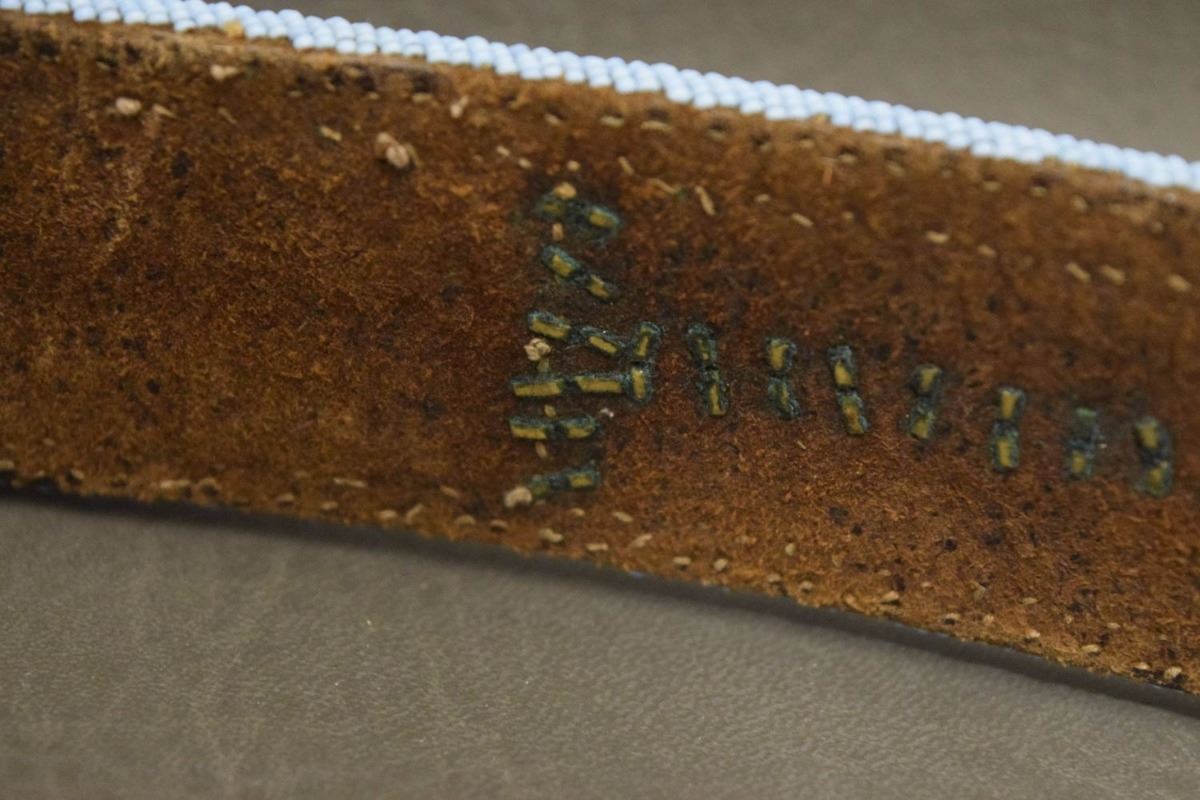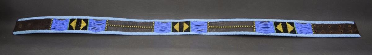 1940's hand beaded geometric and brass tack design on harness leather.  1.75'' x 38''