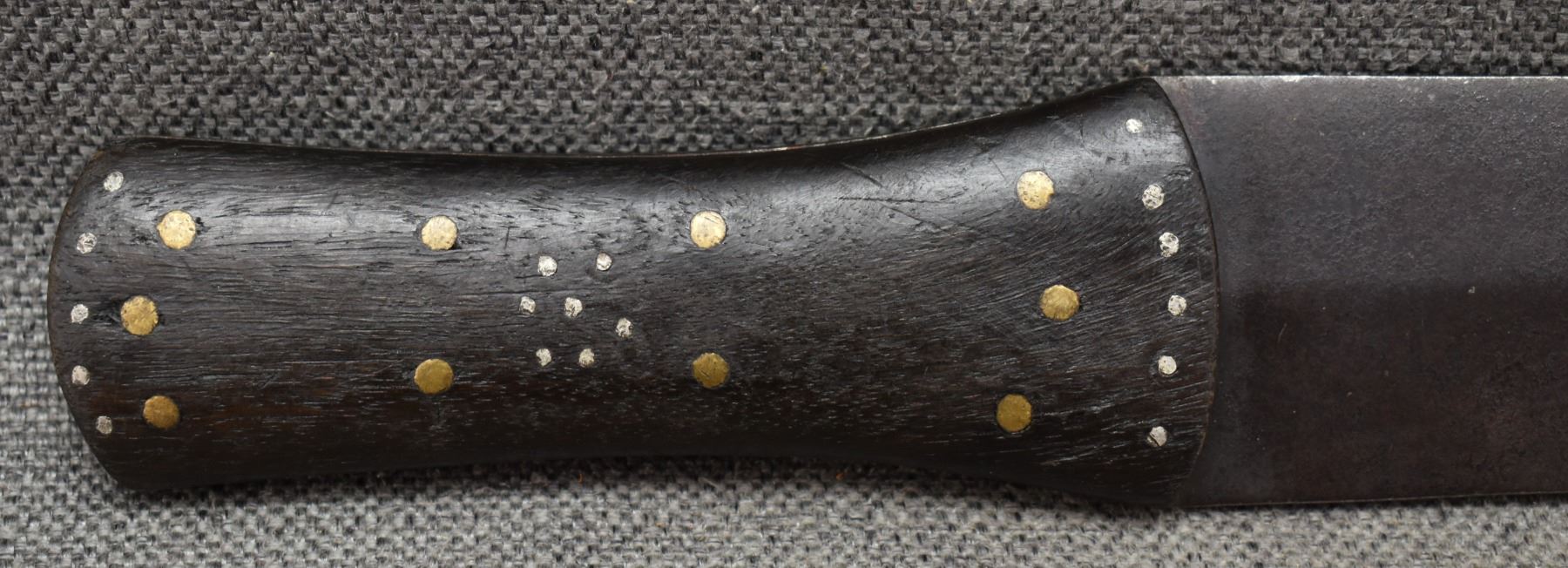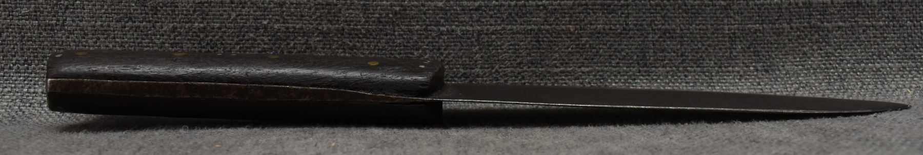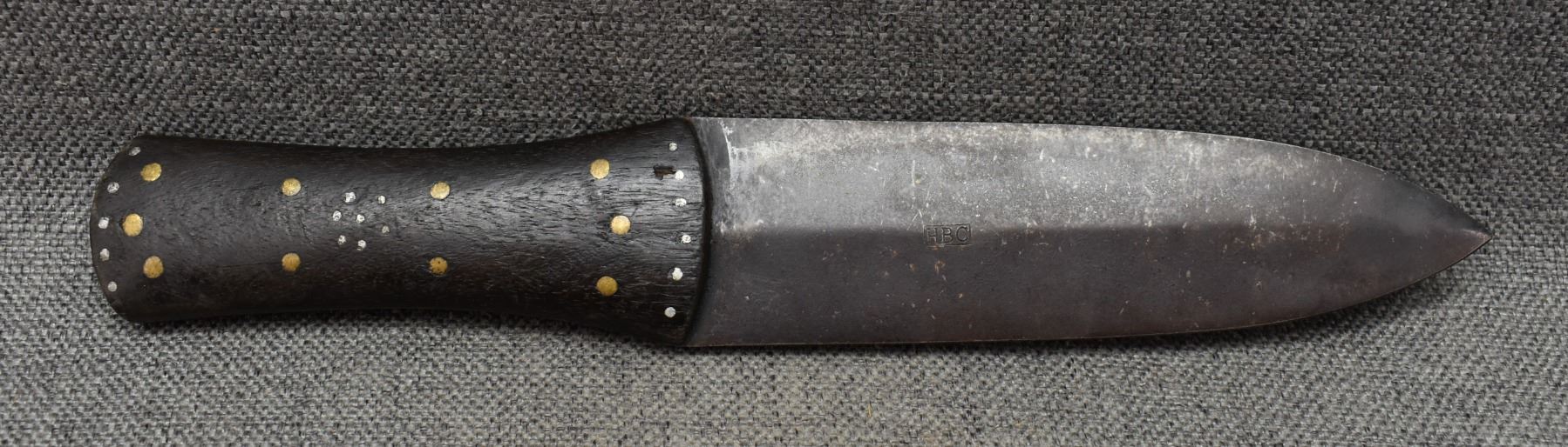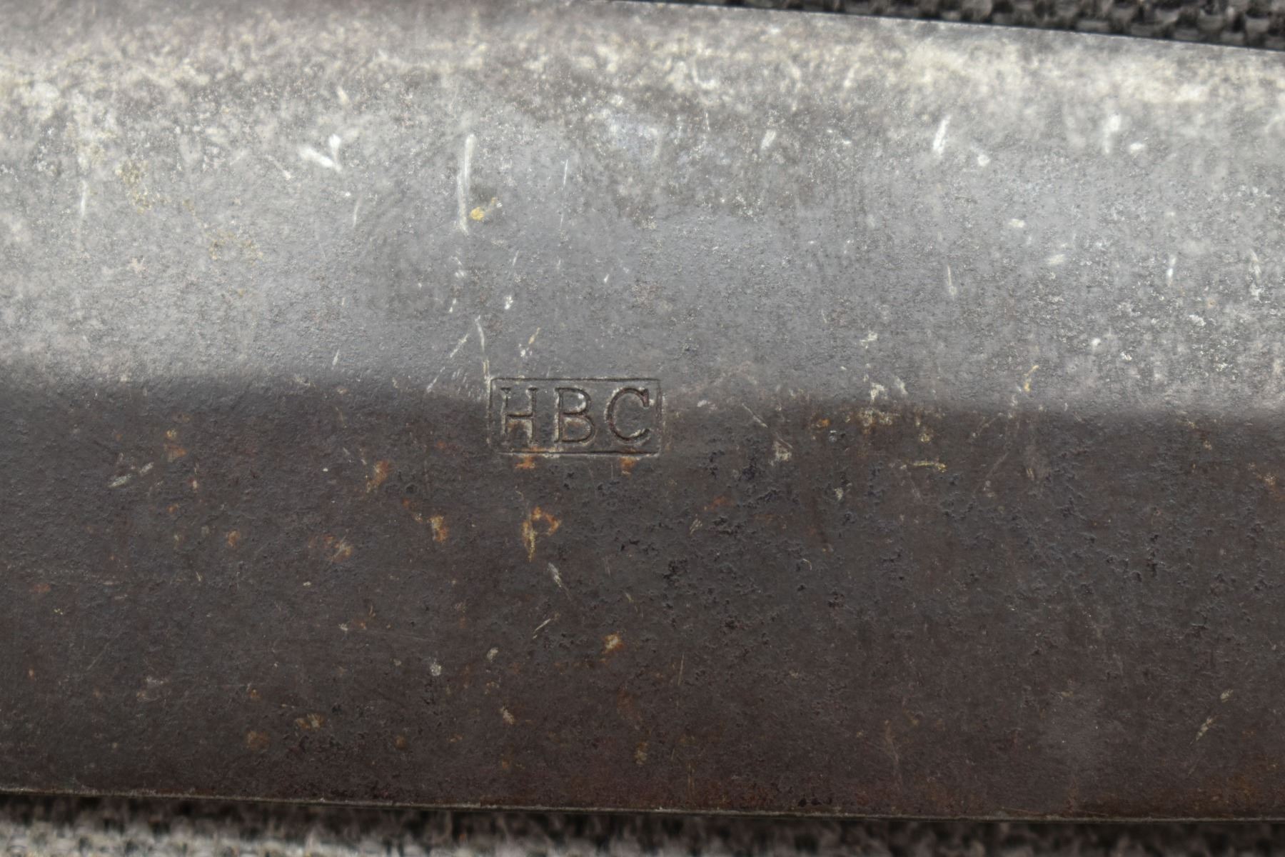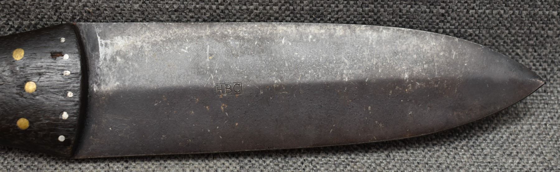 Vintage, steel blade with wooden handle with exposed peg design blade marked HBC 12.5" x 2"