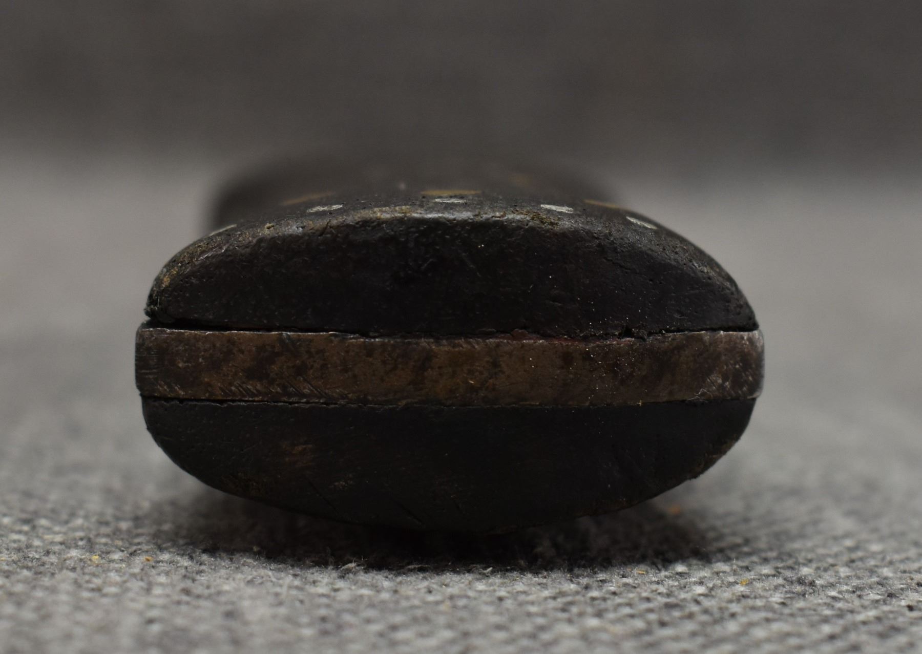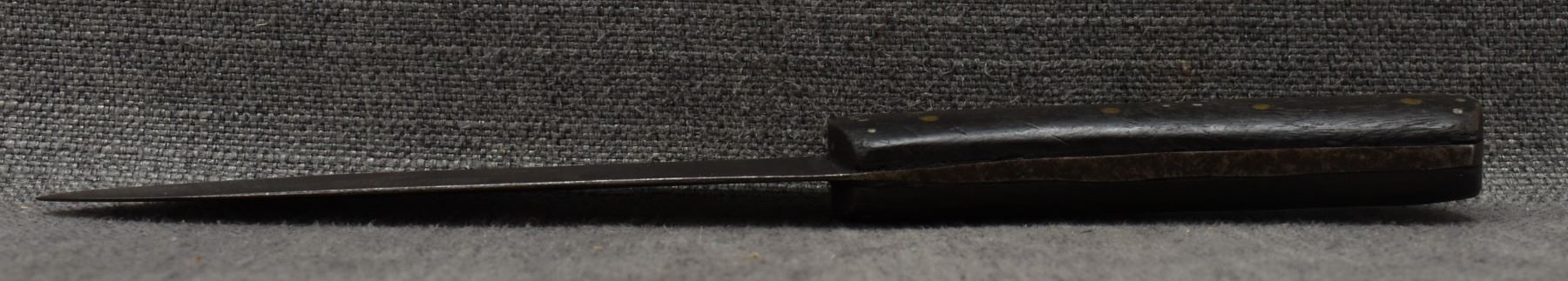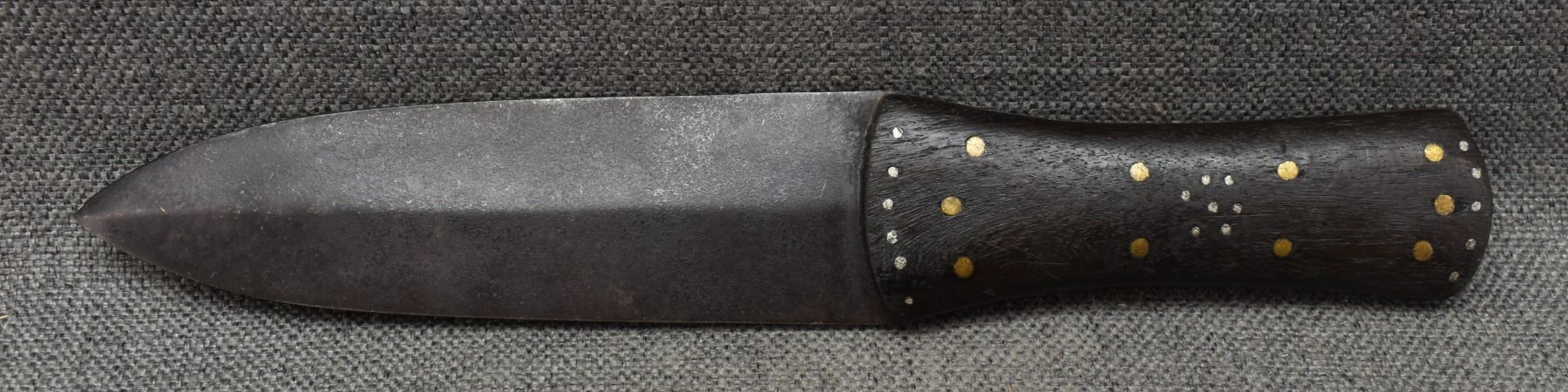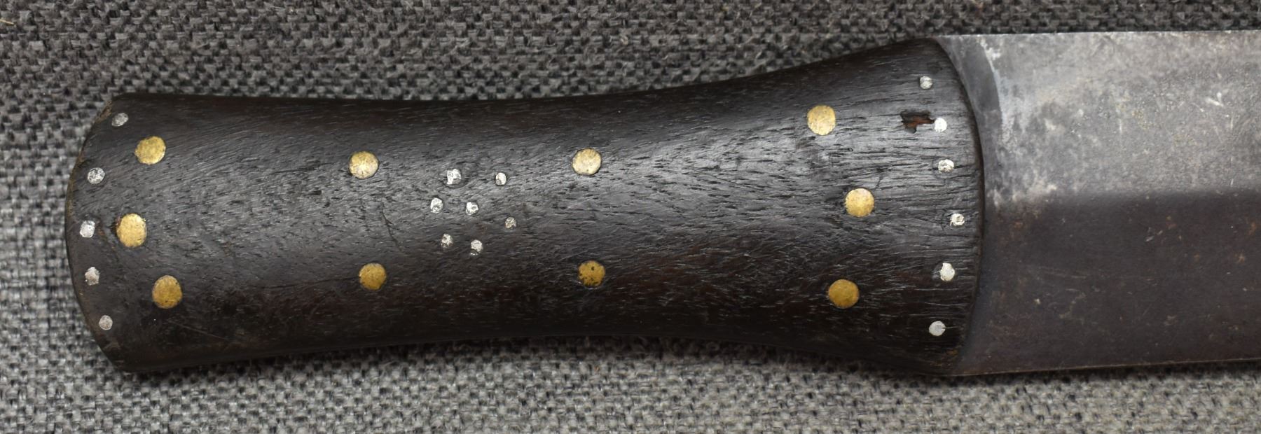 Vintage, steel blade with wooden handle with exposed peg design blade marked HBC 12.5" x 2"