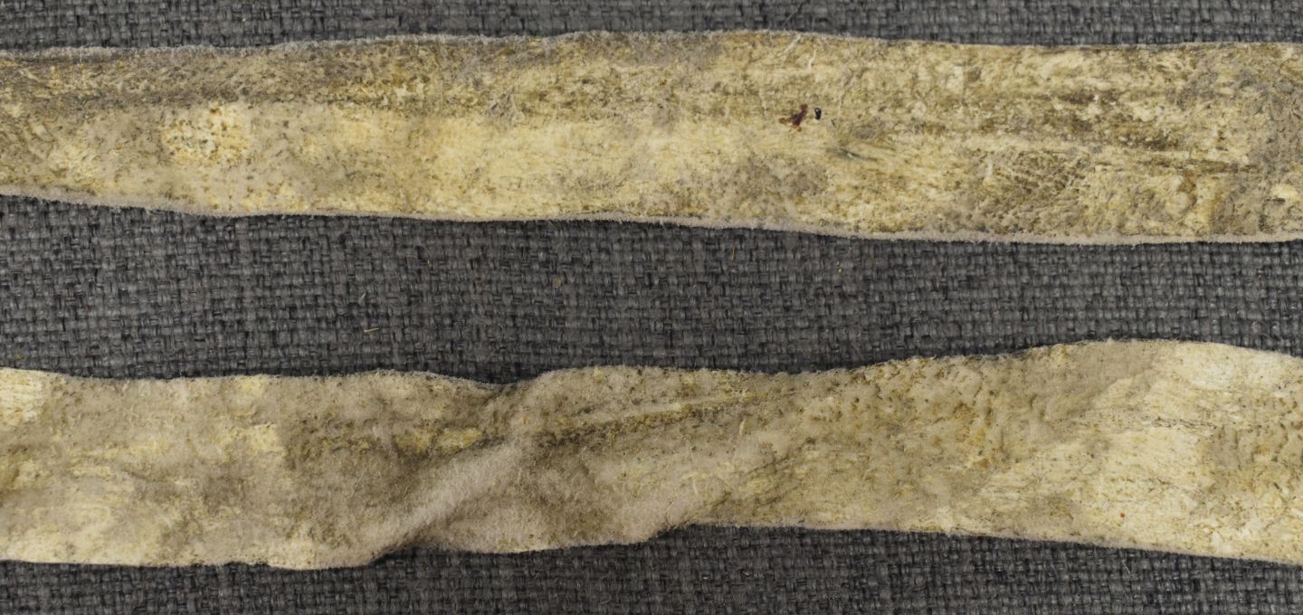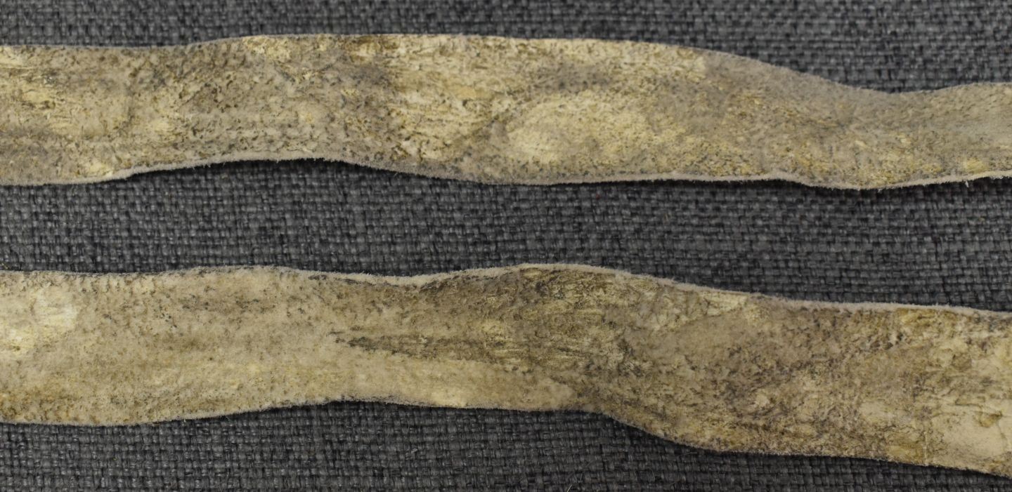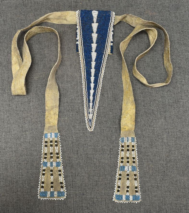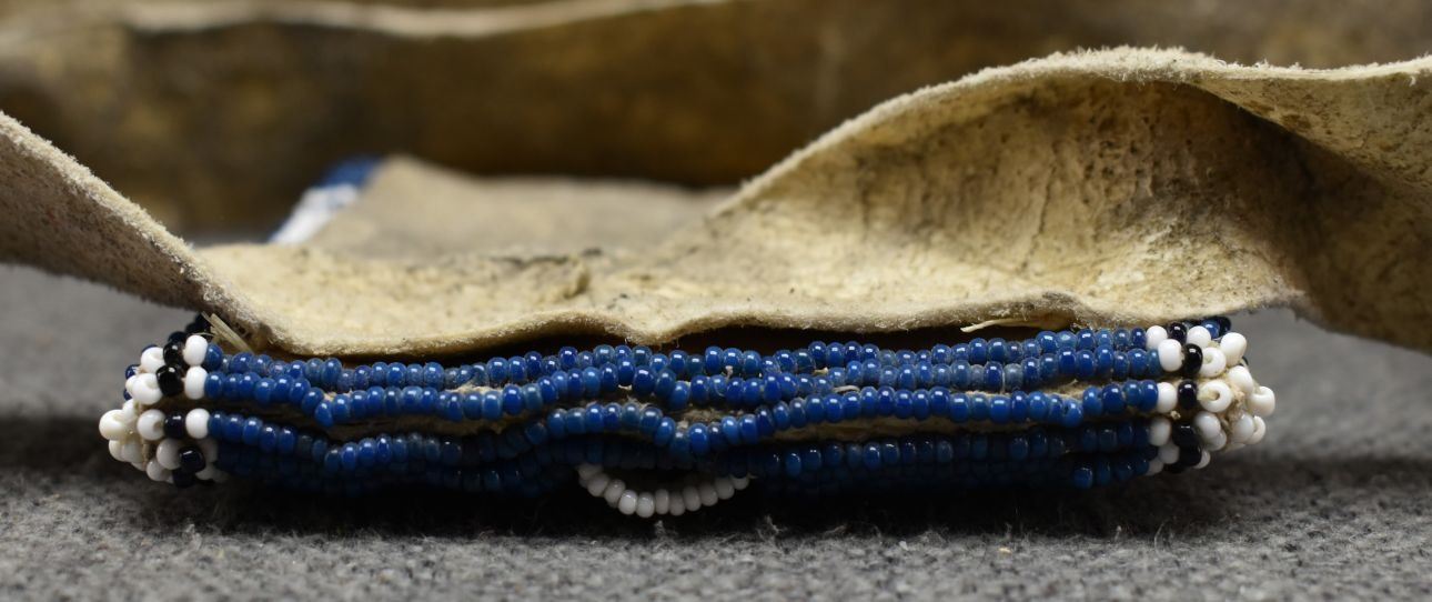20th century beaded design on leather tail bag. 3''m x 10''. Strap 70'' long