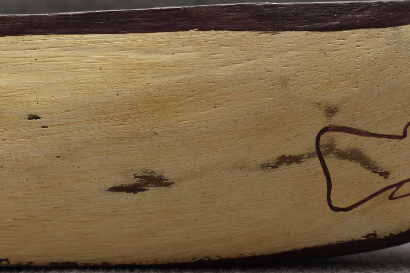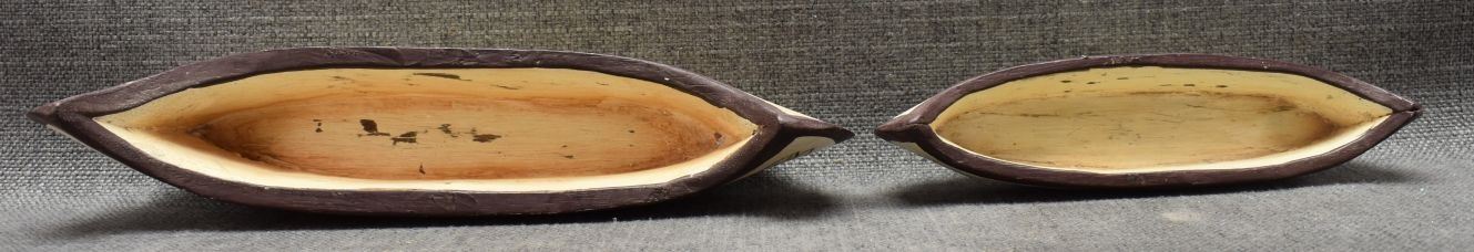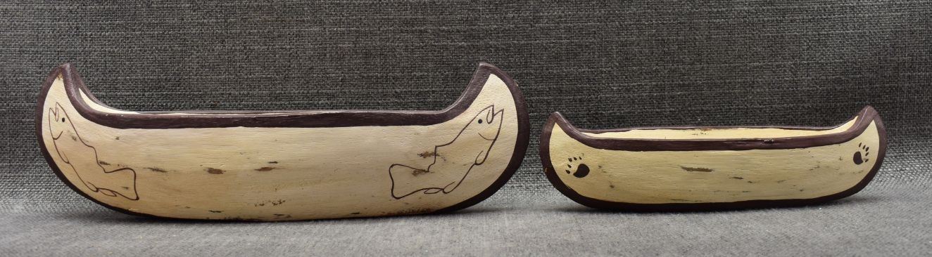 Decorative wood canoes with salmon and bear paws on side. Longest 3.5"x 11.5" x 2.5"