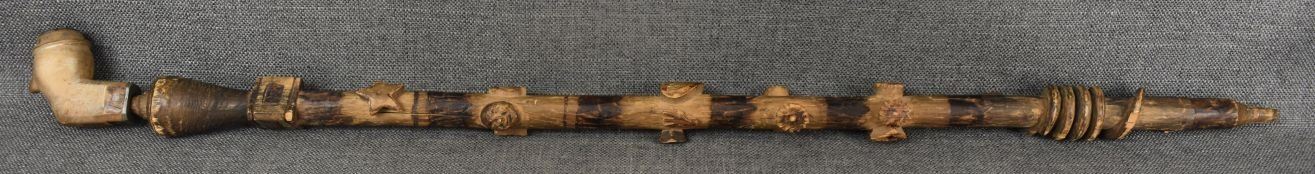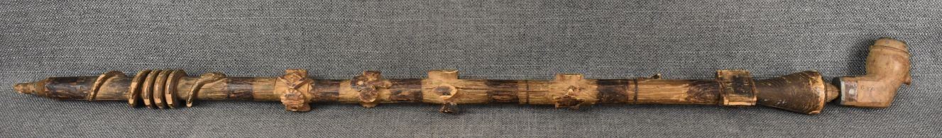 1900's Eastern. Hand carved wooden stem 33'' long and hand carved wood and lead human face pipe bowl. 3'' x 3'' x 1.5''