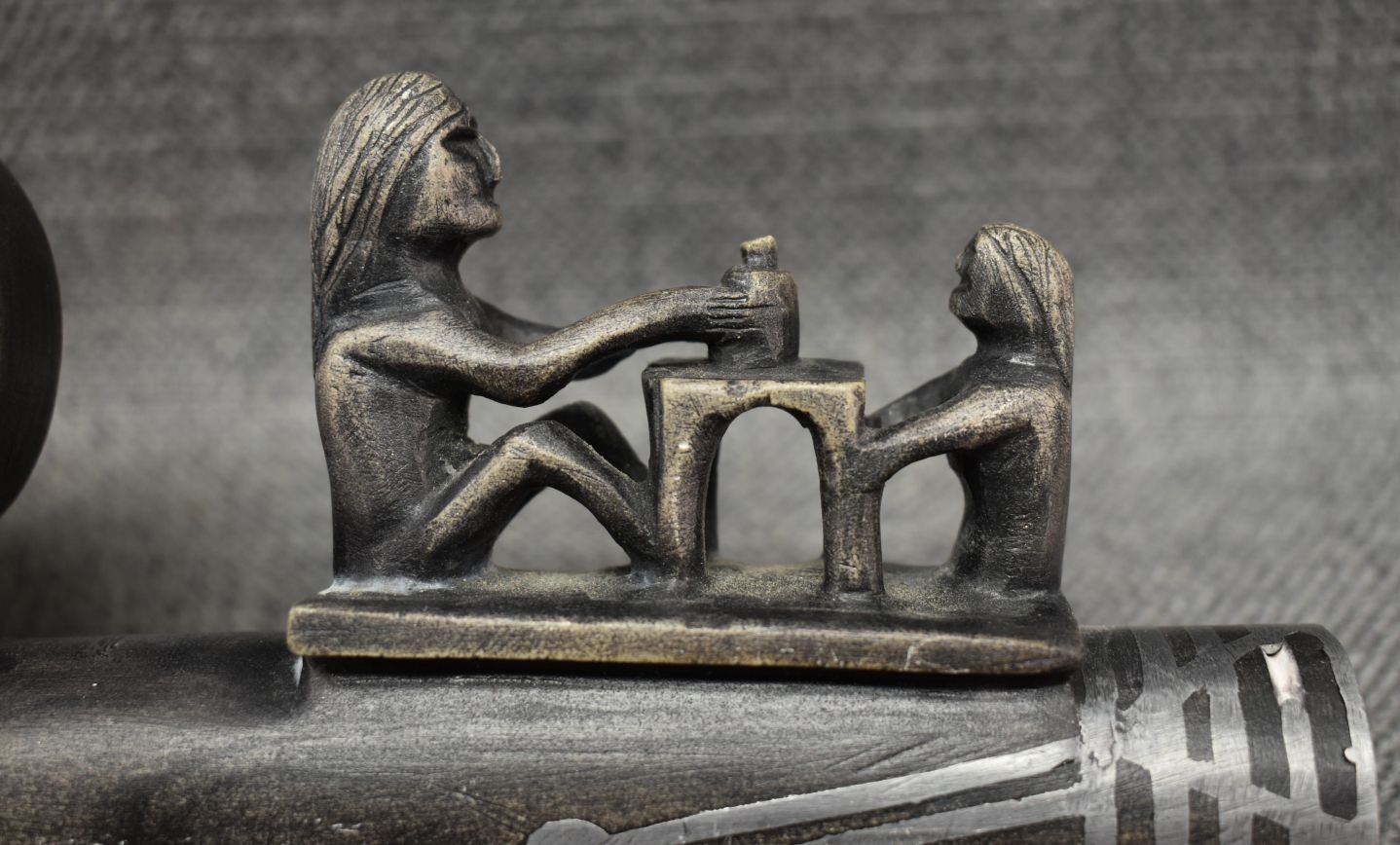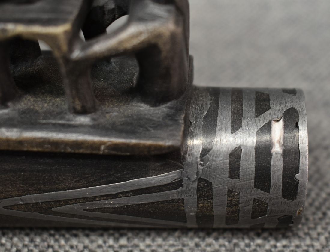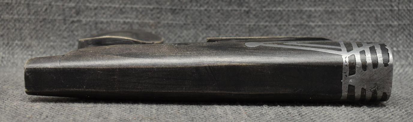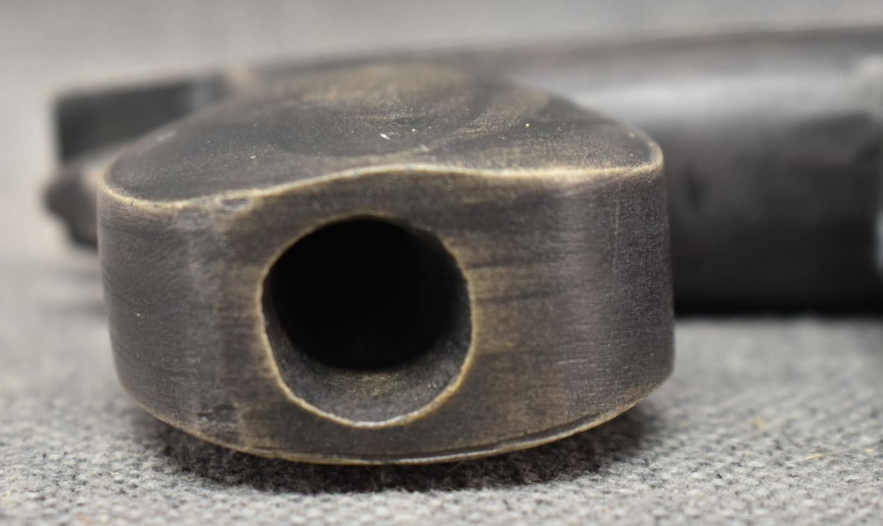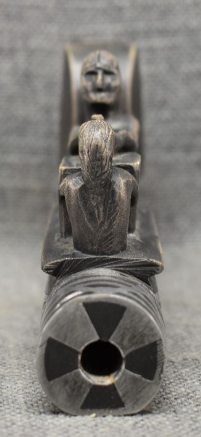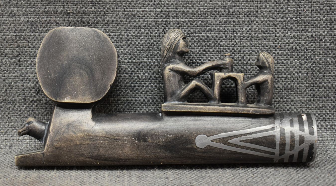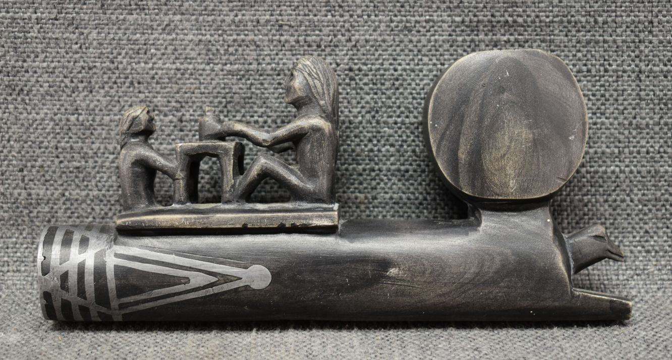 20th century. Caved stone and lead inlay effigy pipe bowl. 3.5'' x 7.5'' x 1.5''