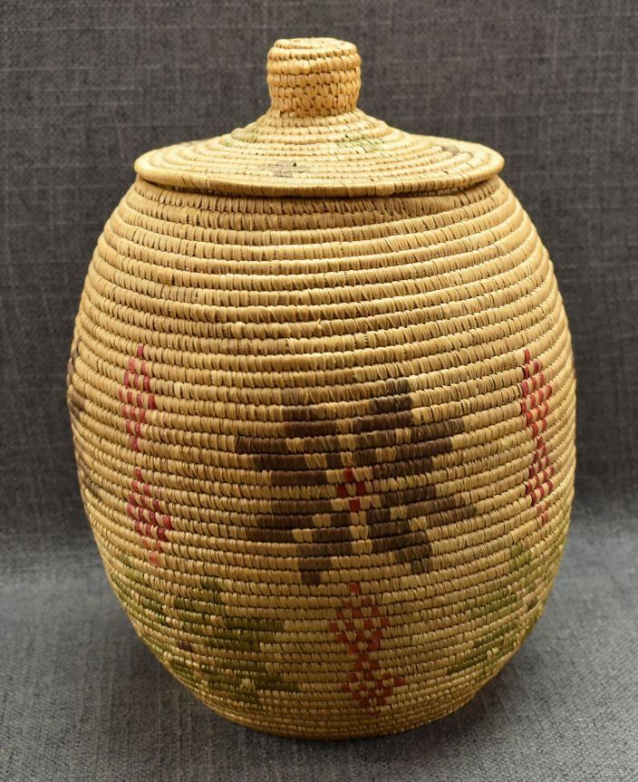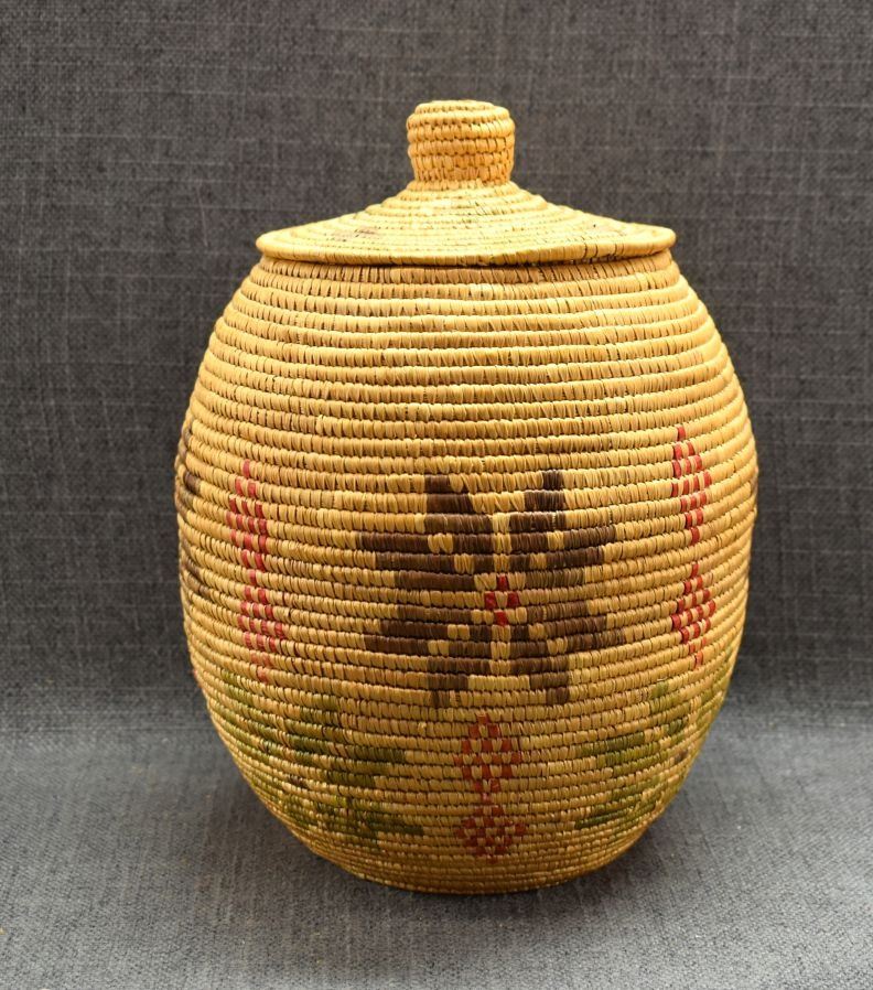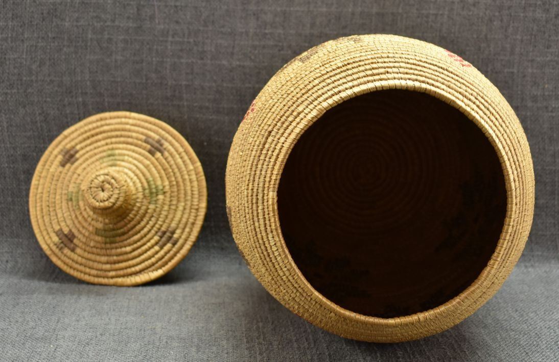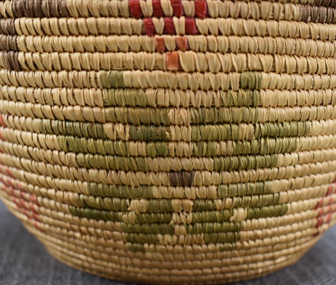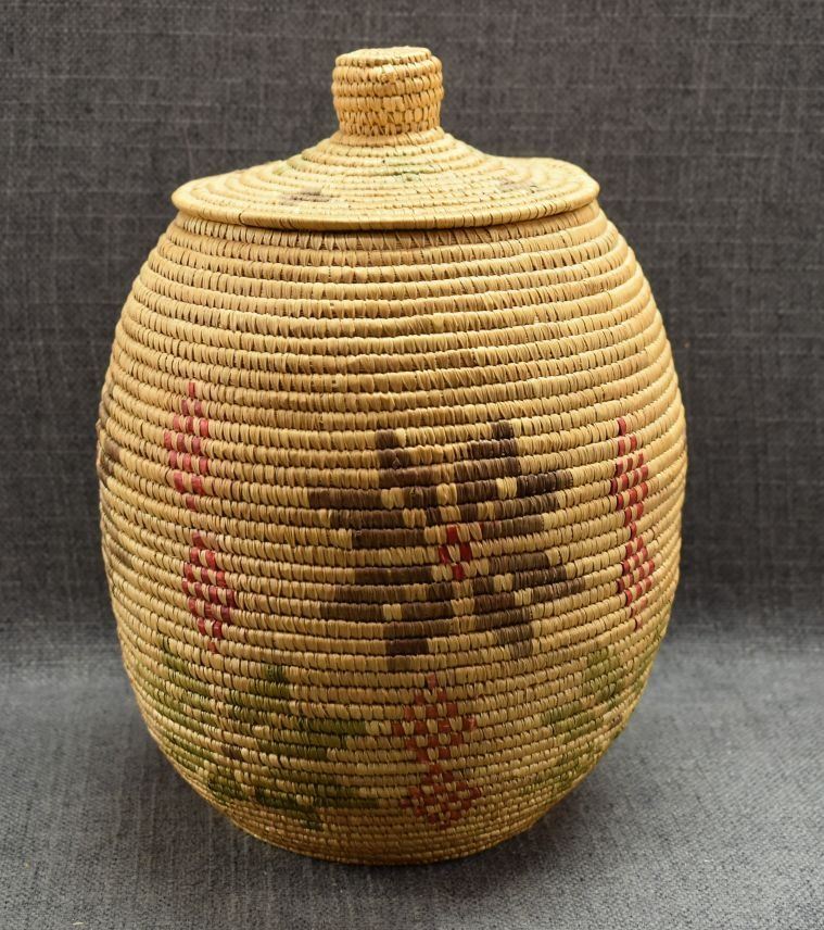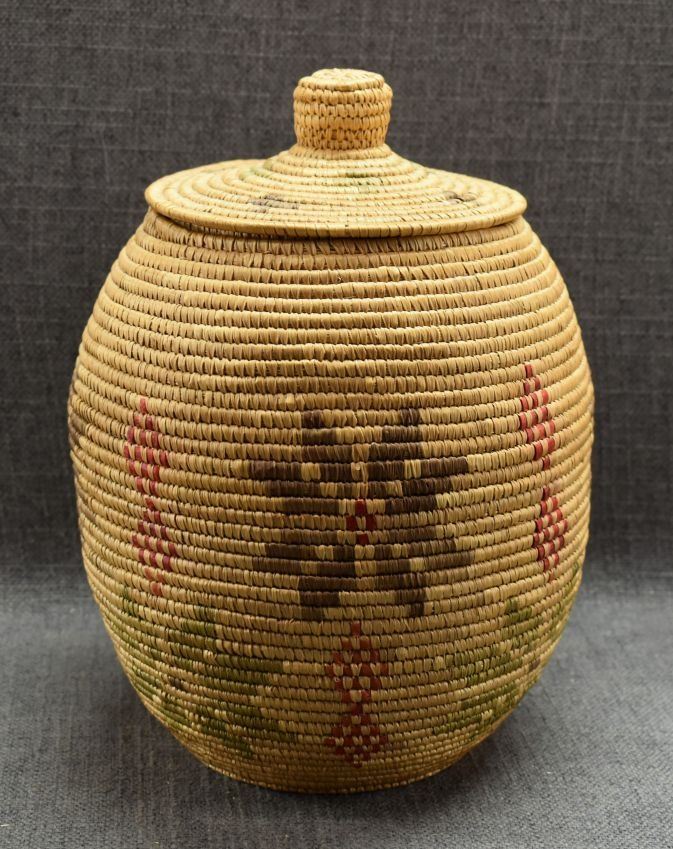 1960's Eskimo. Hand woven polychrome design lidded basket. 10'' x 8''