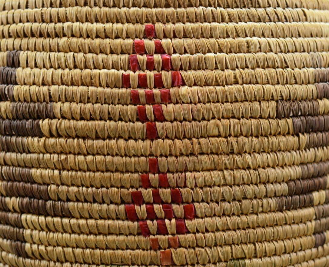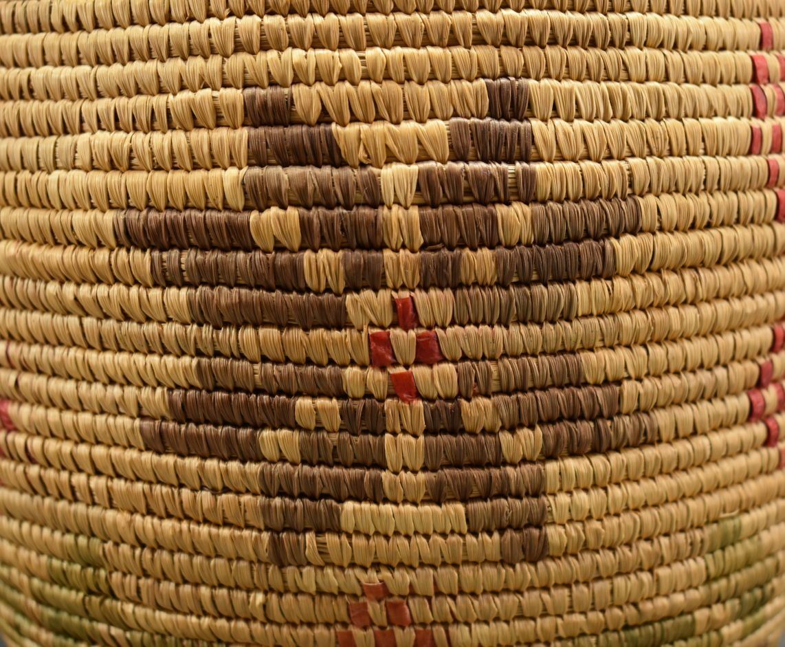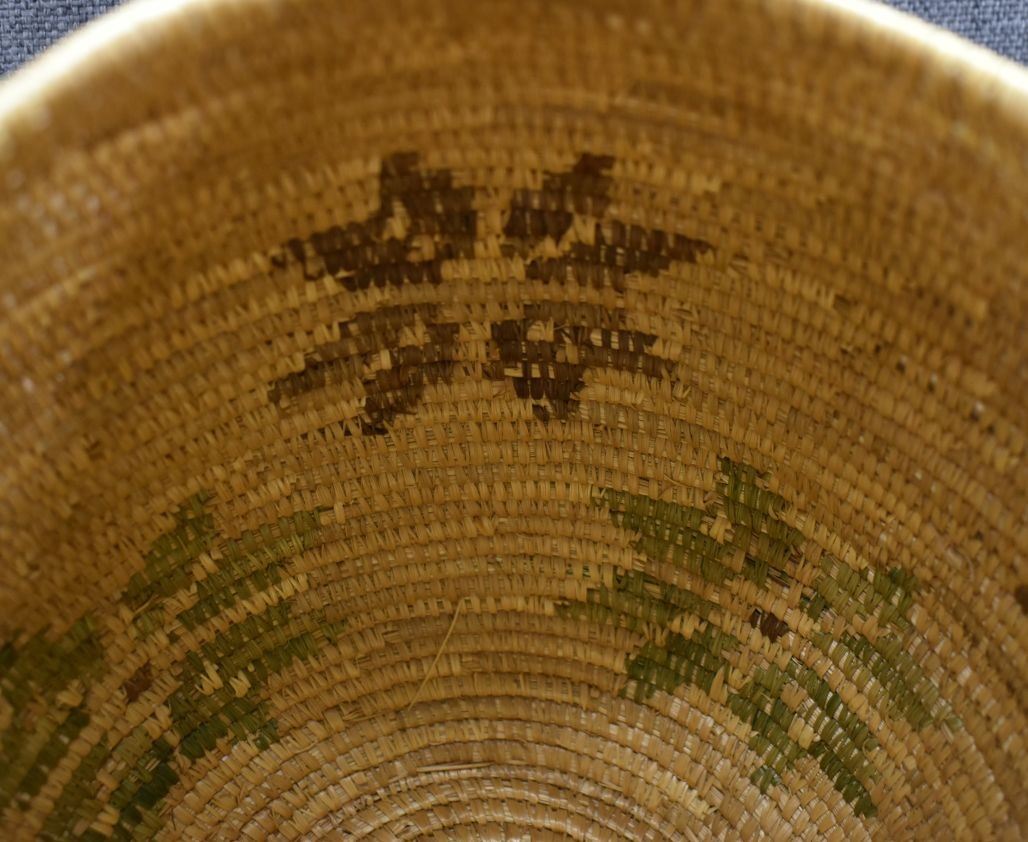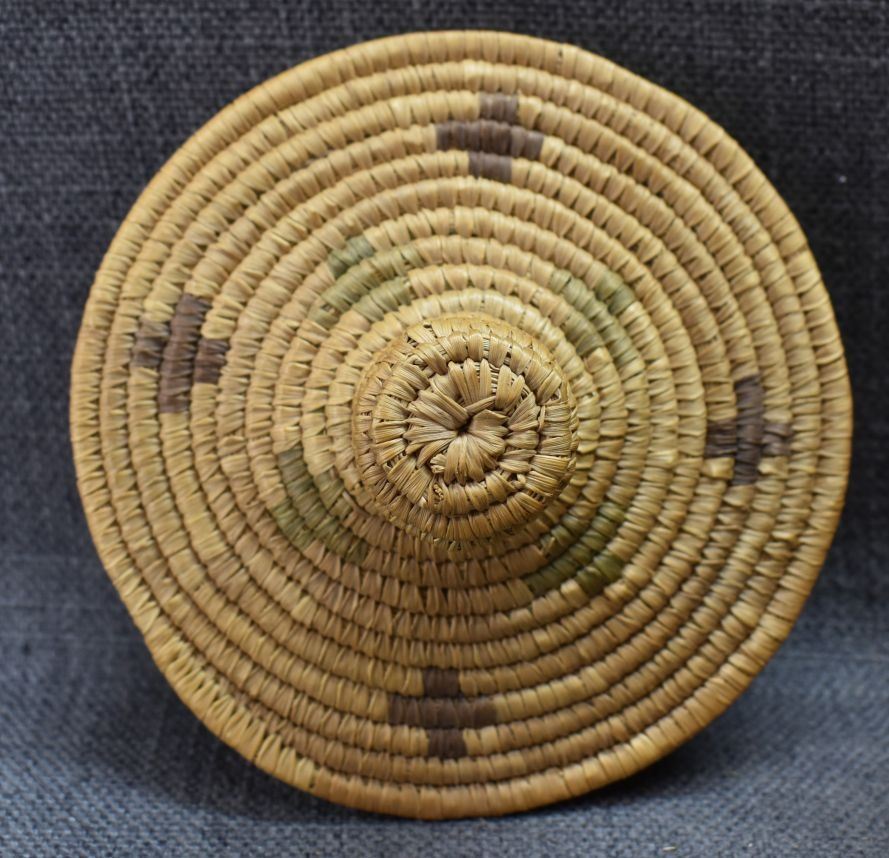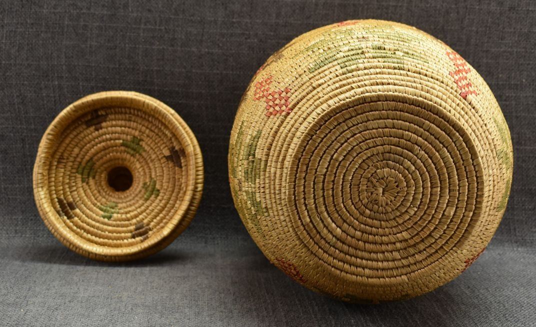 1960's Eskimo. Hand woven polychrome design lidded basket. 10'' x 8''