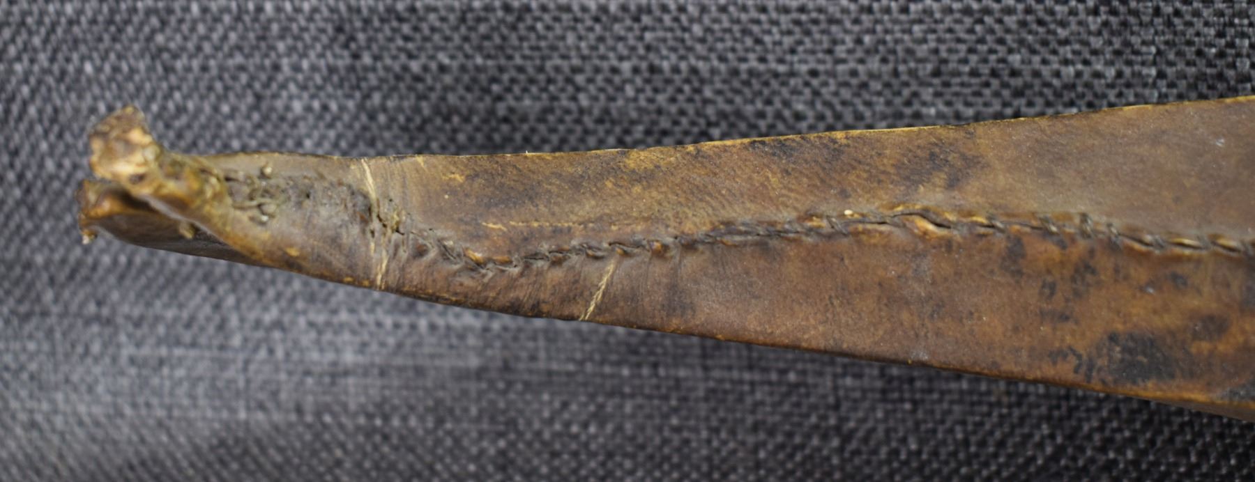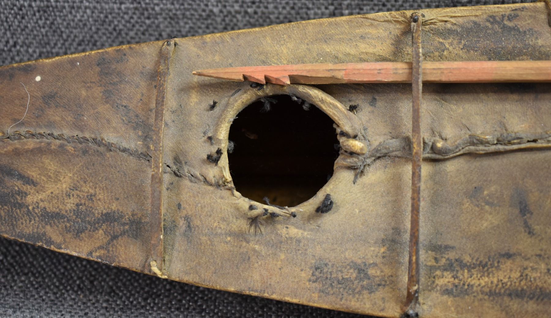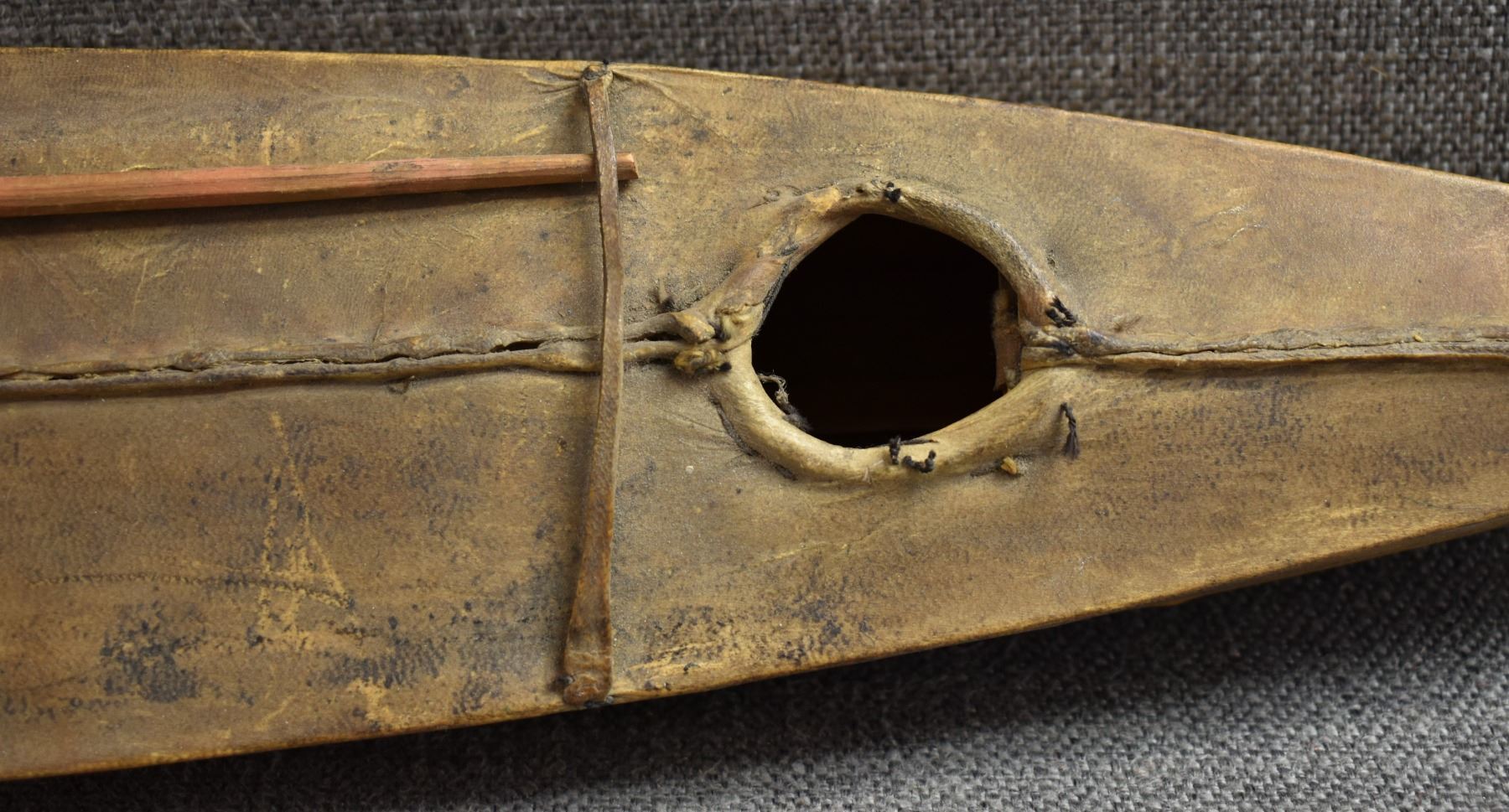 1920s eskimo. hide on wood frame with small harpoon 31" x 2" x 4"