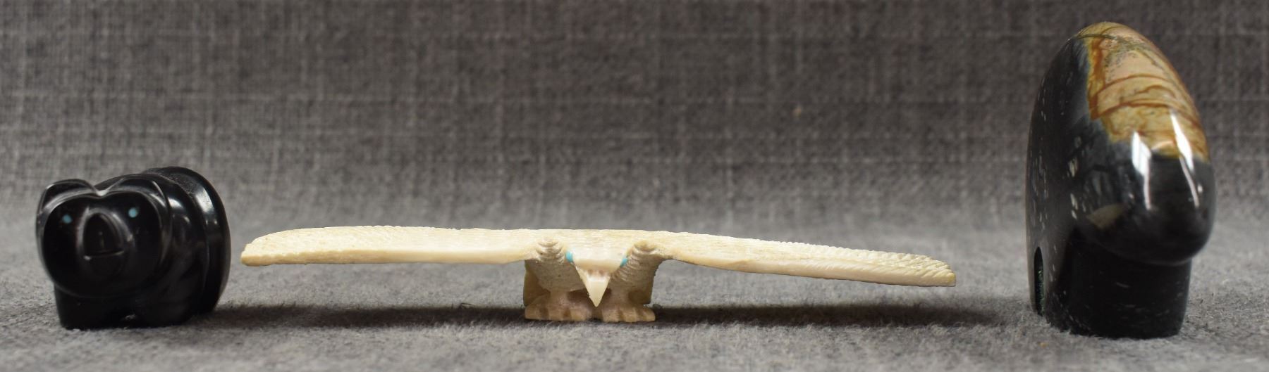 1990's Zuni, hand carved turquoise pipe stone antler and marble fetishes . Largest is 1.5'' x 4'' x 1.5''