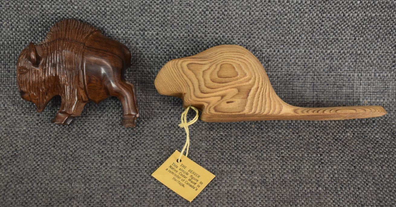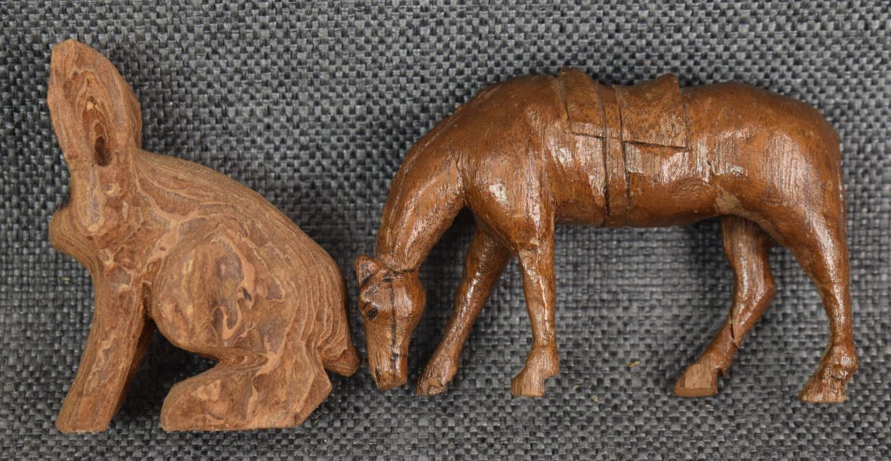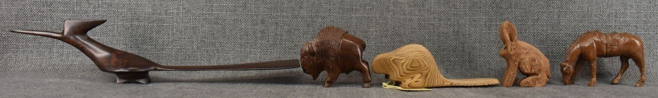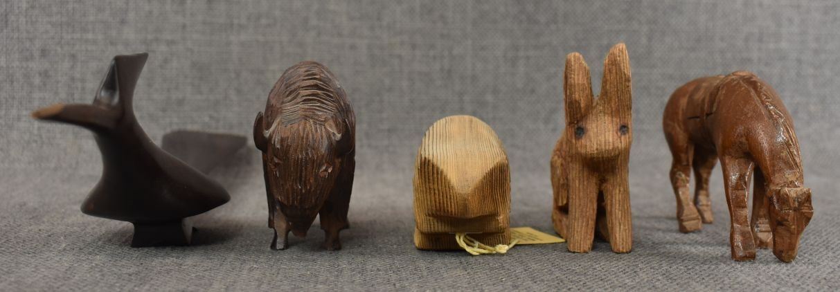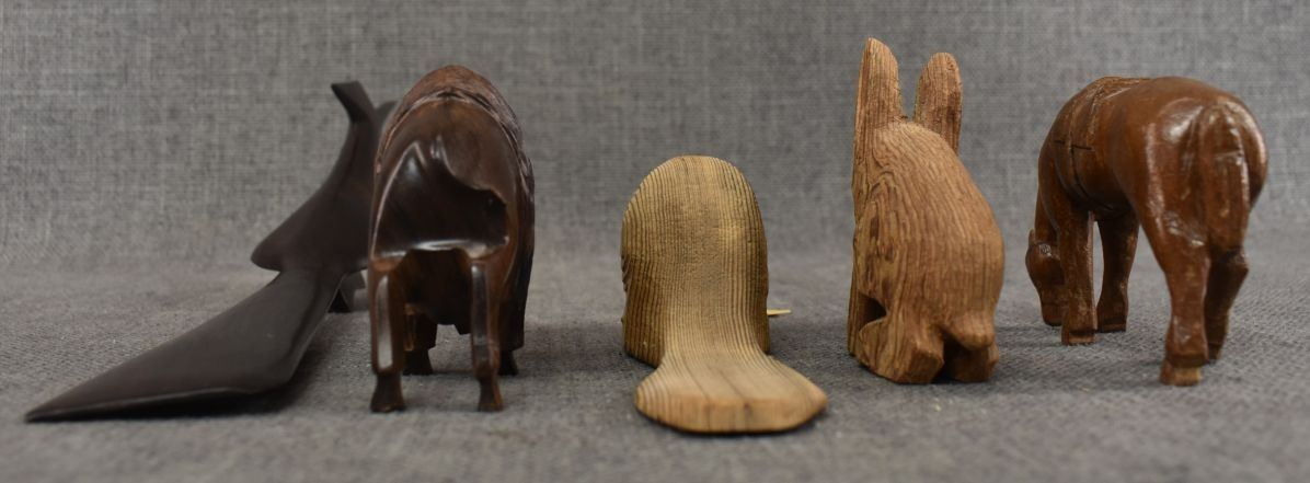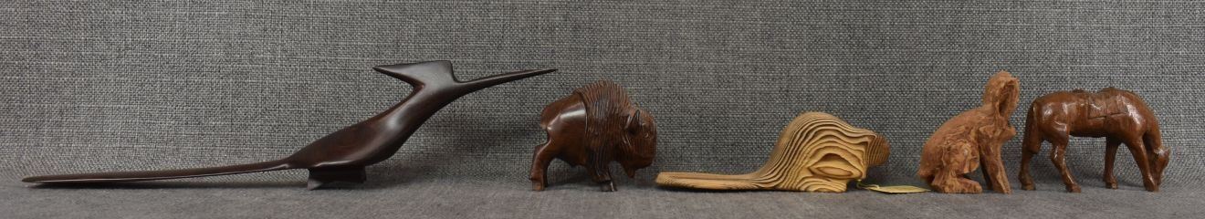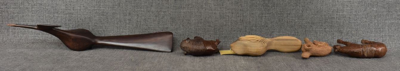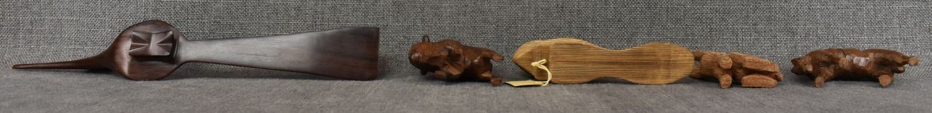 Five wood carvings. Two Seri iron wood carvings. Three decorative carvings. Largest 3" x 13" x 2''