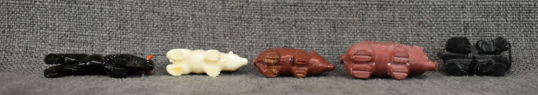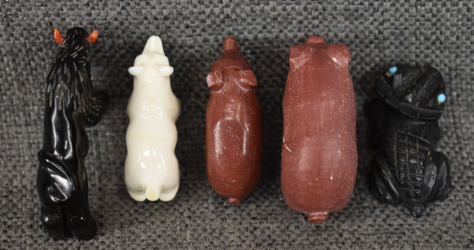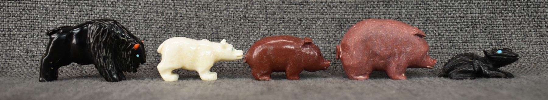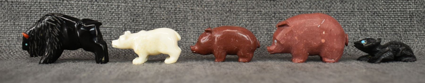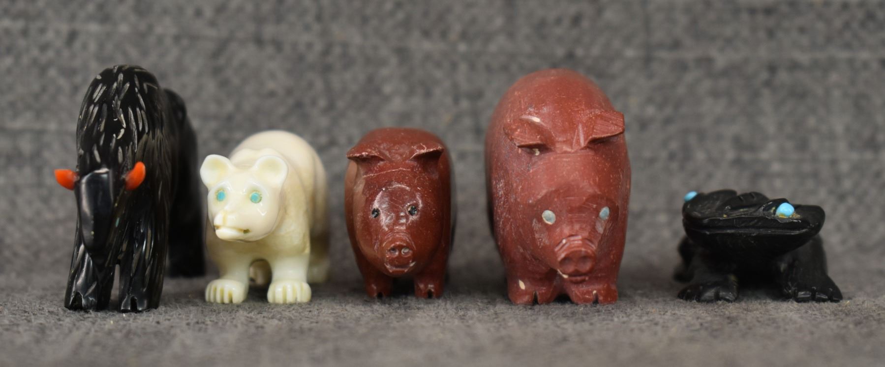 1980's Zuni, carved pipestone pigs, Jett lizard, bone bear and a buffalo. Largest 1.25" x 2.25"